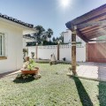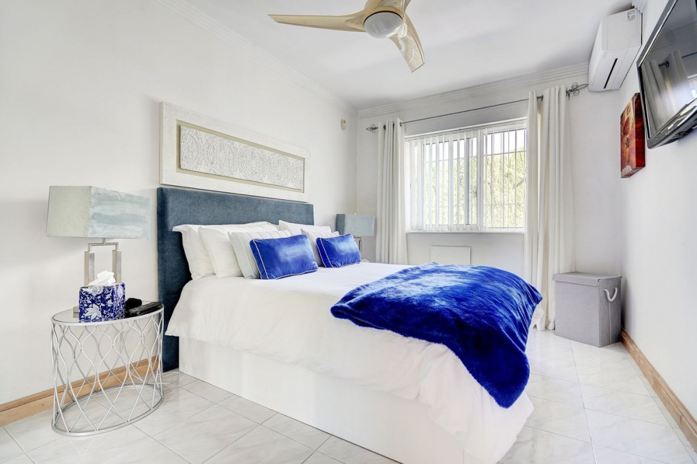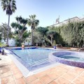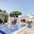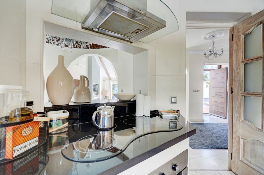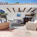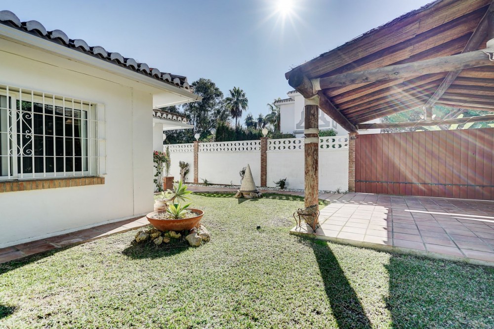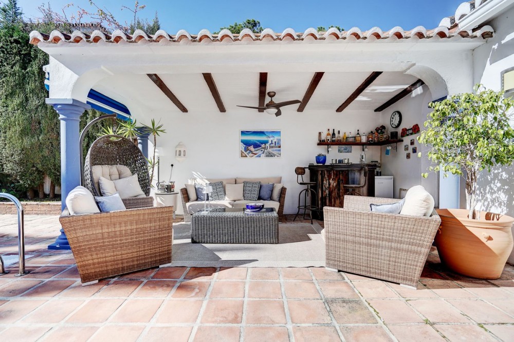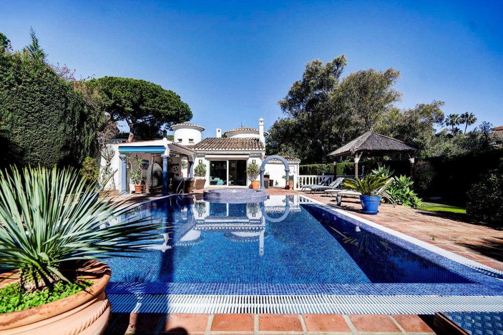 - Luxury One Level Villa in Lower Calahonda Walking Distance to Beach Located in Lower Calahonda in Mijas Costa, this private 3 bedroom villa for sale offers a rare opportunity to own a single-level Andalusian home just a short walk from the beach. Positioned in a quiet cul-de-sac of only three houses, the property sits on a generous 842m² plot and is completely private and not overlooked. Built in 1981 with classic Andalusian architecture, including two distinctive turrets with domed interiors, the villa blends character and charm with a modernised interior. The landscaped garden wraps around the home, framing a stunning 50m² swimming pool with jacuzzi, gazebo and a separate covered bar area — perfect for outdoor living. Inside, the villa features spacious, light-filled rooms with large windows throughout. The split-level lounge is a standout feature, with double-height ceilings, exposed wooden beams and a fireplace, creating a warm yet impressive living space. Large windows frame a picture-postcard view of the garden and pool, filling the room with natural light. The elevated dining area connects directly to the fully fitted modern kitchen via a convenient serving hatch. There are three double bedrooms and two bathrooms, including a generous master suite with ensuite bathroom and an oversized walk-in wardrobe. Outdoor living is where this home truly excels offering total privacy and multiple areas for relaxing and entertaining. The 50m² pool with integrated jacuzzi provides a resort-style feel, while the covered bar and gazebo create shaded spaces for outdoor dining and enjoying the view of the garden. Additional features include a carport with electric gates, alarm system, storage cupboard, electric blinds, air conditioning and fibre optic internet. With the beach reachable in under 10 minutes on foot and all amenities of Calahonda nearby, this villa offers a combination of privacy, space and location that is increasingly difficult to find.