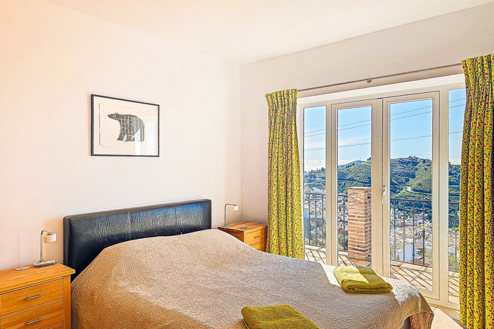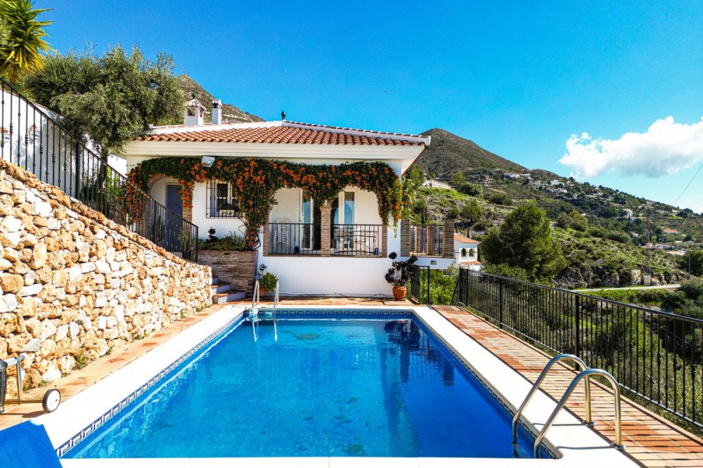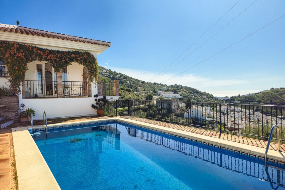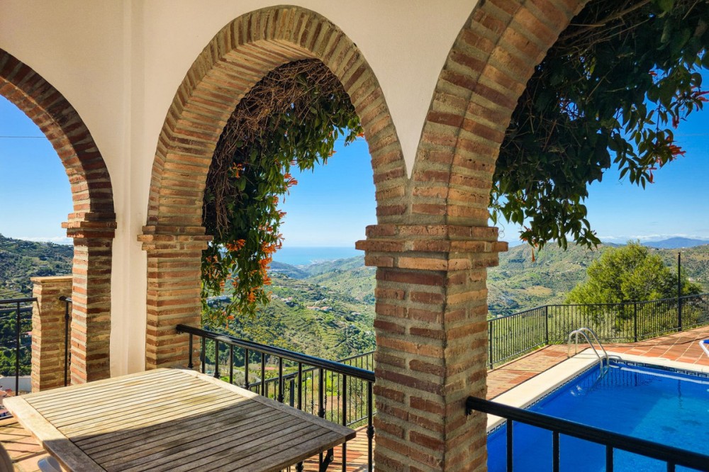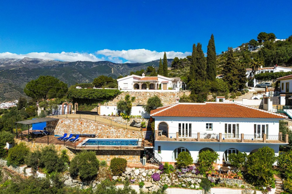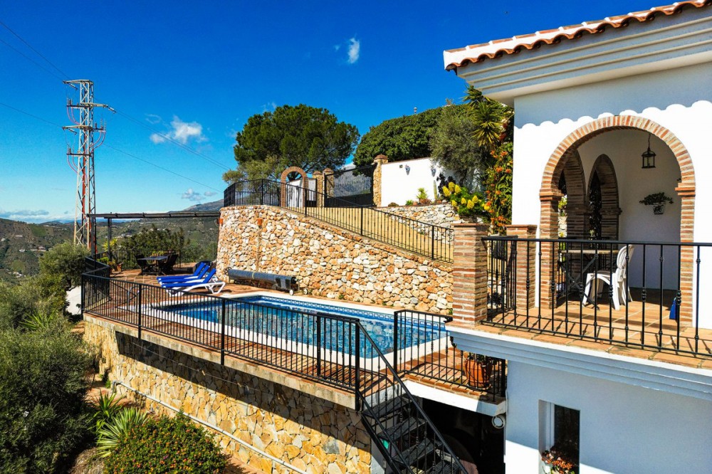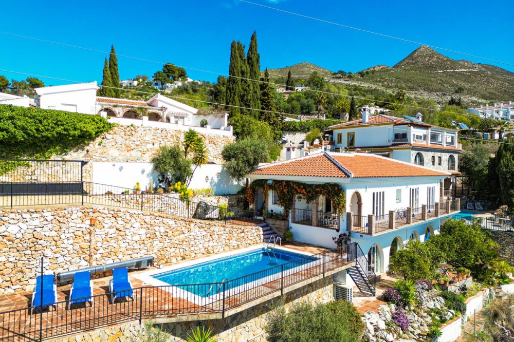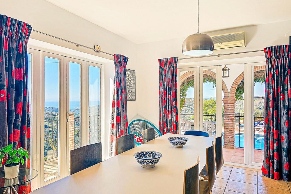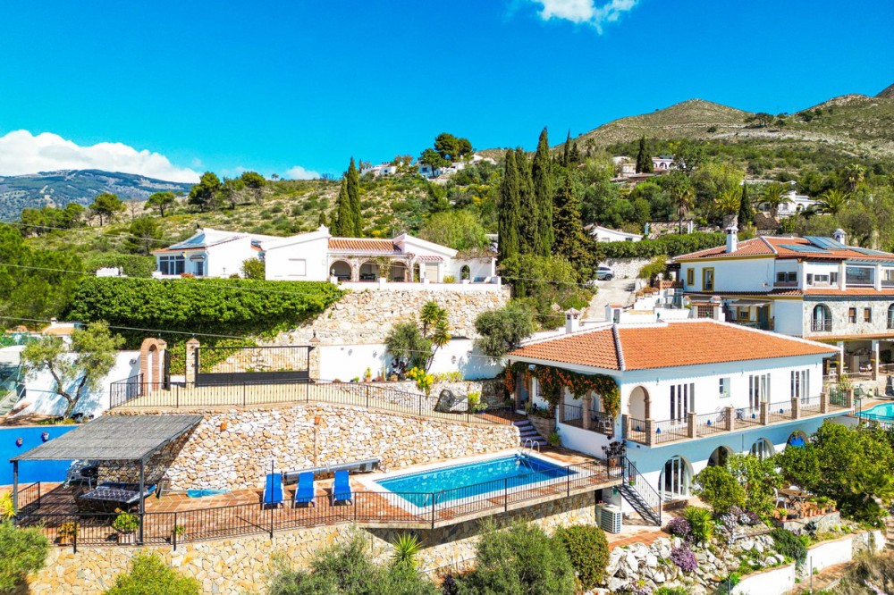 - This beautiful modern villa with 5 bedrooms and 3 bathrooms enjoys an enviable elevated position above the charming white village of Cómpeta, offering sweeping views of the Mediterranean Sea, rolling countryside, and the village rooftops below. Stylish, spacious, and impeccably presented, it is a home ready to move into and immediately enjoy. Access is easy and convenient via fully tarmac roads — no dirt tracks — leading to electrically operated gates that open onto a private driveway with secure off-road parking. From the moment you arrive, the setting and the views create a lasting impression. A welcoming covered terrace sits at the entrance to the villa, while an additional terrace runs the full length of the property, providing generous space to unwind, entertain, or simply soak in the panoramic surroundings. The heated swimming pool is perfectly positioned to take full advantage of the breathtaking views and allows for year-round enjoyment. Spacious sun terraces surround the pool, offering plenty of room for loungers and relaxed gatherings with family and friends. A shaded dining area provides the ideal spot for long, leisurely al fresco meals during the summer months. The pool and terrace areas are wonderfully private, creating a peaceful outdoor haven. The entire plot is fully fenced, ensuring both privacy and security for children and pets. Inside, the villa opens into a bright and inviting open-plan lounge and dining area. Large bi-fold patio doors frame the views beautifully and flood the space with natural light, seamlessly connecting indoor and outdoor living. Air conditioning and a free-standing log burner ensure comfort throughout the year. The fully fitted kitchen, accessed through a charming brick archway, is both practical and stylish. A further archway leads to the hallway and a separate utility room complete with washing machine, dryer, and additional storage space. The accommodation in the main villa includes a spacious master bedroom (4.4m x 4.4m) with bi-fold patio doors, fitted wardrobes, air conditioning, and an en-suite shower room (2.6m x 1.3m). Bedroom 2 (3.7m x 3.4m) also features bi-fold doors, fitted wardrobes, and air conditioning. Bedrooms 3 (3.1m x 2.4m) and 4 (3.0m x 3.0m), both currently arranged as twin rooms, are fitted with air conditioning. A well-appointed family shower room (2.6m x 1.8m) completes the main living space. The separate guest apartment, accessed via steps from the pool terrace, offers privacy and flexibility for visiting family, friends, or rental opportunities. Its full-length terrace, bordered by mature citrus trees and Mediterranean planting, enjoys the same spectacular sea and village views. Inside, the apartment features an open-plan kitchen and dining area with a lounge subtly divided by a bookcase (3.5m x 6.5m). Glazed patio doors and a large floor-to-ceiling window fill the space with natural light. There is also a double bedroom (2.8m x 3.2m) with patio doors opening onto the terrace, and a shower room (1.9m x 1.5m). Whether you are searching for a comfortable permanent residence, a stylish holiday escape, or a ready-to-go rental investment, this exceptional villa offers space, privacy, and breathtaking views in one of the most desirable locations above Cómpeta.