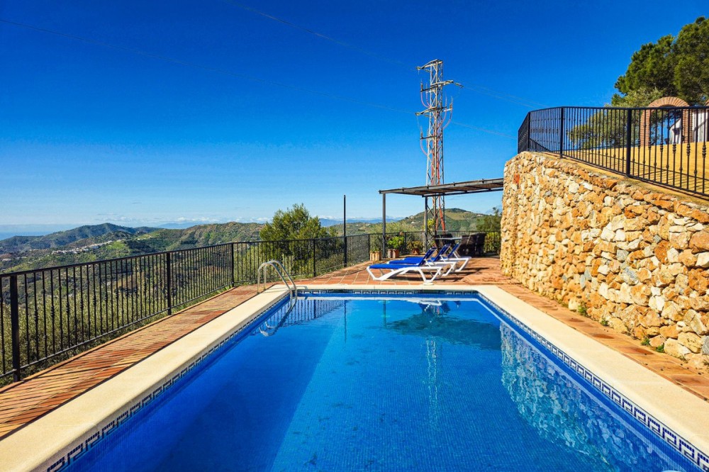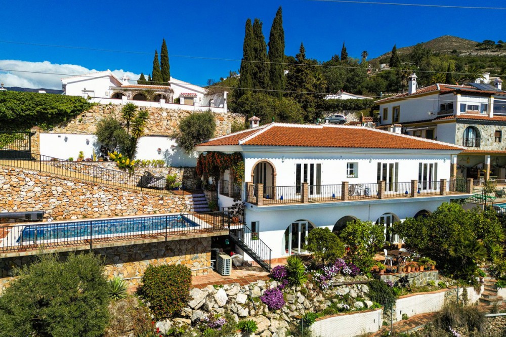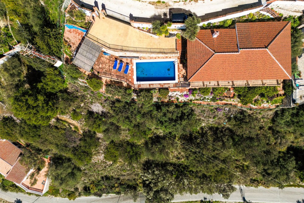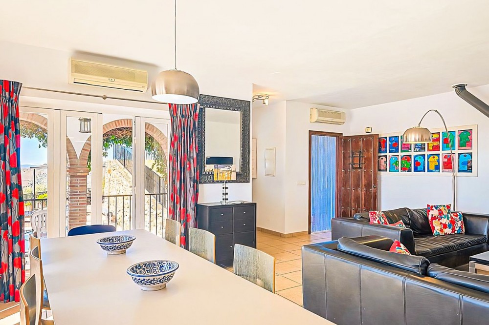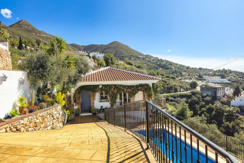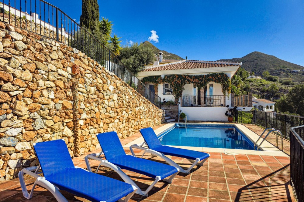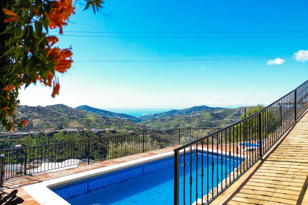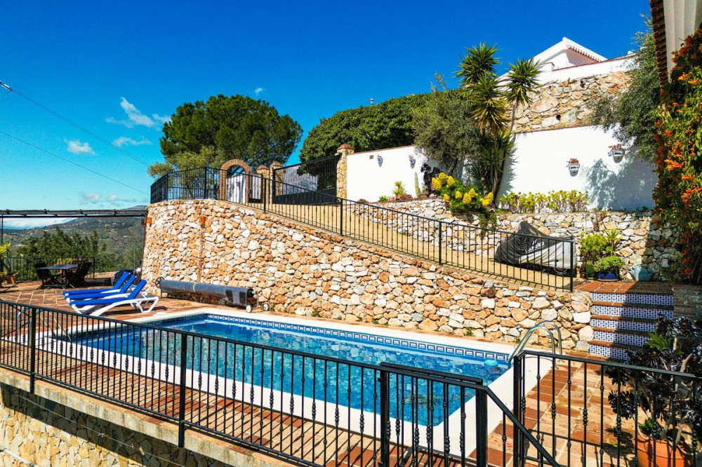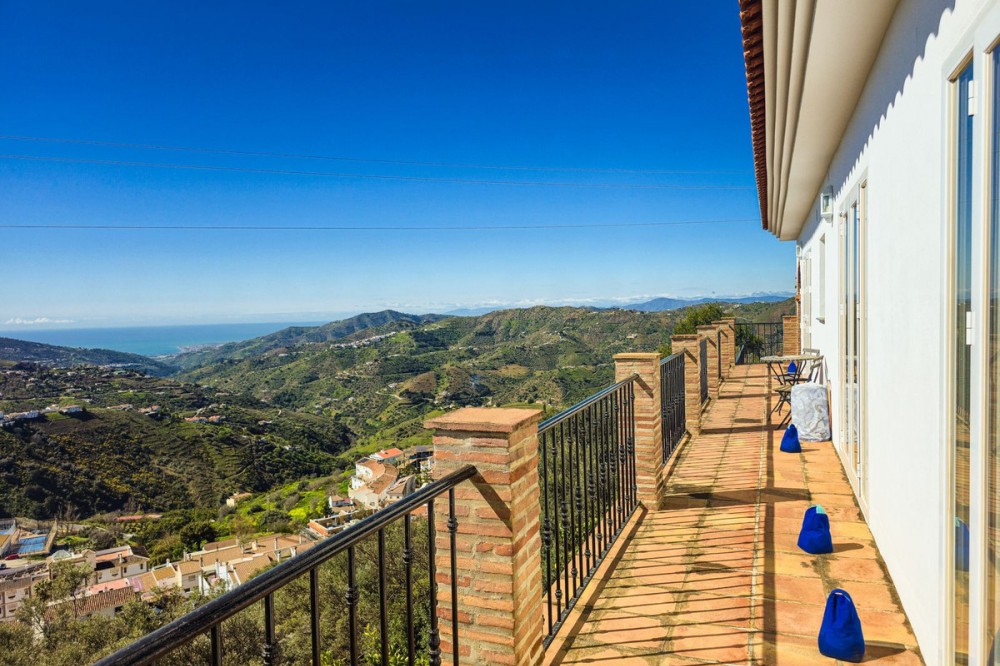 - This beautiful modern villa with 5 bedrooms and 3 bathrooms enjoys an enviable elevated position above the charming white village of Cómpeta, offering sweeping views of the Mediterranean Sea, rolling countryside, and the village rooftops below. Stylish, spacious, and impeccably presented, it is a home ready to move into and immediately enjoy. Access is easy and convenient via fully tarmac roads — no dirt tracks — leading to electrically operated gates that open onto a private driveway with secure off-road parking. From the moment you arrive, the setting and the views create a lasting impression. A welcoming covered terrace sits at the entrance to the villa, while an additional terrace runs the full length of the property, providing generous space to unwind, entertain, or simply soak in the panoramic surroundings. The heated swimming pool is perfectly positioned to take full advantage of the breathtaking views and allows for year-round enjoyment. Spacious sun terraces surround the pool, offering plenty of room for loungers and relaxed gatherings with family and friends. A shaded dining area provides the ideal spot for long, leisurely al fresco meals during the summer months. The pool and terrace areas are wonderfully private, creating a peaceful outdoor haven. The entire plot is fully fenced, ensuring both privacy and security for children and pets. Inside, the villa opens into a bright and inviting open-plan lounge and dining area. Large bi-fold patio doors frame the views beautifully and flood the space with natural light, seamlessly connecting indoor and outdoor living. Air conditioning and a free-standing log burner ensure comfort throughout the year. The fully fitted kitchen, accessed through a charming brick archway, is both practical and stylish. A further archway leads to the hallway and a separate utility room complete with washing machine, dryer, and additional storage space. The accommodation in the main villa includes a spacious master bedroom (4.4m x 4.4m) with bi-fold patio doors, fitted wardrobes, air conditioning, and an en-suite shower room (2.6m x 1.3m). Bedroom 2 (3.7m x 3.4m) also features bi-fold doors, fitted wardrobes, and air conditioning. Bedrooms 3 (3.1m x 2.4m) and 4 (3.0m x 3.0m), both currently arranged as twin rooms, are fitted with air conditioning. A well-appointed family shower room (2.6m x 1.8m) completes the main living space. The separate guest apartment, accessed via steps from the pool terrace, offers privacy and flexibility for visiting family, friends, or rental opportunities. Its full-length terrace, bordered by mature citrus trees and Mediterranean planting, enjoys the same spectacular sea and village views. Inside, the apartment features an open-plan kitchen and dining area with a lounge subtly divided by a bookcase (3.5m x 6.5m). Glazed patio doors and a large floor-to-ceiling window fill the space with natural light. There is also a double bedroom (2.8m x 3.2m) with patio doors opening onto the terrace, and a shower room (1.9m x 1.5m). Whether you are searching for a comfortable permanent residence, a stylish holiday escape, or a ready-to-go rental investment, this exceptional villa offers space, privacy, and breathtaking views in one of the most desirable locations above Cómpeta.