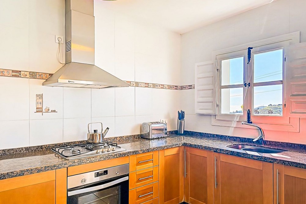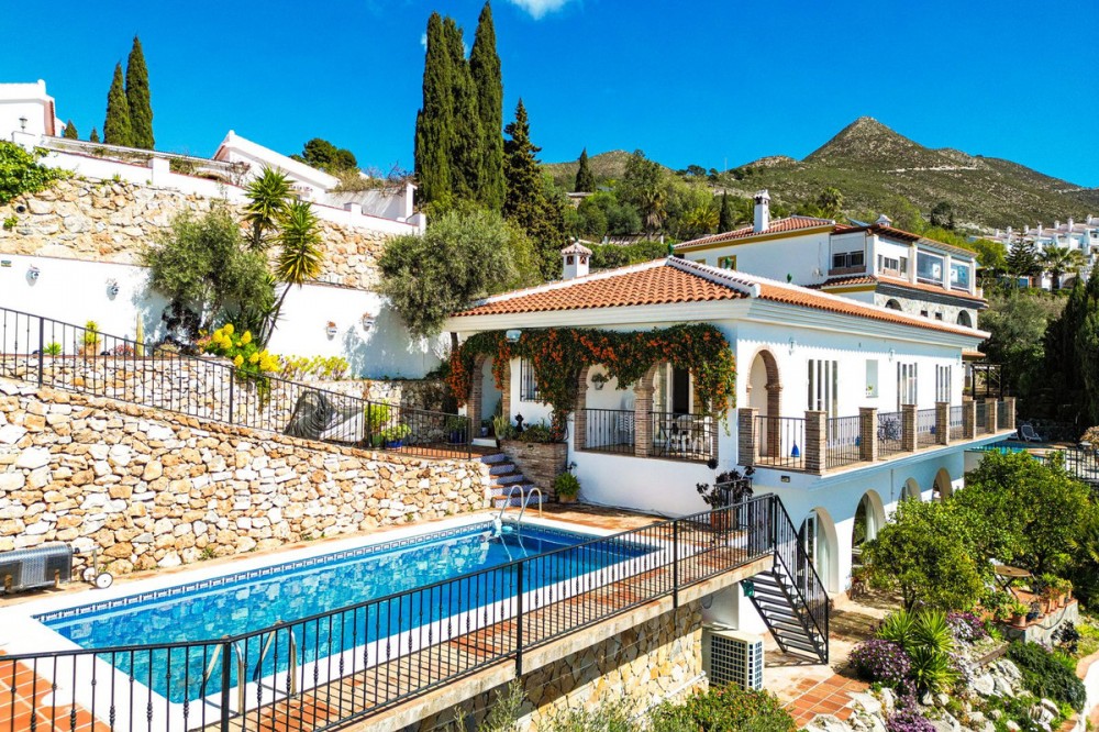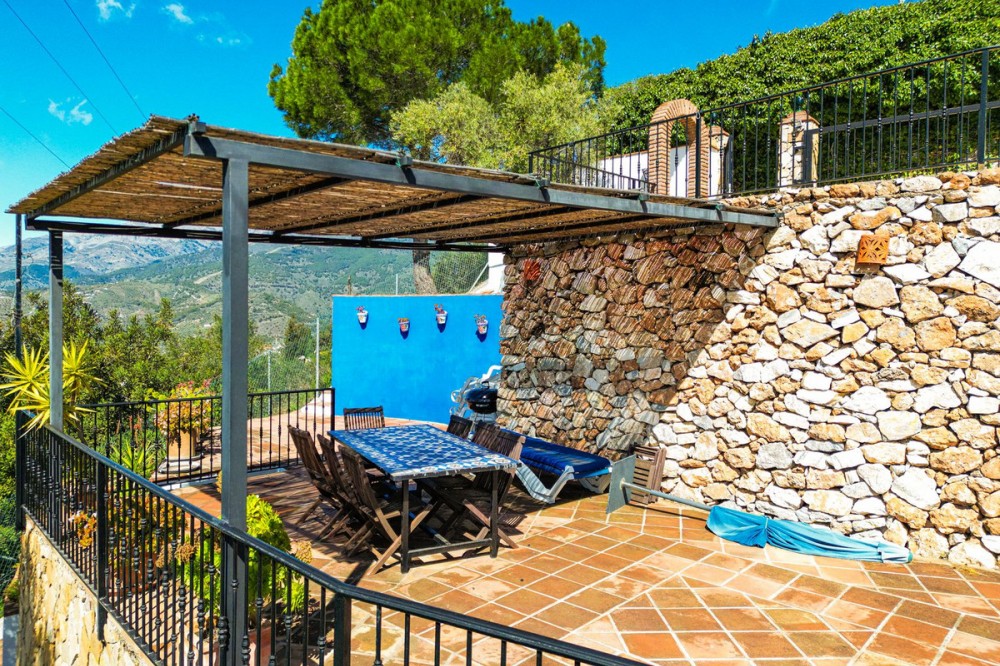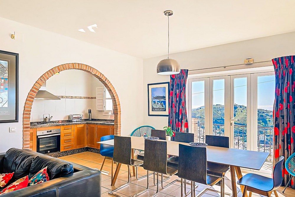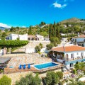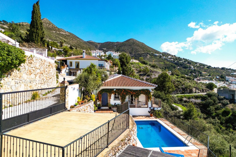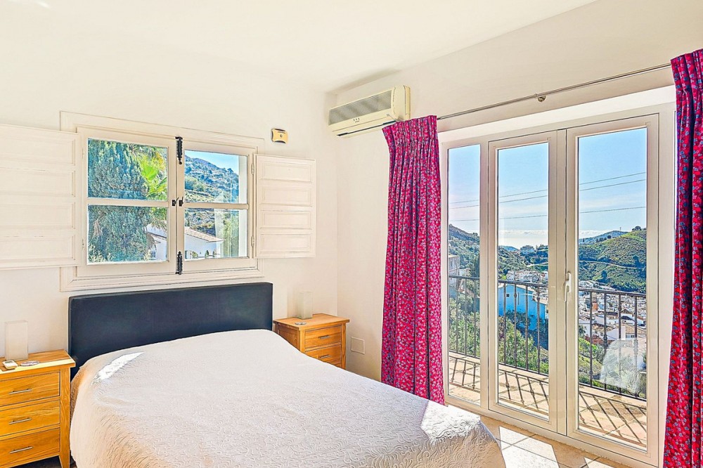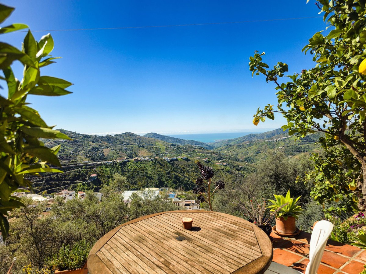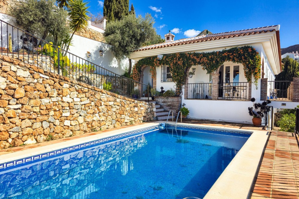 - This beautiful modern villa with 5 bedrooms and 3 bathrooms enjoys an enviable elevated position above the charming white village of Cómpeta, offering sweeping views of the Mediterranean Sea, rolling countryside, and the village rooftops below. Stylish, spacious, and impeccably presented, it is a home ready to move into and immediately enjoy. Access is easy and convenient via fully tarmac roads — no dirt tracks — leading to electrically operated gates that open onto a private driveway with secure off-road parking. From the moment you arrive, the setting and the views create a lasting impression. A welcoming covered terrace sits at the entrance to the villa, while an additional terrace runs the full length of the property, providing generous space to unwind, entertain, or simply soak in the panoramic surroundings. The heated swimming pool is perfectly positioned to take full advantage of the breathtaking views and allows for year-round enjoyment. Spacious sun terraces surround the pool, offering plenty of room for loungers and relaxed gatherings with family and friends. A shaded dining area provides the ideal spot for long, leisurely al fresco meals during the summer months. The pool and terrace areas are wonderfully private, creating a peaceful outdoor haven. The entire plot is fully fenced, ensuring both privacy and security for children and pets. Inside, the villa opens into a bright and inviting open-plan lounge and dining area. Large bi-fold patio doors frame the views beautifully and flood the space with natural light, seamlessly connecting indoor and outdoor living. Air conditioning and a free-standing log burner ensure comfort throughout the year. The fully fitted kitchen, accessed through a charming brick archway, is both practical and stylish. A further archway leads to the hallway and a separate utility room complete with washing machine, dryer, and additional storage space. The accommodation in the main villa includes a spacious master bedroom (4.4m x 4.4m) with bi-fold patio doors, fitted wardrobes, air conditioning, and an en-suite shower room (2.6m x 1.3m). Bedroom 2 (3.7m x 3.4m) also features bi-fold doors, fitted wardrobes, and air conditioning. Bedrooms 3 (3.1m x 2.4m) and 4 (3.0m x 3.0m), both currently arranged as twin rooms, are fitted with air conditioning. A well-appointed family shower room (2.6m x 1.8m) completes the main living space. The separate guest apartment, accessed via steps from the pool terrace, offers privacy and flexibility for visiting family, friends, or rental opportunities. Its full-length terrace, bordered by mature citrus trees and Mediterranean planting, enjoys the same spectacular sea and village views. Inside, the apartment features an open-plan kitchen and dining area with a lounge subtly divided by a bookcase (3.5m x 6.5m). Glazed patio doors and a large floor-to-ceiling window fill the space with natural light. There is also a double bedroom (2.8m x 3.2m) with patio doors opening onto the terrace, and a shower room (1.9m x 1.5m). Whether you are searching for a comfortable permanent residence, a stylish holiday escape, or a ready-to-go rental investment, this exceptional villa offers space, privacy, and breathtaking views in one of the most desirable locations above Cómpeta.