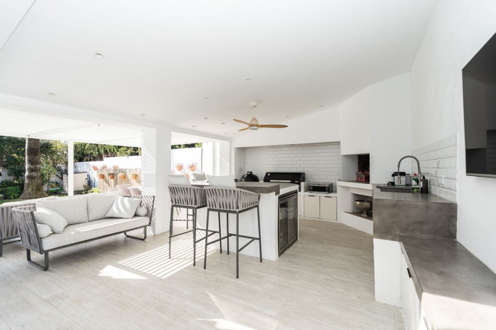 - Detached Renovated Villa with Guest Apartment and Exceptional Outdoor Living – El Pilar, El Paraíso Situated within the well-established and highly desirable urbanisation of El Pilar in the El Paraíso area, this beautifully renovated detached villa offers a perfect combination of modern comfort, flexible living space, and exceptional outdoor entertaining areas. The property has been completely renovated throughout, with brand-new kitchens, bathrooms, air conditioning systems and modern finishes, allowing the next owner to move straight in and enjoy everything this wonderful home has to offer. The villa is cleverly arranged as a three-bedroom main residence together with a separate two-bedroom apartment, making it ideal for extended family, visiting guests, older children, or even potential rental or business use. Main Residence The main house offers bright and comfortable living spaces designed for everyday living and entertaining. The spacious lounge features a charming cosy wood burner and flows naturally into a lovely dining area, creating a warm and welcoming atmosphere. A modern fully fitted kitchen complements the space, along with a convenient utility area The main residence comprises three bedrooms, including a master bedroom with its own en-suite bathroom, while the remaining bedrooms share a stylishly renovated bathroom. Large windows allow plenty of natural light to flow through the home, and the elevated terraces offer pleasant views over the pool and garden, with one terrace even enjoying a distant glimpse of the sea. Independent Guest Apartment The lower level of the property features a fully independent two-bedroom apartment, ideal for guests or family members who appreciate their own private space. This apartment includes: * Two bedrooms * One modern bathroom * A fully equipped kitchen * A **large games and entertainment area** Like the main residence, the apartment has been fully renovated and fitted with new air-conditioning throughout. The space is incredibly versatile and could easily serve as: * Guest accommodation * A private retreat for older children * Rental accommodation * A home business space or studio Outdoor Living One of the true highlights of this property is the spectacular outdoor entertaining area, designed to fully embrace the Mediterranean lifestyle. The garden surrounds a private swimming pool and offers multiple spaces for relaxing, dining, and socialising. The impressive fully equipped outdoor kitchen includes: * Large BBQ and smoker * Pizza oven * Gas burner * Fridges * Sink * Bar area There is also a large outdoor dining space, comfortable seating area, and even an outdoor television area, perfect for watching sports or hosting gatherings with friends and family. With the Costa del Sol’s wonderful climate, this outdoor area becomes the true heart of the home and can be enjoyed for most of the year. Additional Features * Detached garage * Separate **home office**, ideal for remote working * Private garden * Multiple terraces * Fully renovated throughout * New air conditioning systems * Excellent indoor-outdoor flow Location The property enjoys a superb location within **El Pilar**, one of the most convenient residential areas in El Paraíso. Within less than a 5-minute walk* residents can access a wide range of local amenities including: * Restaurants and bars * Cafés * Supermarkets * Pharmacy * Butchers * Beauty salons The beach can be reached on foot in approximately 15–20 minutes, via the well-known blue bridge. The surrounding area also offers a fantastic selection of golf courses, international schools, and even an equestrian centre, all just a short drive away. A Perfect Costa del Sol Lifestyle Home This beautifully renovated villa offers an ideal combination of flexible living space, outstanding outdoor entertaining areas, and a highly convenient location, making it perfect as a permanent residence, holiday home, or investment opportunity.