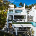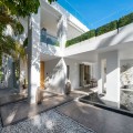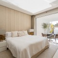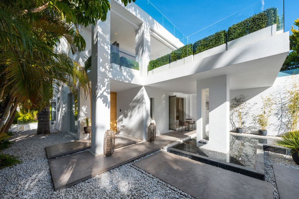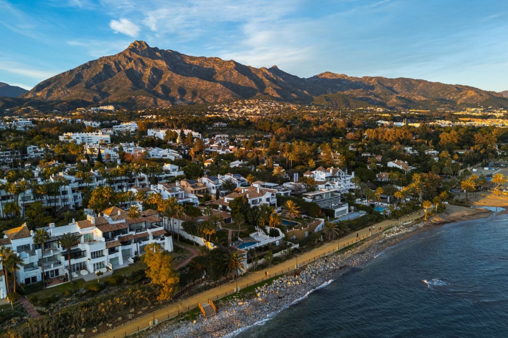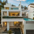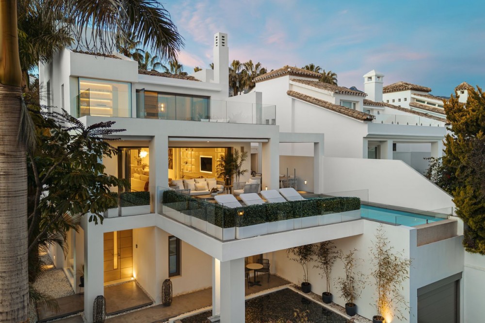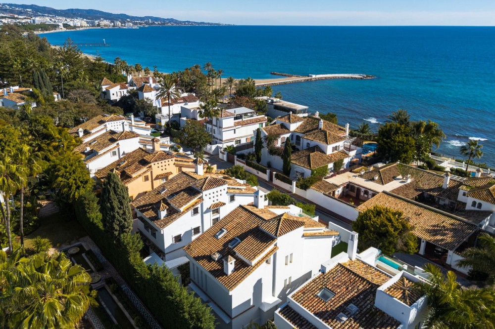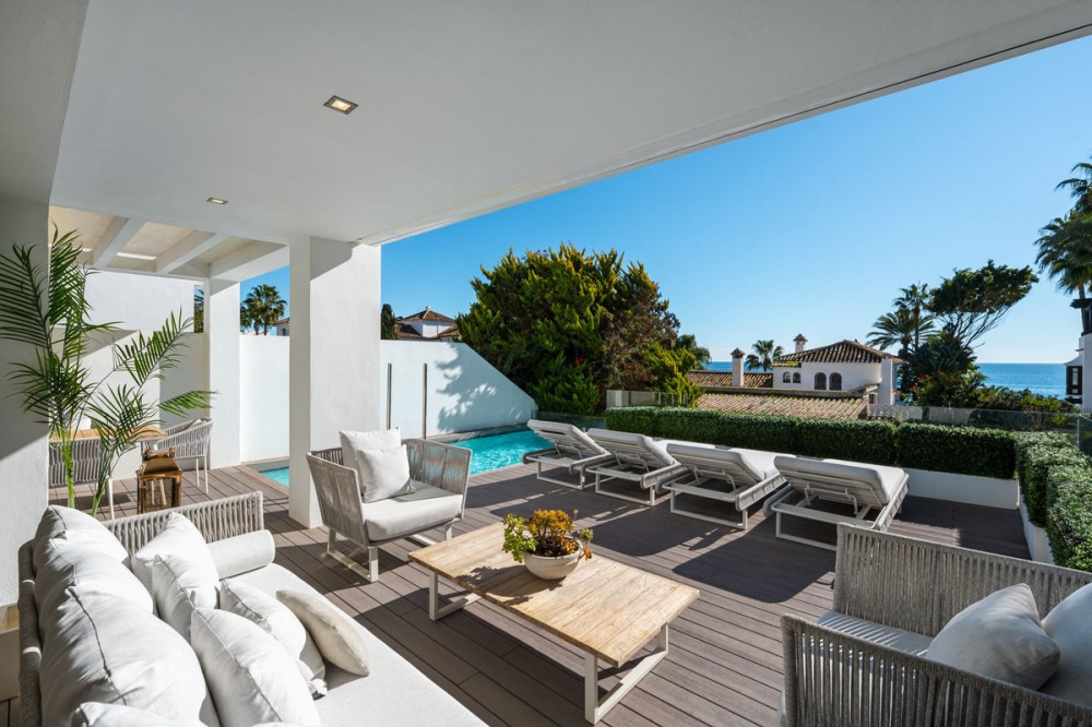 - A semi-detached villa in the urbanisation, four bedrooms, four bathrooms, arranged with intent rather than habit: basement level below, an entrance floor with three en-suite bedrooms and a calm water feature setting the tone, a first floor dedicated entirely to open-plan living with terrace and private pool, and a second floor reserved for a full-width master suite with walk-in wardrobe, private bathroom and sea-facing terrace. A private lift connects every level, from garage to rooftop calm, without interruption. This is a house for people who value flow. The lower level handles leisure properly — entertainment room with bar, cinema area with projector, gym and sauna — so the living floors remain clean and composed. Upstairs, the kitchen, dining and living space opens directly onto the terrace, where the pool meets the line of the sea rather than competing with it. Light, proportion and modern design do the heavy lifting; nothing here asks for attention, yet everything earns it. Three en-suite bedrooms and a guest toilet on the entrance level offer privacy and quiet for guests. The master floor above is entirely private, with sea views from the bed and direct terrace access that makes early mornings worthwhile. The basement handles storage, parking, the wine cellar and a guest toilet, leaving every other floor to live properly. The location is front-line beach on the Golden Mile, close to restaurants, golf, and the port. The property has been recently renovated and is ready to occupy. For those seeking a premier address in Marbella without compromise, this is the right property.