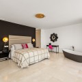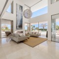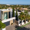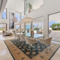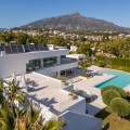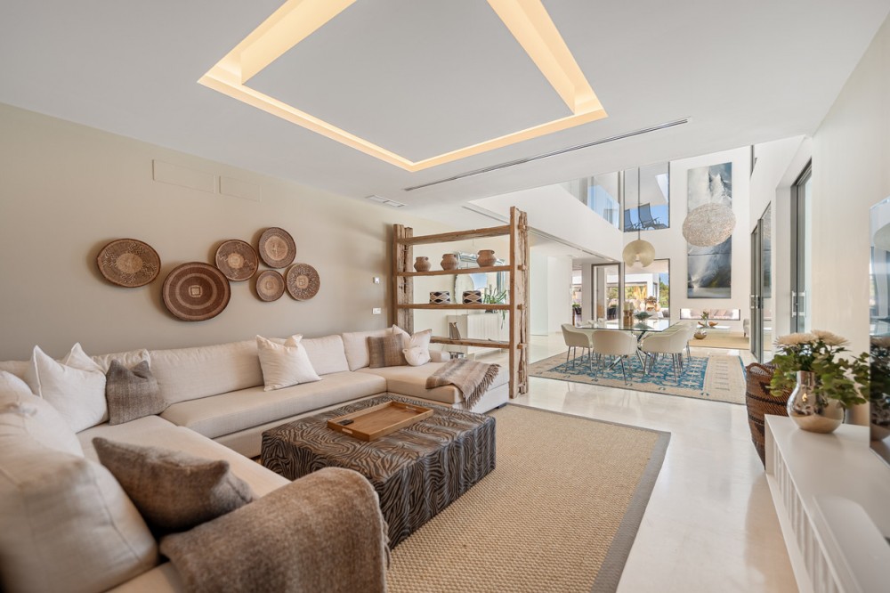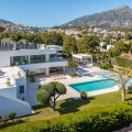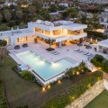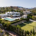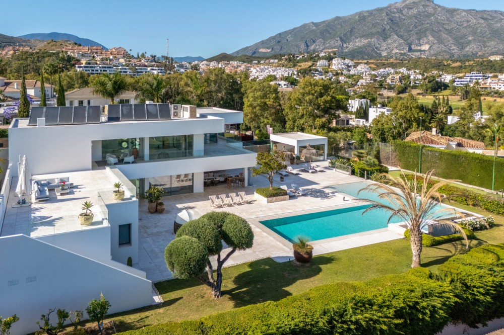 • Stunning contemporary villa located in the prestigious neighbourhood of La Cerquilla, nestled in the heart of Nueva Andalucía’s Golf Valley. This exclusive seven bedroom residence offers exceptional privacy and breathtaking panoramic views of Marbella’s iconic La Concha mountain and the Mediterranean coastline. With its prime location near top golf courses, international schools, upscale restaurants, and the vibrant Puerto Banús marina, it represents a superb investment and lifestyle opportunity. Inside, the villa features expansive interiors thoughtfully designed with natural textures and refined finishes. Soaring ceilings, elegant lighting, and a harmonious indoor-outdoor flow define the main living areas. Custom furnishings, organic materials, and curated decor elements, such as woven wall art and hand-crafted ceramics add character and warmth throughout the home. The upper level presents a tranquil, gallery-style corridor overlooking the main floor, leading to serene bedrooms with sweeping views and private terraces. At the heart of the villa is a sleek, modern kitchen equipped with premium appliances and contemporary cabinetry, flowing into a spacious glass-enclosed dining area with floor-to-ceiling windows. Outdoor living is elevated with a striking pool and jacuzzi, Balinese-style sun loungers, and a covered dining terrace complete with a fireplace and barbecue ideal for entertaining year-round. A unique highlight is the private tennis court at the foot of the garden, offering a perfect recreational space for residents.