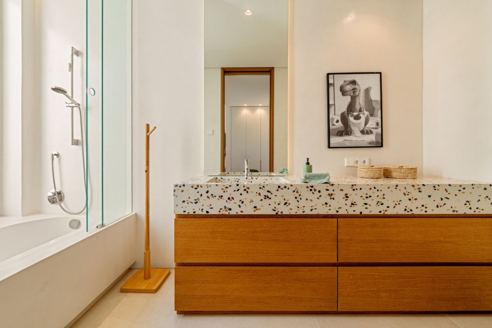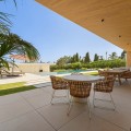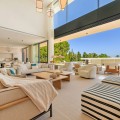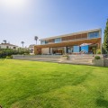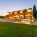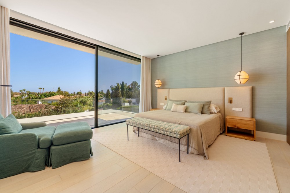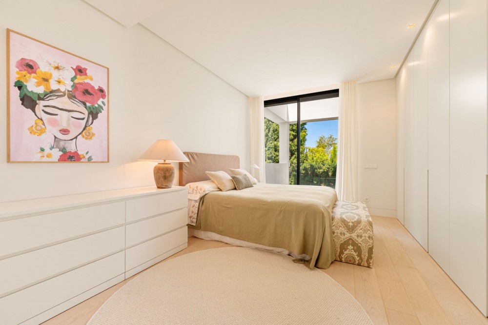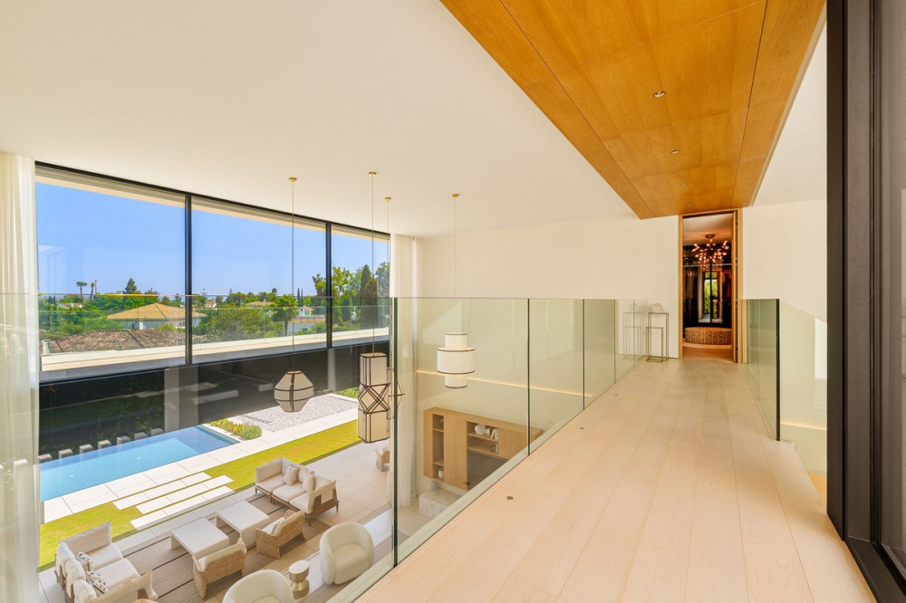 - This contemporary six-bedroom villa is located in the prestigious Guadalmina Alta area of Marbella. Blending striking modern architecture with practical living, it features clean lines, extensive glazing, landscaped gardens, and exceptional curb appeal. The main floor offers seamless indoor-outdoor living with an open-plan lounge and dining area that flows to expansive terraces and the pool. Floor-to-ceiling glass doors flood the home with light, while the designer kitchen, double-height ceilings, and thoughtful layout make it ideal for family life and entertaining. The villa includes six spacious bedrooms, with a standout primary suite featuring a walk-in wardrobe and luxurious en-suite bathroom. Additional highlights include a home office, a private entertainment level with a gym, media area, and leisure spaces. Outdoors, residents enjoy a private pool, manicured lawns, and both shaded and sunlit terraces. Secure entry, ample parking, and integrated climate and lighting systems complete this turnkey residence in one of Marbella’s most desirable neighborhoods.