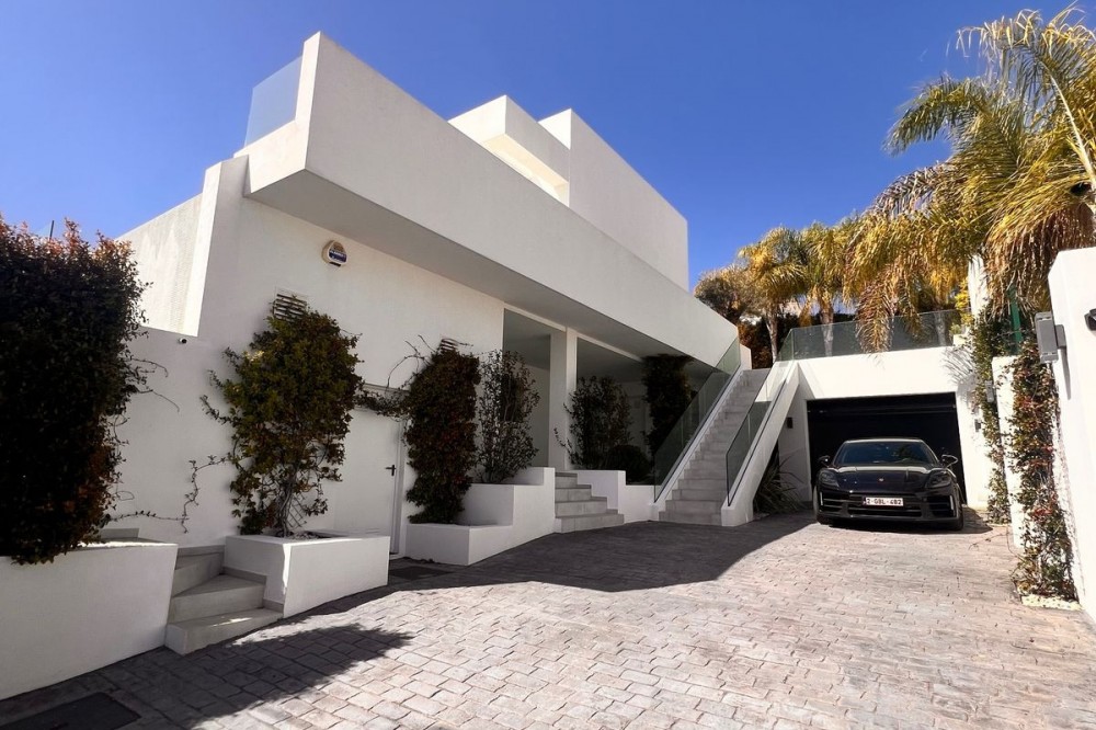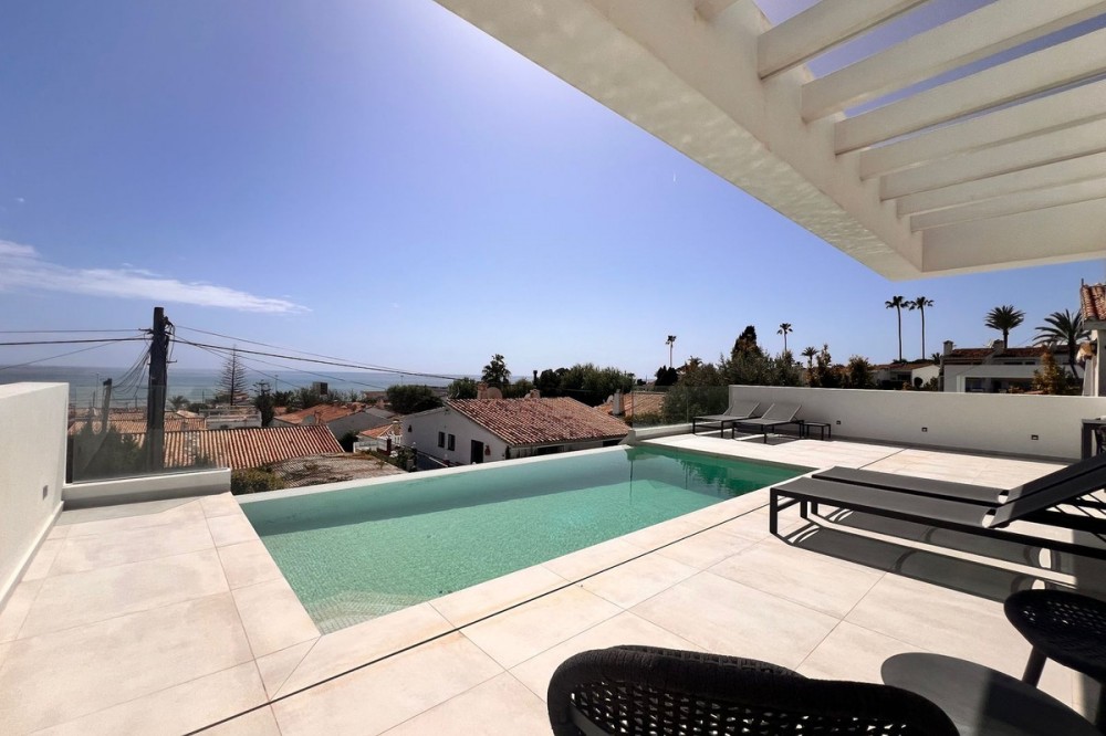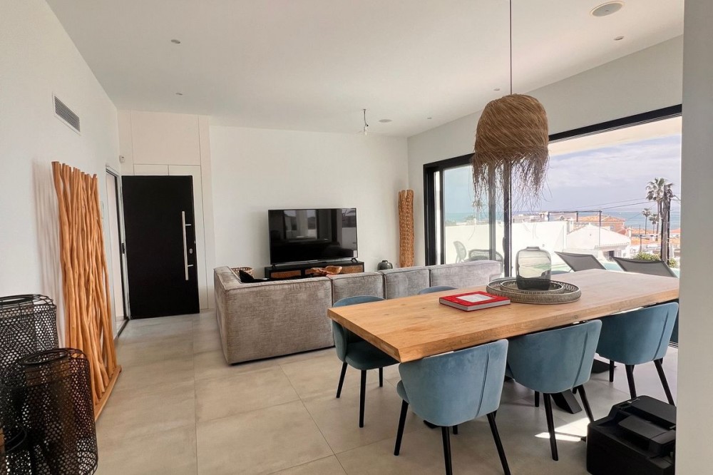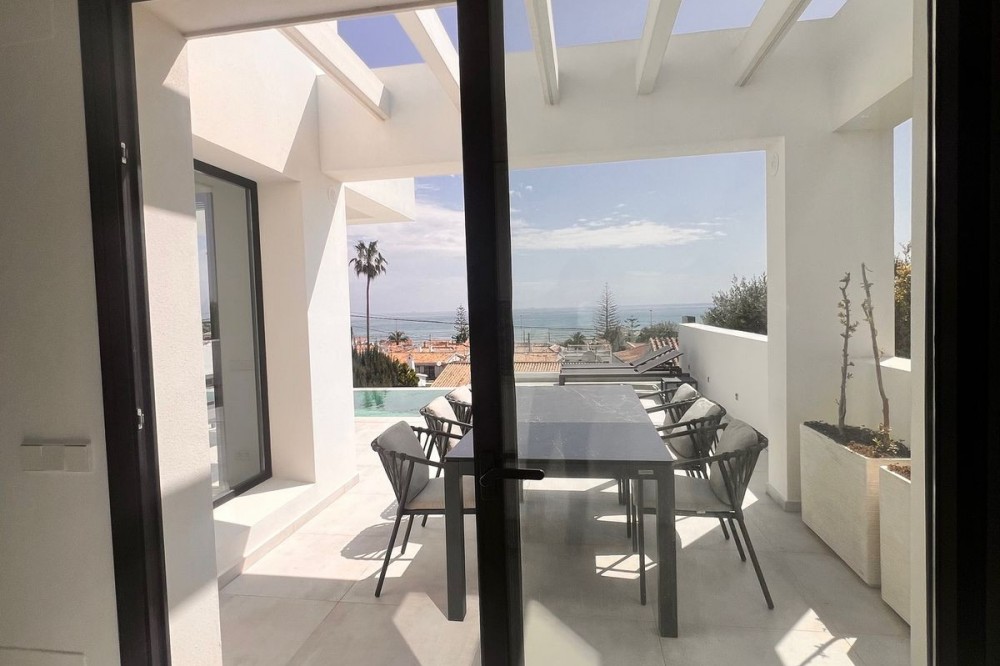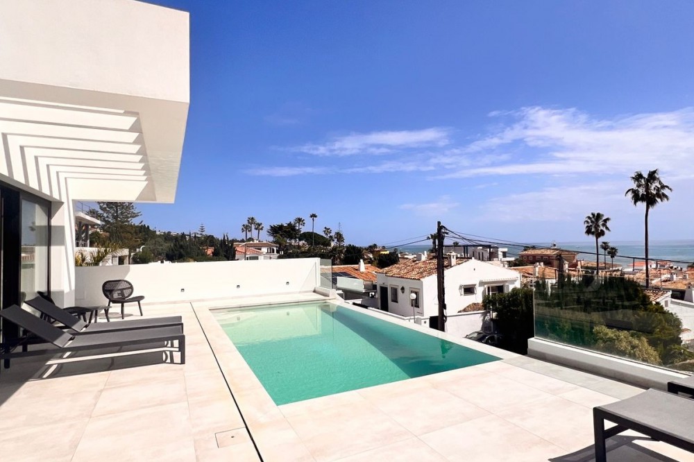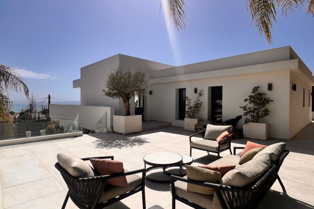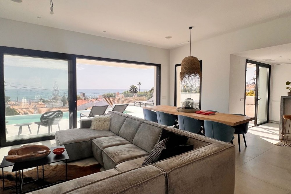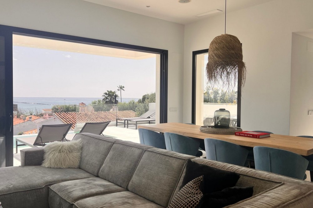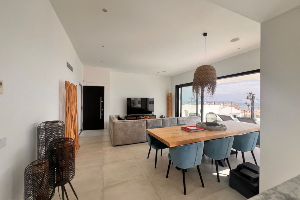 - In an exceptional location, just 280 metres from the sea and the new El Chaparral promenade, you will find this impressive modern villa with truly fantastic panoramic sea views – a rarity at such a short distance from the coast. This stylish property, built to high-quality standards, combines luxury, comfort and an excellent location. The upper floor welcomes you with a light-filled open-plan living area where the modern kitchen and elegant living room flow seamlessly onto the terrace and the beautiful infinity pool, all facing the spectacular views over the Mediterranean Sea. Here, you can enjoy an unrivalled living experience every day. This floor also features the spacious master bedroom with an en-suite bathroom and two further bedrooms that share a stylish guest shower room. All rooms are fitted with built-in wardrobes and individual air conditioning. A separate laundry room provides additional practical convenience. The ground floor offers a fully self-contained apartment with a living room, the option to install a kitchen, two bedrooms and a bathroom – ideal for guests, family or as an investment with rental potential. In addition, the villa features a spacious garage with space for 3 to 4 cars. The location is simply perfect: within walking distance of the beach and just a 15-minute walk from La Cala de Mijas. Málaga Airport can be reached in around 20 minutes. This villa is a unique opportunity for anyone looking for a modern, low-maintenance home with exceptional sea views in a prime location. An absolute must-see!