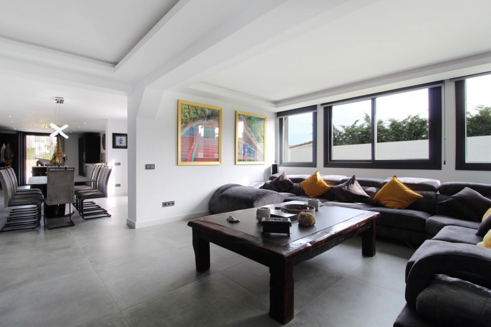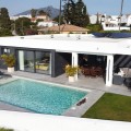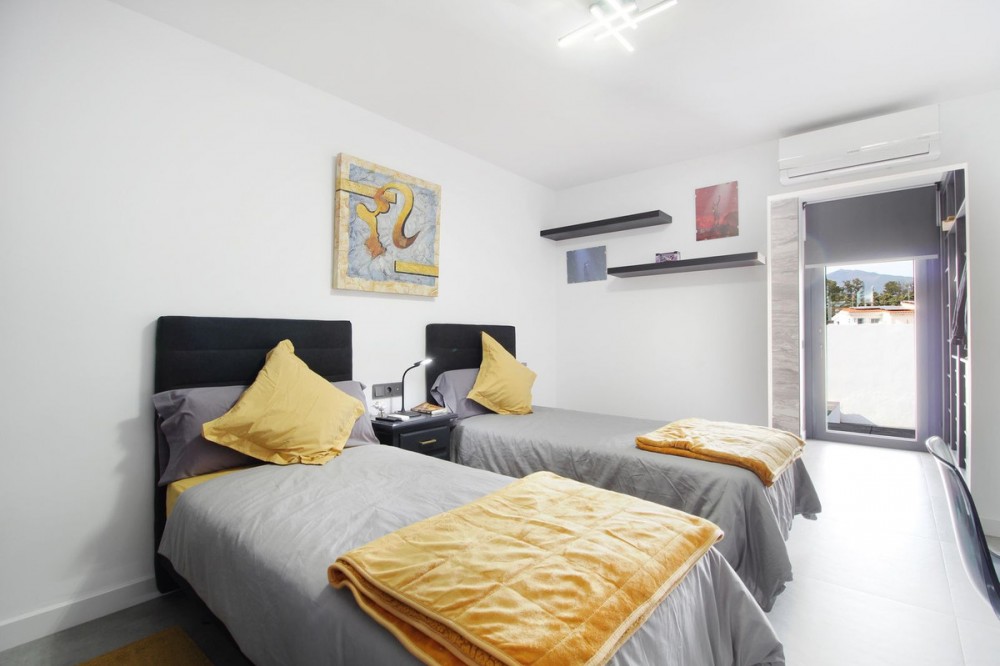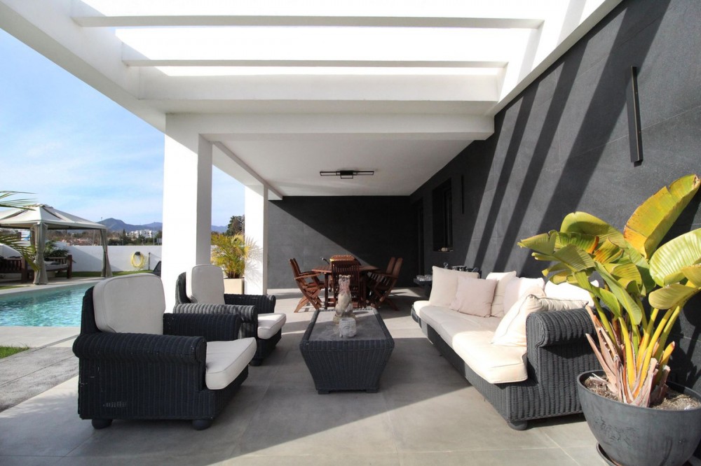 • Don't miss this fantastic villa, beachside of San Pedro de Alcantara This unique, single-level modern home, was completely renovated in 2023, and offers an exceptional living experience. Crafted with top-quality materials, the villa features three spacious bedrooms and three fully equipped bathrooms and a guest toilet.. Enjoy a grand, state-of-the-art kitchen, open plan living /dining area, a modern fireplace, and a BBQ area, beautifully illuminated by LED lighting throughout. The stunning terrace leads to a fantastic swimming pool with shallow area and lush garden, highlighting the villa's minimalistic design and large windows that enjoy abundant natural light. The property has been recently and completely modernized, situated in a quiet location near San Pedro Beach. It’s also close to numerous bars, restaurants, and the San Pedro Boulevard, with excellent motorway access. Located just moments from the beach, you’ll have easy access to San Pedro's town area, the modern boulevard, as well as the picturesque promenade connecting to Puerto Banus and Estepona. Upon entering, you are greeted by a beautifully crafted wooden front door and a seated area with a mature lemon tree. A guest bathroom is to your right, and as you walk down the hallway, the first bedroom with an ensuite bathroom is on the right, while the open kitchen and dining room area with the latest appliances are on the left. The second bedroom is just next to the first, also with ensuite and ample cupboard space. The well designed living area makes this a comfortable and welcoming home. The main bedroom has a terrace leading to the swimming pool and double doors, with another en suite bathroom. The house is decorated to a high standard, featuring custom-made furniture influenced by Southeast Asia. The stone-carved sinks add a unique touch to the property. On the roof, there is a pre-installation for a solarium area, including the possibility of a Jacuzzi and open kitchen / barbecue. The large grass area, covered terrace, and expansive pool make this perfect for a holiday home or permanent residence for those who want to be in bustling San Pedro.