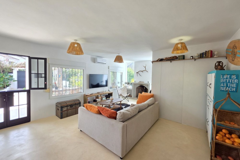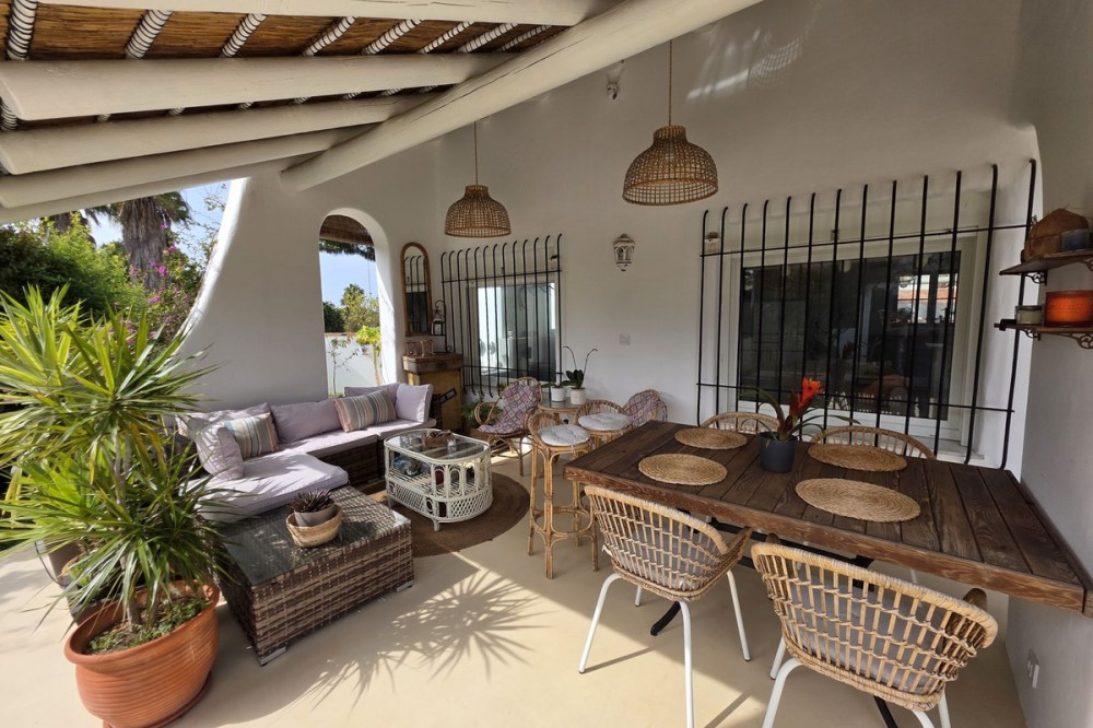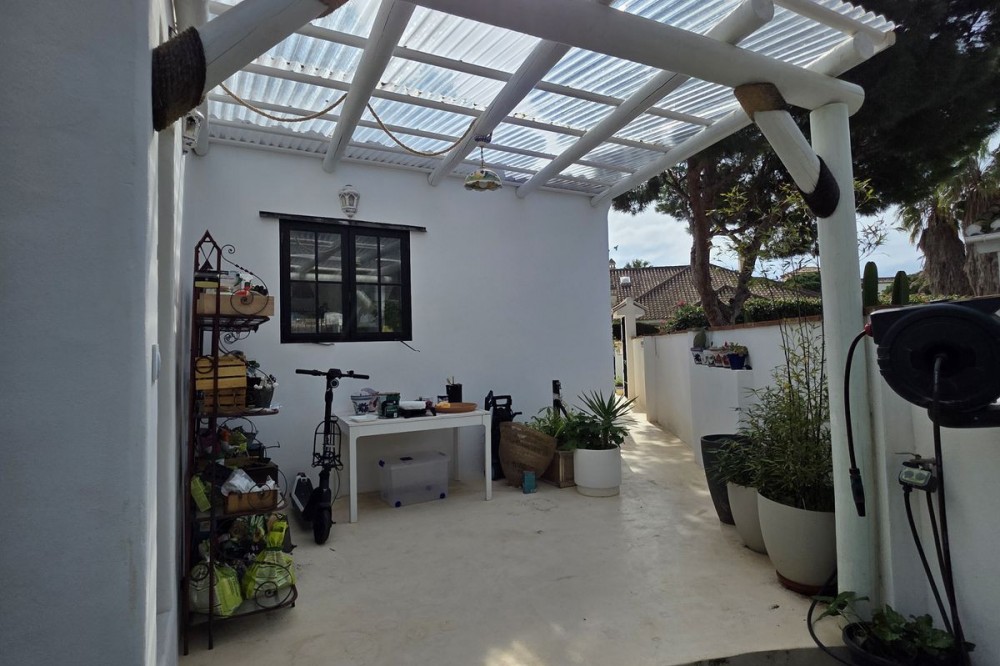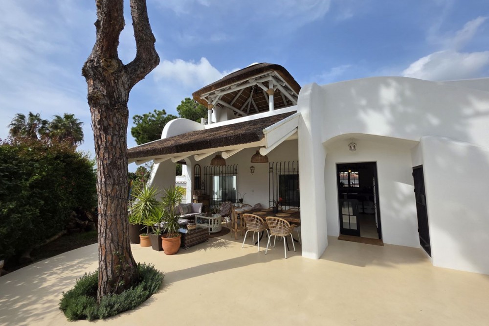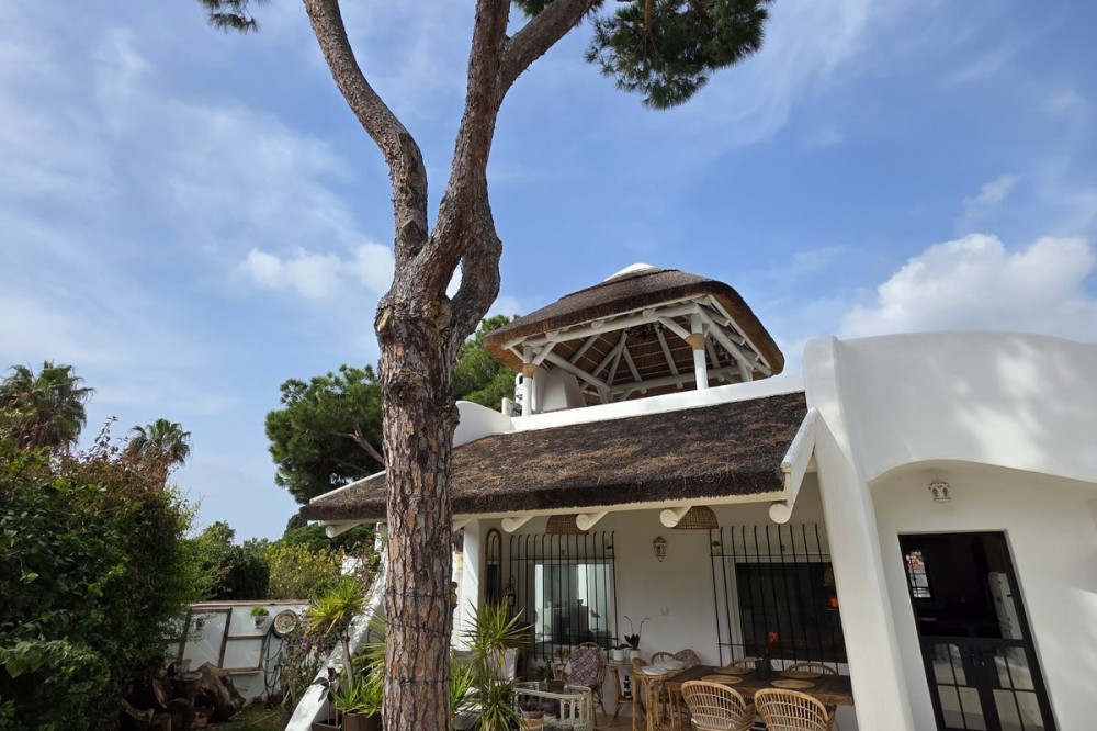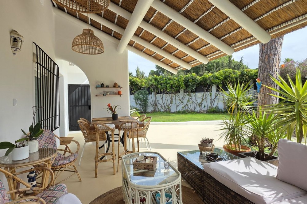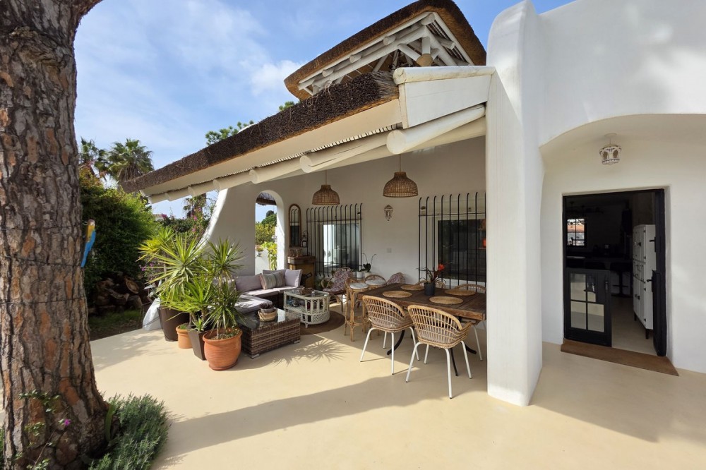 - Live the Andalusian Dream with Ibizan Flair by the Sea! We are pleased to present this exclusive detached corner villa, an architectural gem that has been fully refurbished in an exquisite Ibizan style, combining Mediterranean warmth with the most modern comforts. Located in a privileged setting, just 500 metres from the sea, this property offers a unique lifestyle where design and functionality come together on a single floor, with no stairs. The house has undergone a complete renovation, with every detail carefully considered to create bright, open and welcoming spaces. It sits on a generous private plot of almost 500 m², offering exceptional outdoor space to enjoy the area’s excellent climate in total privacy. Main features: Design & Layout: 3 spacious bedrooms and 2 full luxury bathrooms, finished with high‑quality materials and a contemporary, Ibizan‑inspired aesthetic. The entire property is arranged on a single level, ensuring easy access and a smooth flow between rooms. Private On‑Plot Parking: The property has its own parking area within the plot, with capacity for 2 cars and equipped with an electric gate to ensure maximum security and convenience. Outdoor Oasis: Private plot of almost 500 m² with garden and terrace areas, ideal for creating your own outdoor paradise. Functionality: Includes a utility room and pantry, cleverly integrated for optimal home organisation. Exclusivity & Surroundings: The property is part of a gated and very select community of only 13 villas, guaranteeing a quiet and secure residential environment. In addition, you can enjoy excellent communal areas: – Communal swimming pool open all year round – Social club for events and moments of relaxation – Multi‑sports court for fitness and outdoor activities This house is not just a property; it is a peaceful retreat with the character of Ibizan style and the advantage of a brand‑new, full refurbishment in an unbeatable location. Come and discover your new home by the Mediterranean!