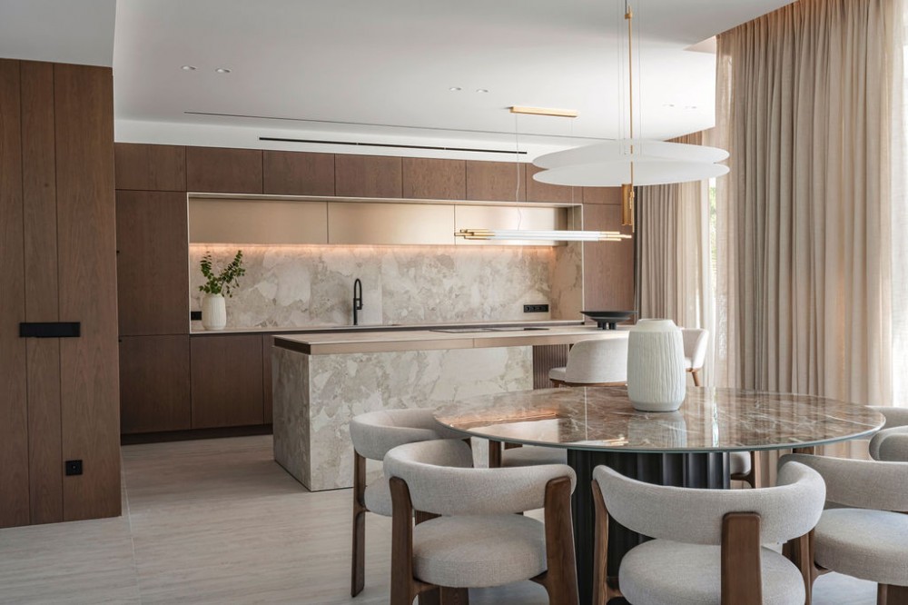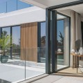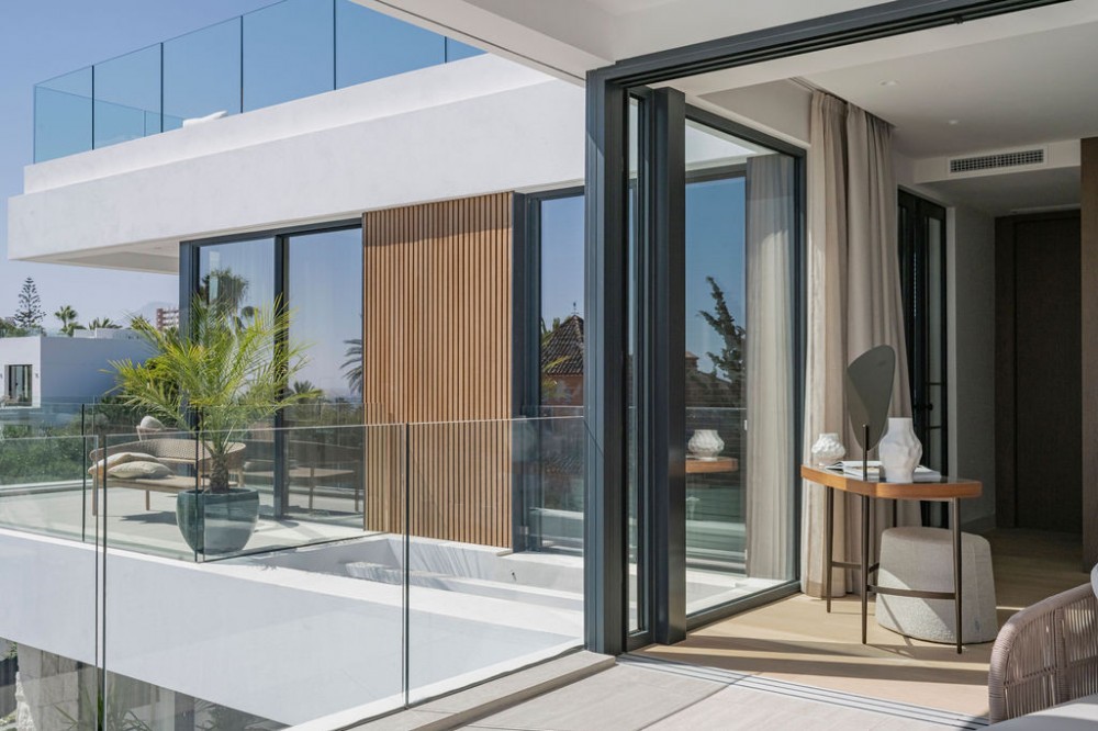- This exceptional contemporary villa in Marbesa, east Marbella, has been thoughtfully designed to combine modern architecture, comfort and functionality, creating a refined home just a short walk from the beach and the area’s charming beach bars and restaurants, and only a short drive from Marbella town centre. The villa stands out for its striking architectural design, which combines natural stone, wood-effect finishes and lush landscaping, blending seamlessly with the surrounding coastal environment. Distributed across multiple levels, the property offers a well-balanced layout designed for both everyday living and entertaining. The main living level features an expansive open-plan living room and modern kitchen, where large floor-to-ceiling windows flood the space with natural light and create a seamless transition between indoor and outdoor living. This area opens directly onto a spacious covered porch and the south-facing garden level, where expansive terraces provide ideal spaces for al fresco dining and elegant chill-out areas. The private swimming pool is designed for year-round use, creating a perfect outdoor lifestyle setting. The upper floor is dedicated to the private living quarters, comprising four en-suite bedrooms. The master suite stands out with its private terrace and luxurious bathroom, creating a comfortable and private retreat. Several bedrooms enjoy access to terraces that enhance the indoor–outdoor lifestyle and provide pleasant open views. The rooftop solarium offers panoramic sea views and provides an exceptional space for relaxation, sunbathing and entertaining, further enhancing the villa’s lifestyle appeal. The basement level has been designed for both leisure and practicality, featuring an additional bedroom with walk-in wardrobe, a fully equipped gym and a private sauna, creating a wellness area within the home. This level also includes a garage with space for two cars, as well as a laundry room, technical room and additional storage areas. Built with high-quality materials and modern construction techniques, the property features elegant wooden finishes, brick walls for durability, gypsum pocket sliding doors and contemporary metal and glass doors and partitions, combining aesthetics with practicality. Located in one of the most desirable beachside areas of east Marbella, within walking distance to the sea and close to golf courses, schools and Marbella town, this villa represents a perfect blend of modern design, quality construction and an unbeatable location by the beach — ideal as a permanent residence or a luxury holiday home.