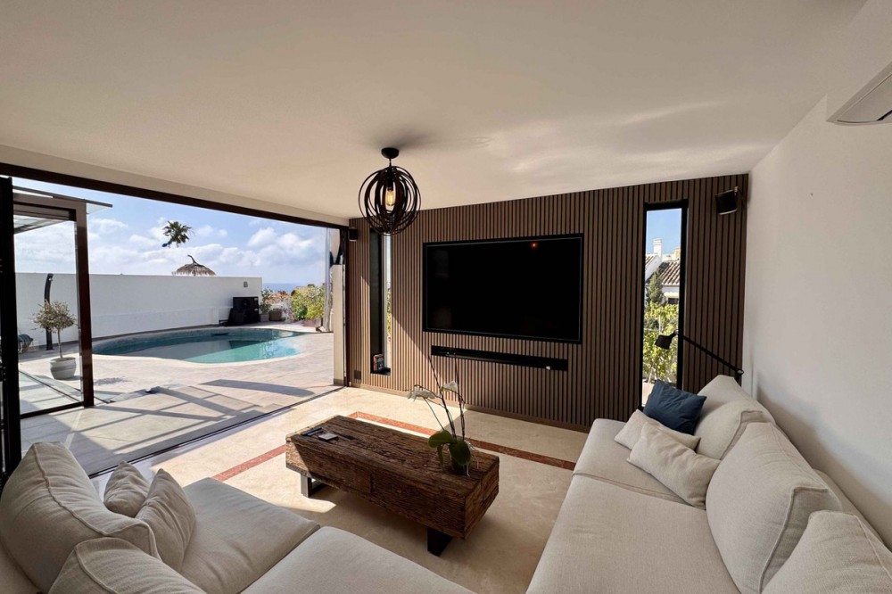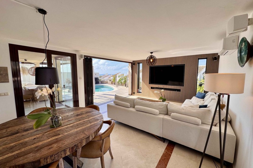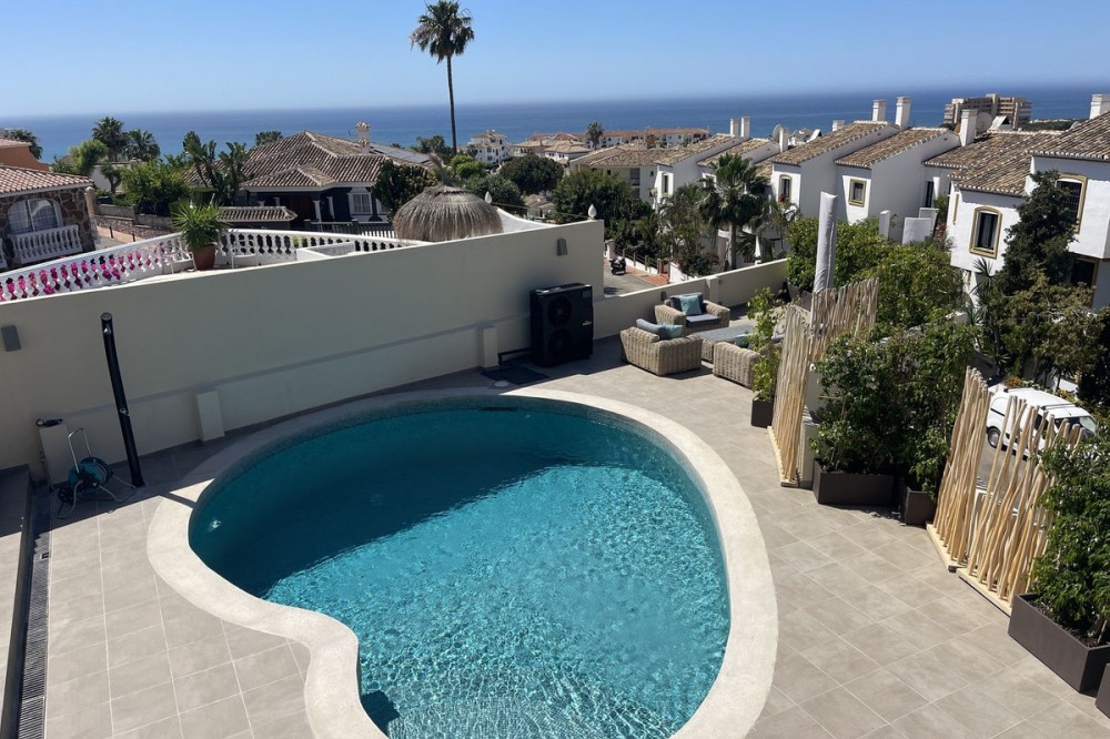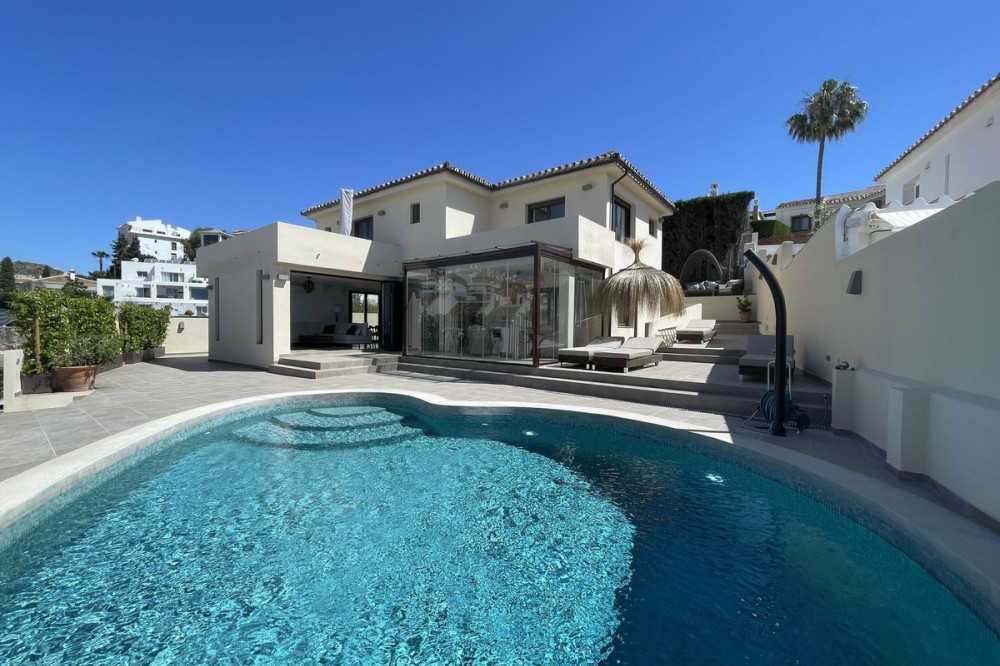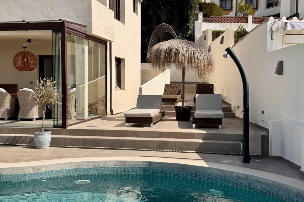 - Introducing an exceptional detached villa in Riviera del Sol—a prime opportunity to secure a luxury home in one of the Costa del Sol’s most sought-after coastal locations, just a short walk from the beach, restaurants, and everyday amenities. This beautifully renovated property offers four generous bedrooms, four stylish bathrooms, and a separate self-contained apartment—ideal for guests, extended family, or rental income potential. Finished to an impeccable standard, the villa features marble flooring, air conditioning, double glazing, underfloor heating, and an integrated Sonos sound system, delivering both comfort and sophistication throughout. The main living area is bright, open, and designed for modern living, with expansive windows and folding glass doors that create a seamless indoor-outdoor experience. The southwest orientation ensures all-day sun, enhancing both the interior ambiance and the outdoor lifestyle. A glass-curtained terrace provides a versatile year-round entertaining space. The high-spec kitchen is fully equipped with premium appliances and flows effortlessly into the dining area—perfect for hosting and social occasions. A guest bedroom and contemporary bathroom on this level add flexibility and convenience. Upstairs, the bedrooms are spacious and elegantly finished, each with luxurious en-suite bathrooms. The master suite and second bedroom enjoy private terraces with attractive views towards the Mediterranean—ideal for relaxing or entertaining. Outside, the property truly shines. A heated swimming pool, dedicated BBQ area, and expansive terraces create the perfect setting for outdoor living. The landscaped garden, complete with mature orange, lemon, and avocado trees, adds a unique Mediterranean charm. Combining location, quality, and lifestyle appeal, this villa represents an outstanding investment—whether as a full-time residence, high-end holiday home, or premium rental property on the Costa del Sol.