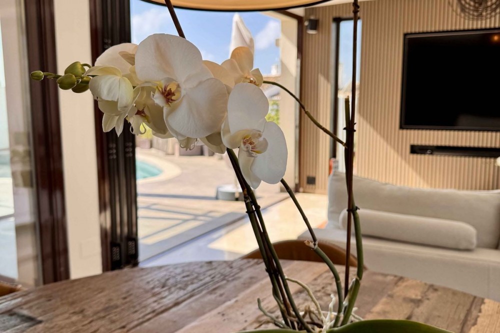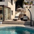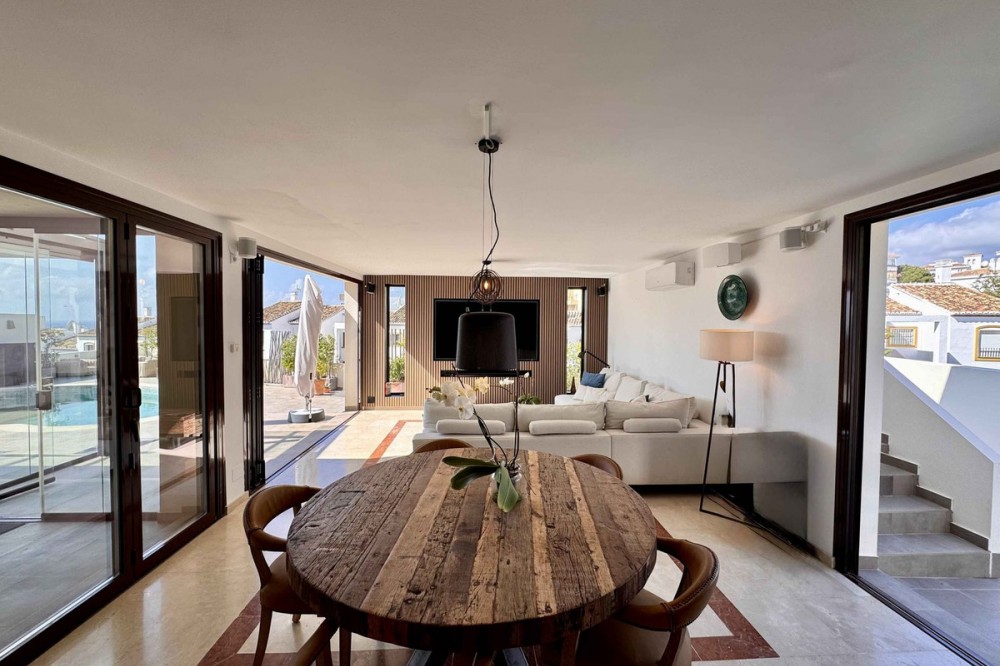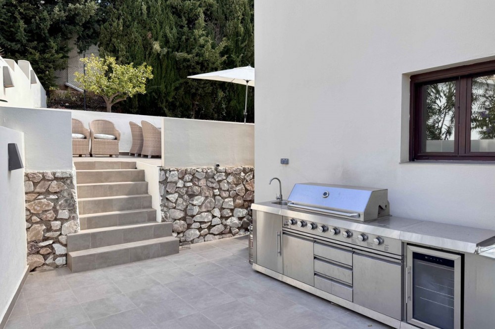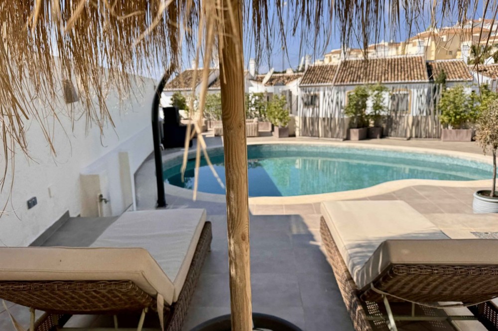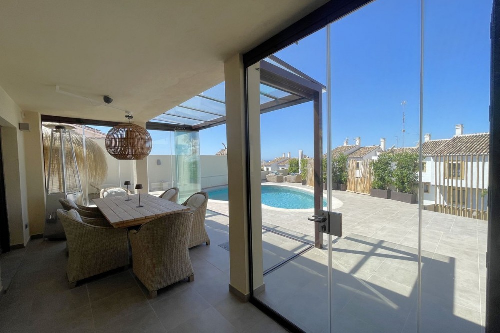 - Introducing an exceptional detached villa in Riviera del Sol—a prime opportunity to secure a luxury home in one of the Costa del Sol’s most sought-after coastal locations, just a short walk from the beach, restaurants, and everyday amenities. This beautifully renovated property offers four generous bedrooms, four stylish bathrooms, and a separate self-contained apartment—ideal for guests, extended family, or rental income potential. Finished to an impeccable standard, the villa features marble flooring, air conditioning, double glazing, underfloor heating, and an integrated Sonos sound system, delivering both comfort and sophistication throughout. The main living area is bright, open, and designed for modern living, with expansive windows and folding glass doors that create a seamless indoor-outdoor experience. The southwest orientation ensures all-day sun, enhancing both the interior ambiance and the outdoor lifestyle. A glass-curtained terrace provides a versatile year-round entertaining space. The high-spec kitchen is fully equipped with premium appliances and flows effortlessly into the dining area—perfect for hosting and social occasions. A guest bedroom and contemporary bathroom on this level add flexibility and convenience. Upstairs, the bedrooms are spacious and elegantly finished, each with luxurious en-suite bathrooms. The master suite and second bedroom enjoy private terraces with attractive views towards the Mediterranean—ideal for relaxing or entertaining. Outside, the property truly shines. A heated swimming pool, dedicated BBQ area, and expansive terraces create the perfect setting for outdoor living. The landscaped garden, complete with mature orange, lemon, and avocado trees, adds a unique Mediterranean charm. Combining location, quality, and lifestyle appeal, this villa represents an outstanding investment—whether as a full-time residence, high-end holiday home, or premium rental property on the Costa del Sol.
