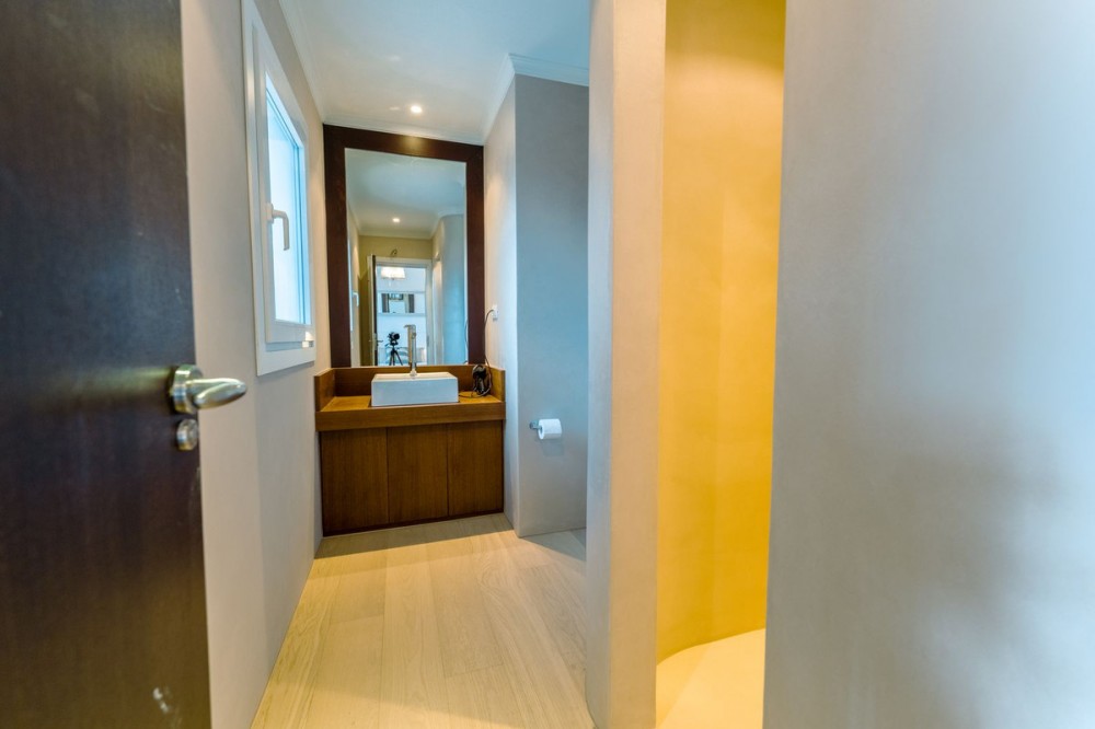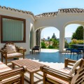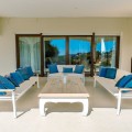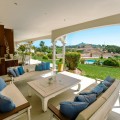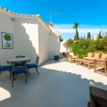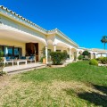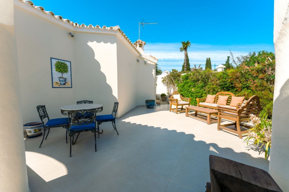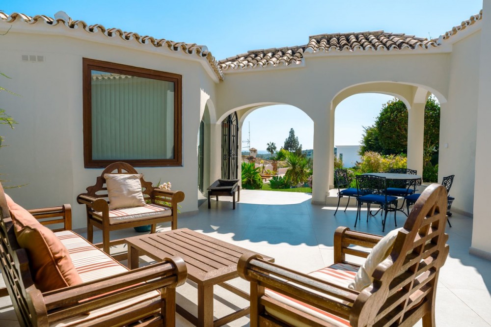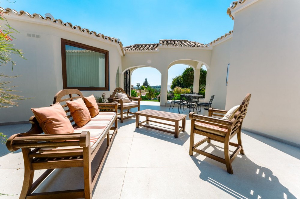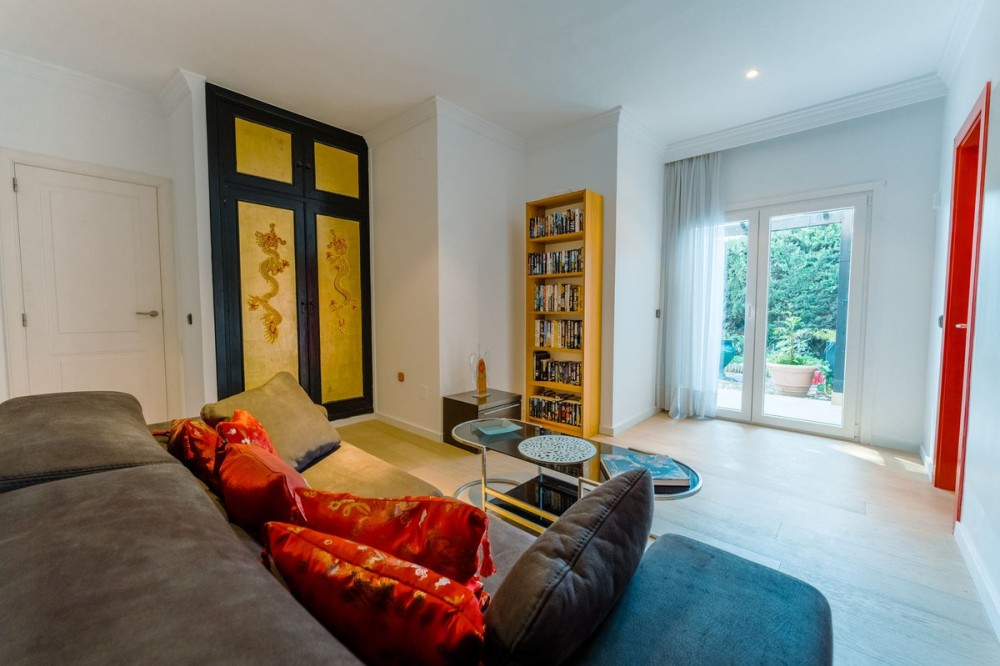 - An exceptional south-facing villa, exquisitely modernised, occupying a privileged second-line golf position in El Paraíso, offering breathtaking 180-degree panoramic views across the golf course to the Mediterranean Sea and the North African coastline. Originally built in 1980 and thoughtfully reimagined, this elegant single-level residence combines timeless Andalusian charm with refined contemporary living. Set within high perimeter walls, the property ensures complete privacy and security, with a distinguished pedestrian entrance and two automated wooden gates leading to a spacious courtyard and a three-car garage. At the heart of the home lies a magnificent open-plan living area, bathed in natural light and seamlessly connected to the landscaped gardens and pool. Expansive sliding doors open onto a generous covered terrace spanning the entire length of the villa, creating a sophisticated indoor-outdoor lifestyle ideal for year-round enjoyment. The depth of the terrace allows for optimal airflow, enhancing comfort during the warmer months. The interiors are finished with Belgian-sourced wood parquet flooring, offering both warmth and elegance while maintaining excellent thermal comfort. Climate control is ensured through discreet split air-conditioning systems, providing both heating and cooling. The designer kitchen, curated by a professional chef, is both functional and refined. Featuring premium AEG appliances, a Samsung American-style fridge, dual sinks, and bespoke floor-to-ceiling cabinetry, the space is illuminated by a skylight and flows effortlessly into a spacious dining area with direct terrace access. The villa is intelligently divided into distinct wings. The guest wing comprises three beautifully appointed bedrooms, each with built-in wardrobes and luxurious en-suite bathrooms, offering privacy and comfort for family and visitors. In the east wing, a bespoke acoustically engineered music and cinema room, designed by the architect owner, delivers an extraordinary audio experience, rivaling world-renowned recording studios. From here, a staircase leads to a spectacular roof terrace, where uninterrupted views stretch from the golf course to the sea, framed by mountain views. The master suite is a sanctuary of tranquillity, featuring floor-to-ceiling picture windows, direct access to the terrace and garden, a fully fitted dressing room, and a luxurious en-suite bathroom complete with a freestanding bath, walk-in shower, and double vanity, finished with handcrafted details by Belgian artisans. Additional features include a separate garden-facing office pavilion, a multi-functional annex with office, library, gym, and storage, all fitted with high-performance Schüco double glazing and climate control. The landscaped grounds are equally impressive, featuring a freeform kidney-shaped swimming pool, mature gardens, and a private area for cultivating fruit and vegetables, enhancing the estate’s charm and lifestyle appeal. Designed with both elegance and practicality in mind, the property also caters to car enthusiasts with a fully equipped garage featuring ambient lighting and integrated power points. A rare opportunity to acquire a refined and private golf-front residence that perfectly captures the essence of sophisticated Mediterranean living.