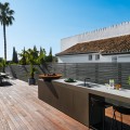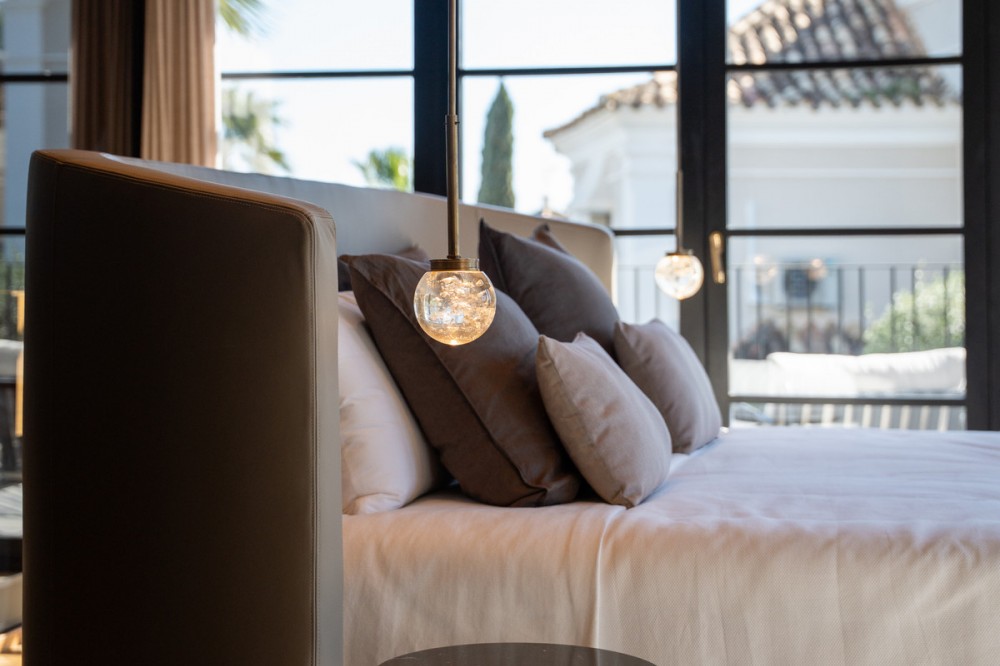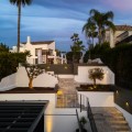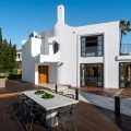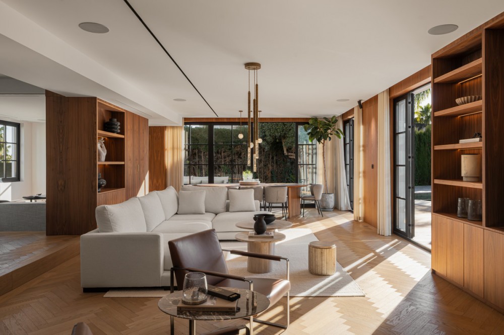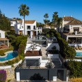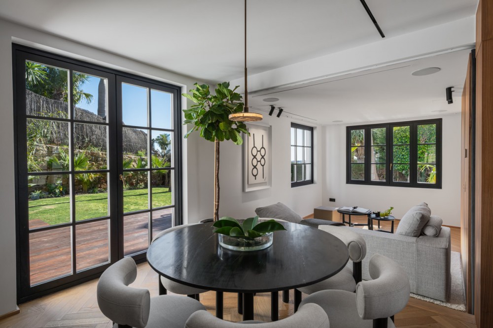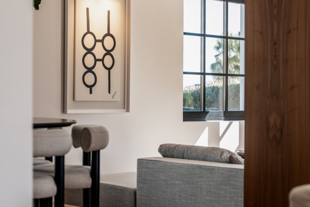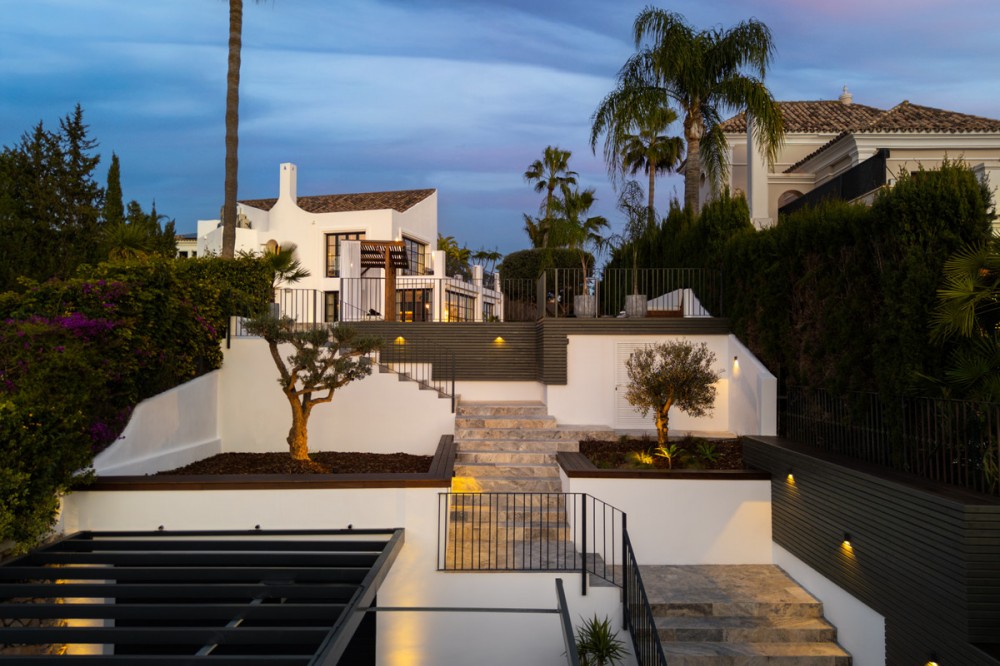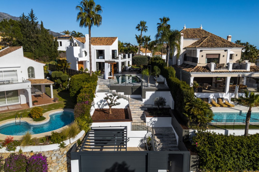 • A four-bedroom villa in Nueva Andalucía with open golf and sea views, arranged over multiple levels with a garden-level pool, integrated outdoor kitchen, generous terraces and a private garage. This is not your average Golf Valley villa. It has been redesigned with a clear architectural direction, where proportions, materials and flow have been carefully selected. From the entrance, the detailing is evident: herringbone oak flooring, bespoke walnut joinery, fluted cabinetry and dark-veined marble, all brought together with consistency rather than contrast for effect. The main living area connects directly to the garden level, where the pool, sun deck and built-in barbecue are positioned as a natural continuation of the house. The kitchen and dining space open outward without interruption, creating a layout that works as well for daily use as it does for hosting. The outdoor areas are generous yet private, framed by mature planting and oriented towards the golf course. Upstairs, the principal suite benefits from vaulted timber ceilings, open dressing, sculptural stone basins and a walk-in marble shower. Full-height glazing frames the views to the golf and sea, while maintaining privacy. The additional bedrooms follow the same standard of finish and proportion, each thoughtfully designed to maximise comfort. Practical elements, such as a separate utility room, integrated wine storage, custom carpentry and layered lighting, are integrated discreetly throughout. Nueva Andalucía remains one of the most established addresses in the area, with leading golf courses nearby, Puerto Banús within easy reach and international schools and restaurants close at hand. The setting offers elevation, views and convenience in equal measure. For a buyer seeking a four-bedroom home in the Golf Valley that combines architectural integrity, refined materials and seamless indoor–outdoor living, this property deserves your attention.