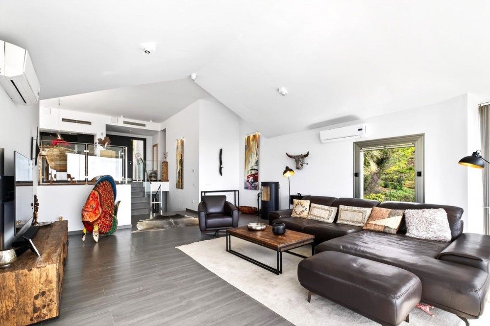 - Luxury Contemporary Villa Panoramic Sea & Mountain Views | Private Plot | Premium Lifestyle Location Prestigious Valtocado, close to Mijas Pueblo, beaches, golf courses, and Málaga Airport. Overview .A Private Mediterranean Retreat Set on a 2,616 m² plot, in the hills of Valtocado, this exceptional contemporary villa offers privacy, architecture, refined living and breathtaking views. Designed to embrace light and landscape, every space connects seamlessly with the outdoors and the natural surroundings Key Features - Split-level living area with a cathedral ceiling and iconic panoramic window. - 5 Bedrooms & 5 Bathrooms - Heated swimming pool with electric cover - Garage for 2 vehicles - Sauna & wellness area - 15 solar panels - Air conditioning per floor - Central ventilation system - Electric shutters - Fully fenced plot with automatic gates Seamless Indoor–Outdoor Living Expansive terraces, a heated pool, and elegant lounge areas create the perfect environment for relaxation and entertaining. Architectural Elegance The iconic semi-circular panoramic window defines the main living space, framing uninterrupted views of sea and mountains. Refined Interiors Modern finishes, spacious layouts, and carefully curated design elements offer comfort and sophistication throughout. Contemporary Kitchen A fully equipped modern kitchen with direct access to the garden enhances everyday living and entertaining. Comfort & Privacy Generous bedrooms with natural light and access to terraces provide a peaceful retreat. Wellness & Relaxation Private sauna and relaxation areas elevate the lifestyle offering of this exceptional home.