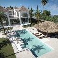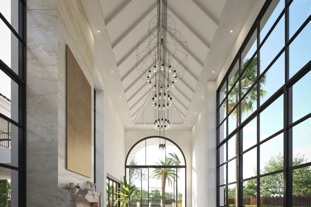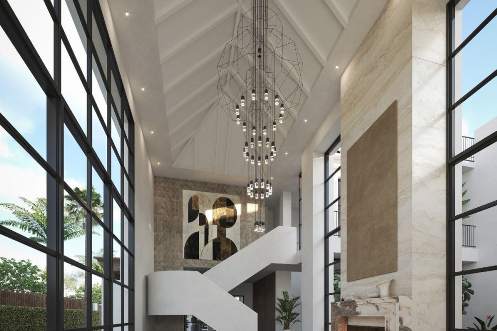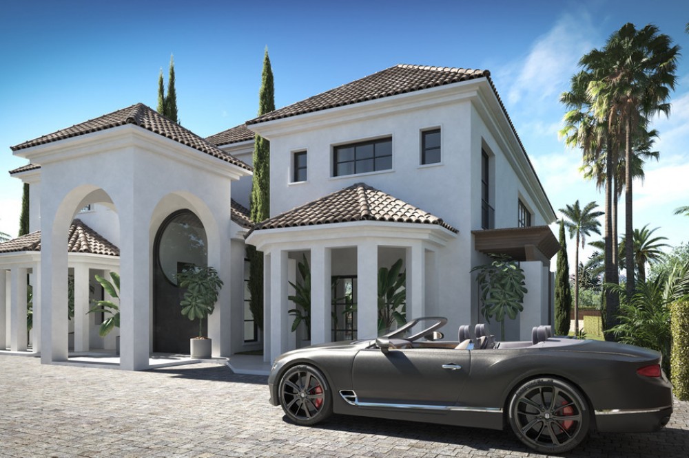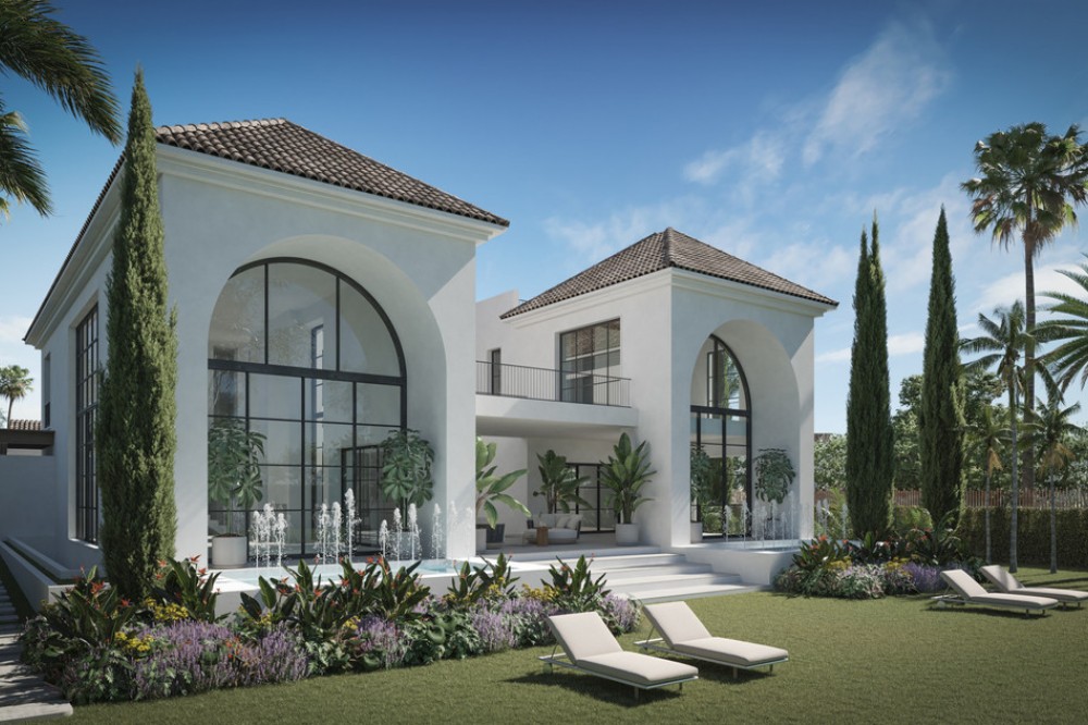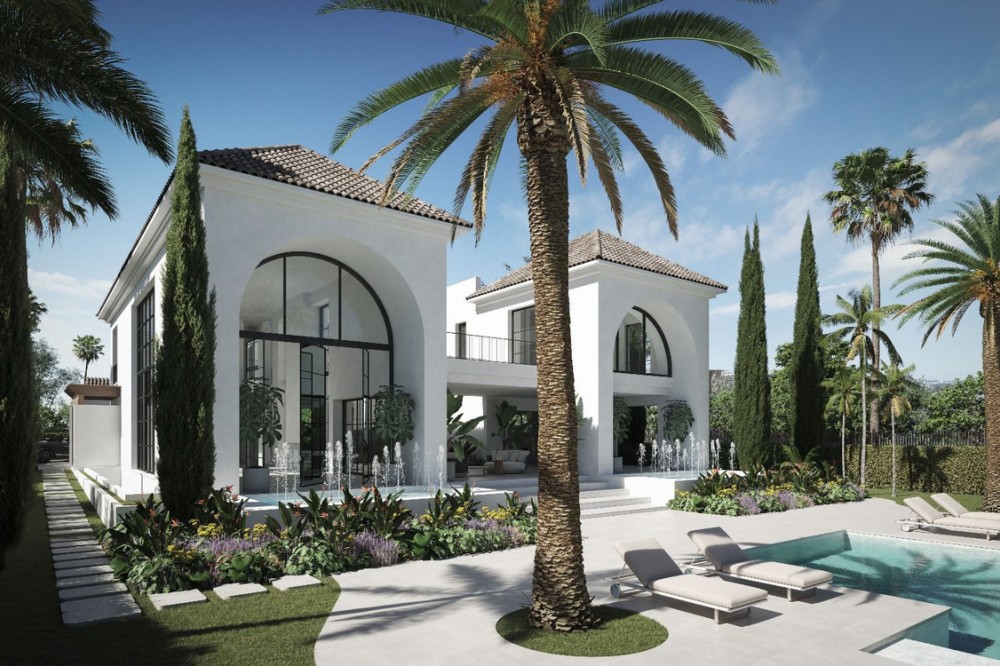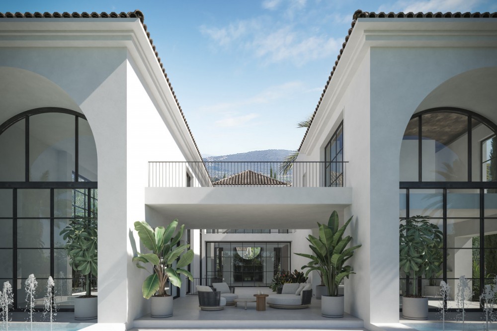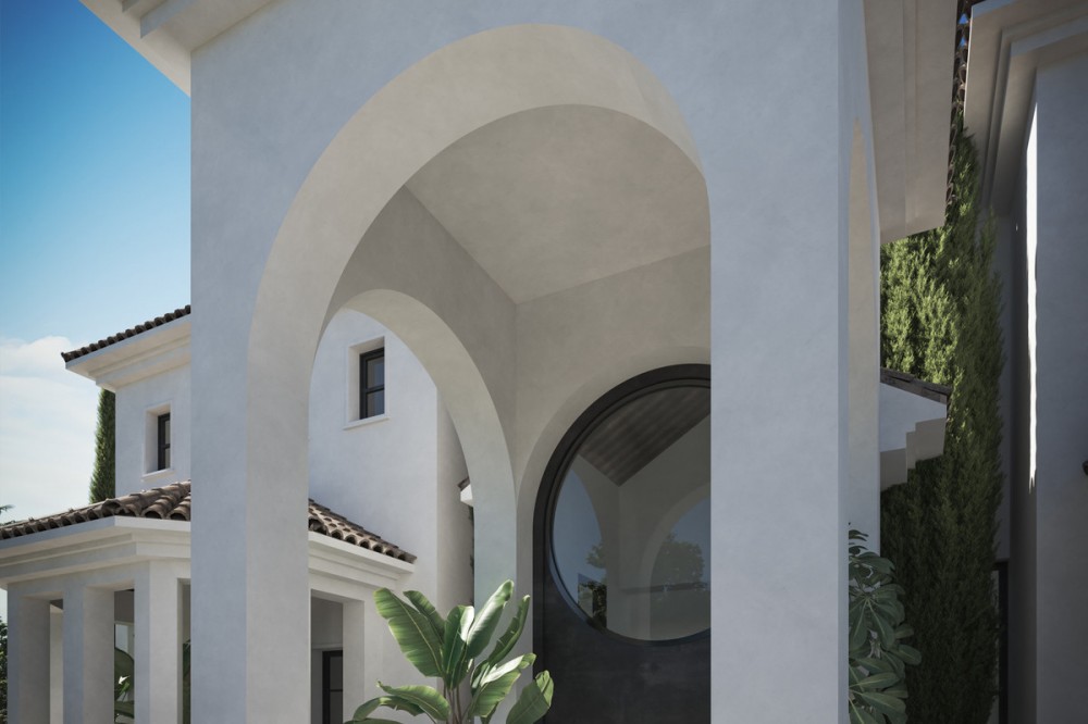 - A villa project in Nueva Andalucía set on a 2,273 m² plot with 1,038 m² built, designed with 6 to 8 bedrooms, 6+2 bathrooms, a double-height central living space, and a flexible lower level ready to be defined. Villa Los Arcos is about structure. The architecture is already resolved: symmetry, proportion, and those repeated arches that give the house its identity without overstatement. The entrance draws you straight through the property, aligning interior and garden in one uninterrupted axis. It’s deliberate and it works. Inside, the volume carries the experience. A double-height living area framed by full-scale glazing sets the tone, light from both sides, no reliance on artificial drama. Kitchen, dining, and lounge sit open but controlled, centred around a statement island that anchors the space without dominating it. Bedroom distribution is adaptable: six are planned, eight are possible, depending on how you choose to use the lower level. All en-suite, all positioned with privacy in mind. Outside, the garden is proportioned correctly to the house—rare at this level. A long pool runs parallel to the main living spaces, with clean transitions between terraces, lawn, and a covered pavilion that functions as a second living area. Not decorative—usable. Nueva Andalucía remains the most balanced location in Marbella. Golf, schools, and everyday infrastructure within minutes, with enough distance from the centre to avoid the constant movement. It suits those who want access without exposure.