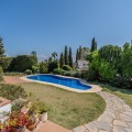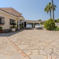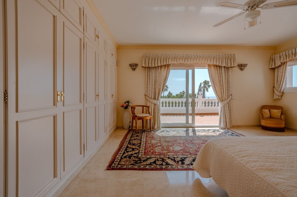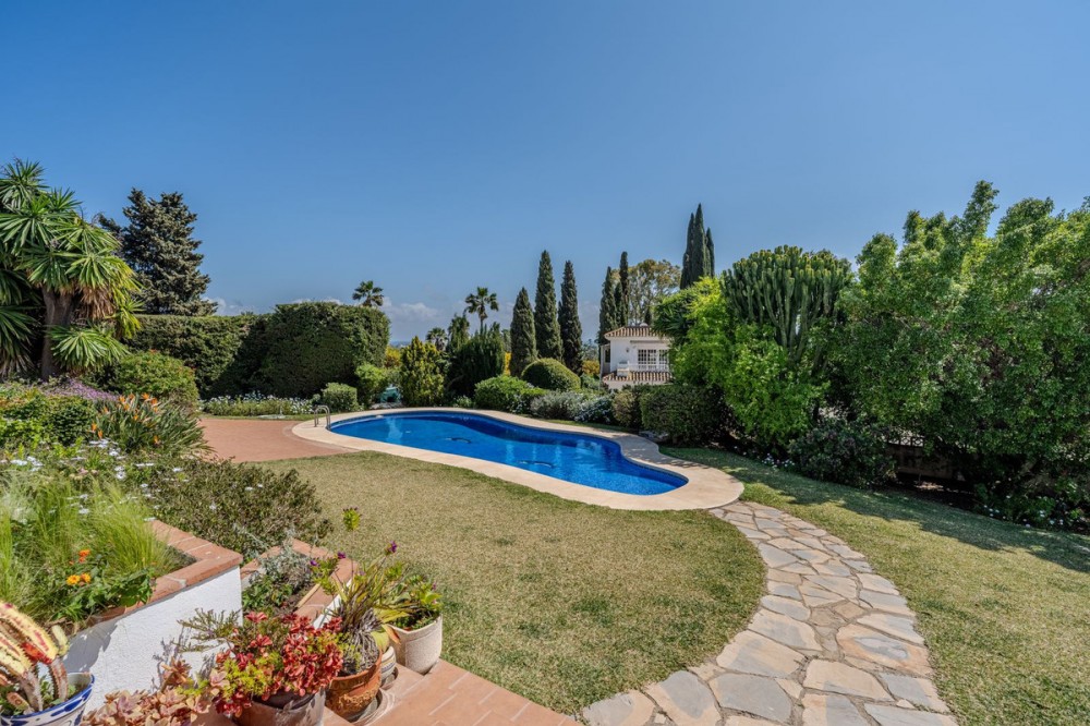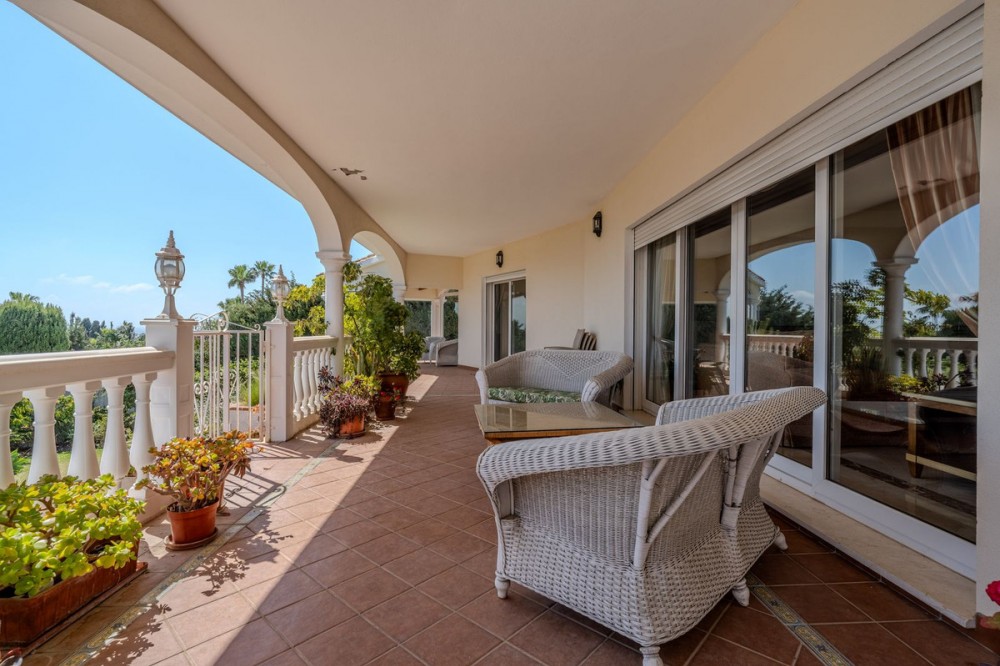 - Nestled in the heart of El Paraíso Medio, this beautiful five-bedroom, four-bathroom detached villa offers a perfect blend of timeless Andalusian charm and modern comfort, all within easy walking distance of local amenities. Designed in the classic architectural style that defines the area, the villa enjoys an elevated դիրction with breathtaking panoramic coastal views—best appreciated from the impressive first-floor master suite and its private wraparound terrace. The ground floor is exceptionally spacious and thoughtfully arranged, centred around a bright open-plan living and dining area bathed in natural light and enhanced by a welcoming fireplace. This elegant space flows seamlessly onto an expansive covered terrace—partially enclosed with glass curtains—allowing for effortless year-round indoor-outdoor living. An additional, more informal family lounge or snug sits adjacent to the main reception area, providing further versatility. The well-appointed kitchen features hardwood cabinetry, a central island, and a charming breakfast area, complemented by a separate laundry room and a practical boot room with direct access to the driveway. Accommodation on this level is both generous and flexible. A spacious guest suite—ideal as an alternative master bedroom—is accompanied by a further en-suite bedroom and two additional guest bedrooms sharing a well-appointed family bathroom. A guest cloakroom and a versatile office complete this floor. Notably, three of the guest bedrooms and the office are located within a separate wing with its own private entrance, offering excellent flexibility—perfect for hosting guests in complete independence or for running a home business. Upstairs, the expansive master suite provides a true retreat, featuring a dressing room, a luxurious en-suite bathroom, a large linen cupboard, and direct access to a private wraparound terrace boasting spectacular sea and coastal views. The exterior is equally impressive, with beautifully landscaped gardens, mature trees, and a private freeform swimming pool. An extensive driveway provides ample parking for multiple vehicles, while a double garage offers further potential, including the possibility of creating a first-floor guest apartment. An additional single garage is ideal for a golf buggy or garden storage. Combining sustainability with comfort, the villa benefits from excellent energy efficiency, with solar panels, aero thermal heating system and a water storage system installed by the current owners. While there is air conditioning and underfloor heating the desirable south-facing orientation ensures warmth and natural light year-round. A truly exceptional home in one of the Costa del Sol’s most sought-after residential areas.