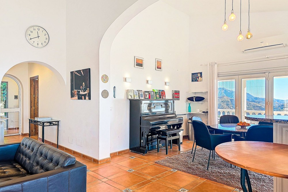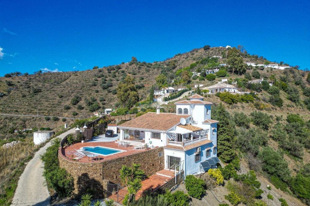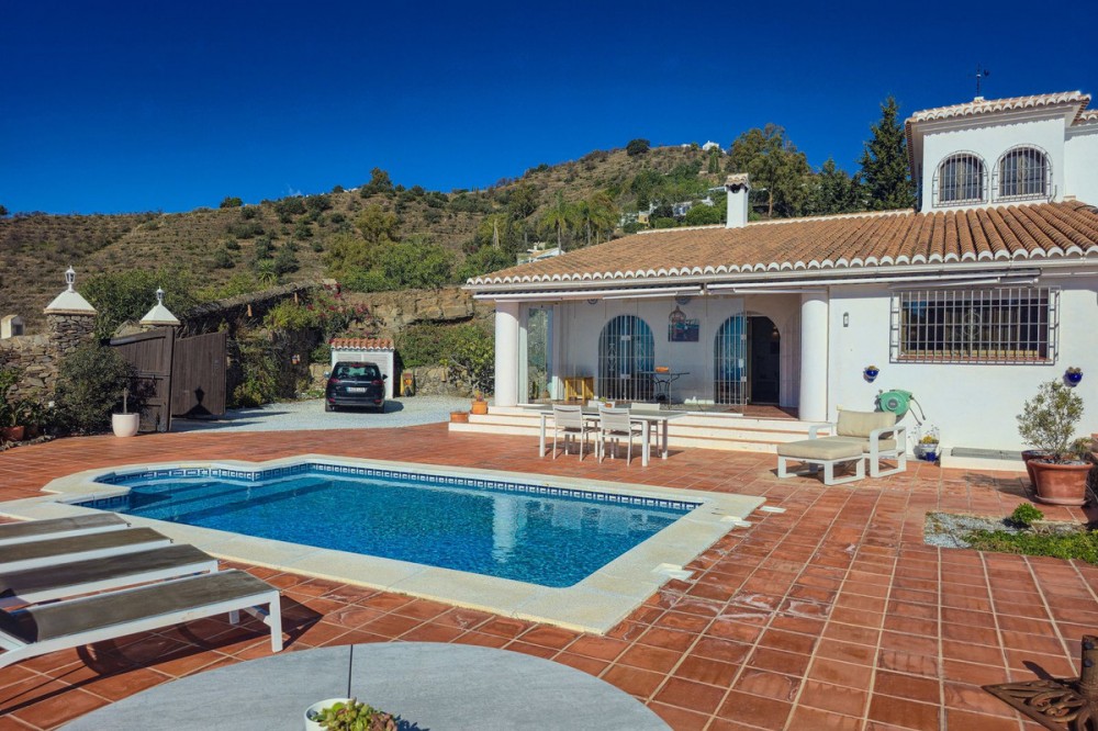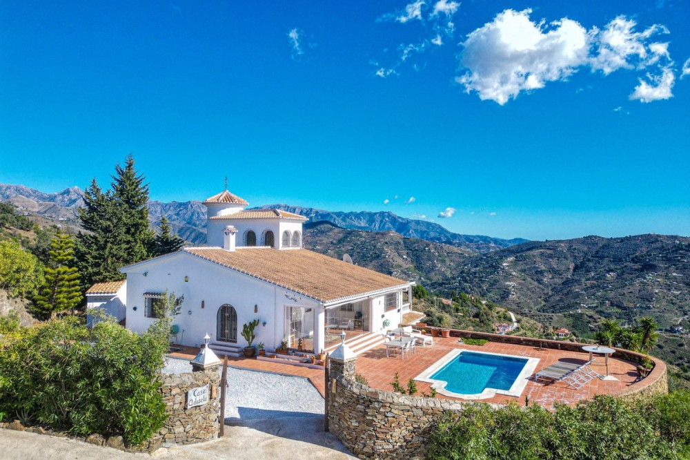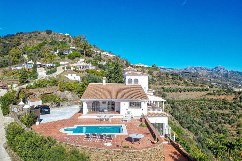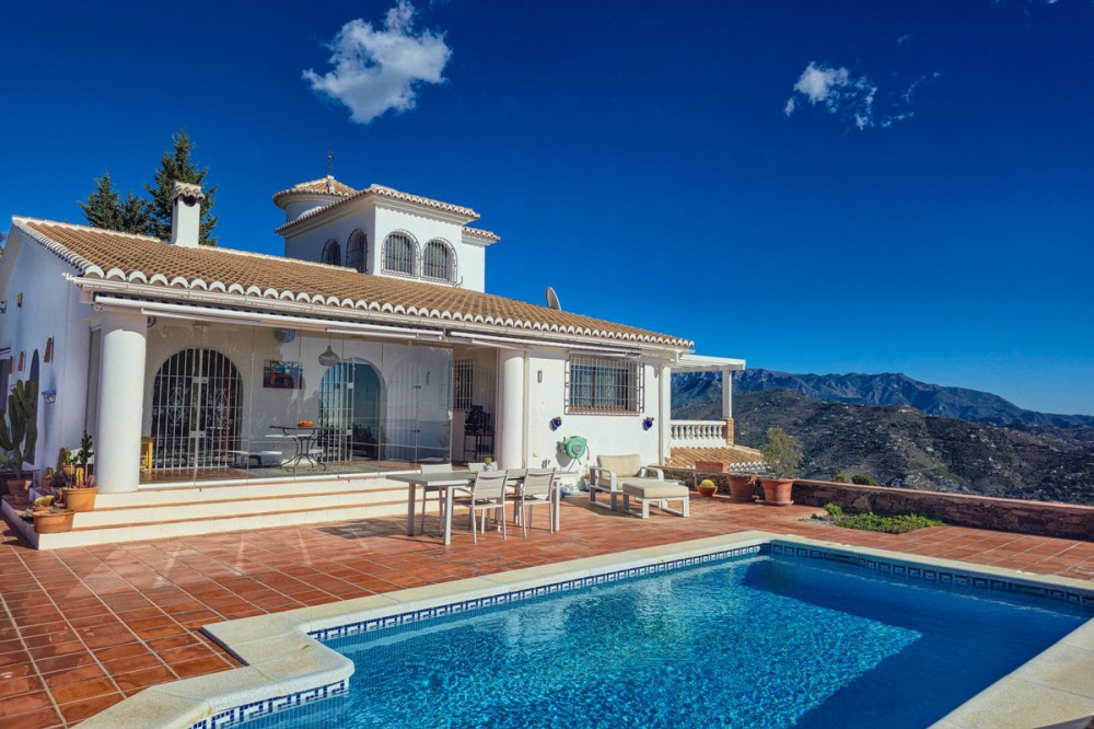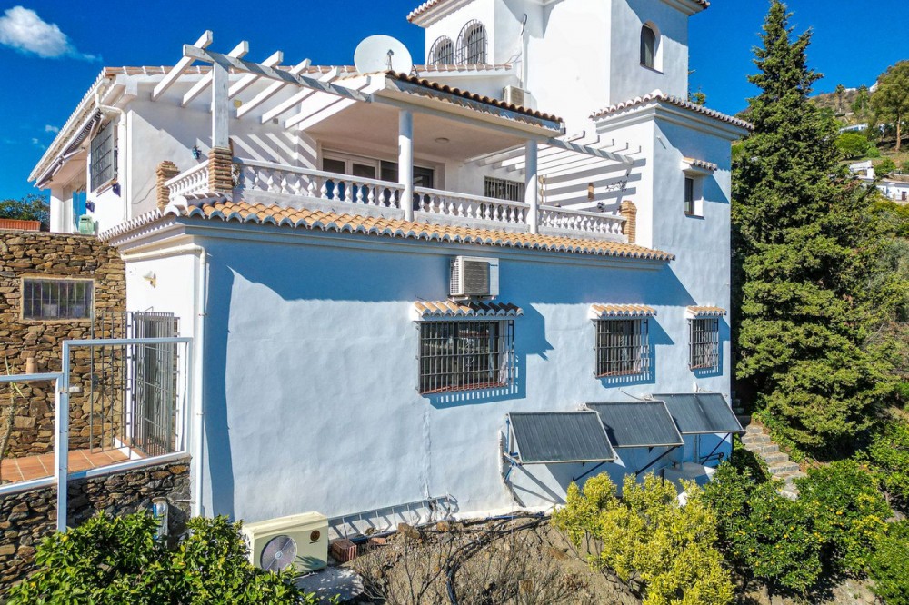 - Exclusive Villa in Sayalonga – Panoramic Sea & Mountain Views Discover this exceptional luxury villa in Sayalonga, perfectly positioned just 30 minutes from the coast and 50 minutes from Málaga Airport. Offering breathtaking panoramic views, premium finishes, and a fully independent guest unit, this property blends comfort, privacy, and investment potential. Main Residence – Designed for Living & Entertaining Step into a spacious open-plan living area combining a bright lounge, elegant dining space, and a fully equipped modern kitchen (dishwasher, fridge, freezer, gas hob, and oven). Enjoy year-round comfort with air conditioning, gas central heating, and a charming fireplace with fan—perfect for cozy evenings. Bedrooms – Comfort & Privacy Master Suite: Private dressing room and luxurious en-suite bathroom with bath, shower, double sink, and toilet Second Suite: Built-in wardrobes and en-suite bathroom with shower Tower Room (3rd Bedroom): Unique space with en-suite bathroom, fitted wardrobe, and spectacular elevated views All bedrooms are equipped with air conditioning for maximum comfort. Independent Guest Unit – Flexible & Private A fully self-contained lower-level apartment with separate front and rear entrances and its own sun terrace. Includes an open-plan living area with air conditioning and central heating, a kitchen (electric hob and refrigerator), bathroom with walk-in shower, and two spacious bedrooms (with potential for a third). Ideal for hosting guests, extended family, or generating high-quality rental income. Outdoor Living & Premium Features Heated saltwater swimming pool (6.5 × 4 m) with automatic pH system Beautiful grounds with approximately 60 fruit trees and irrigation system Solar-powered hot water (3 panels) Water share + 10,000L reserve tank Vaillant gas boiler Storage and laundry room Yamaha 450 4x4 quad bike included A Rare Opportunity This is a unique, move-in-ready villa offering privacy, luxury, and versatility. Whether as a permanent family home, exclusive holiday retreat, or investment property, it delivers exceptional value in one of Andalusia’s most sought-after locations. Contact us today to arrange a viewing.