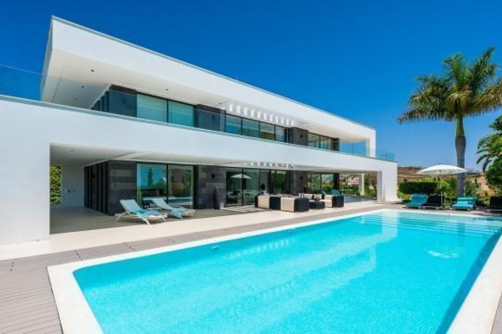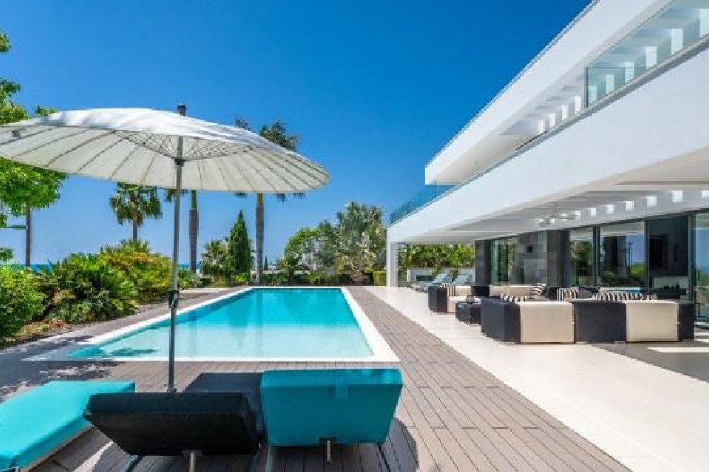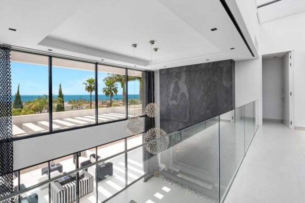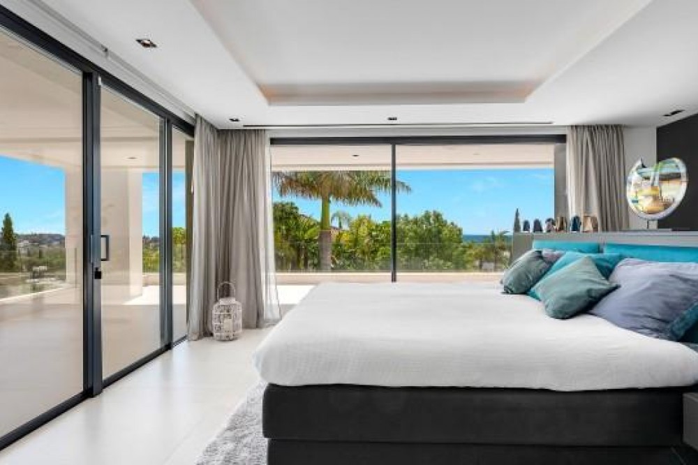 - Welkom in deze spectaculaire luxe villa met zes slaapkamers, verdeeld over drie ruime verdiepingen, gelegen in een gewilde enclave aan de westkant van Marbella. Met een panoramisch uitzicht over de Middellandse Zee en het weelderige groene landschap van de drie omliggende golfbanen, biedt deze uitzonderlijke woning zowel verfijnde architectuur als een superieure levensstandaard. Een ruime hal introduceert de woning, waar een elegante indeling elke verdieping definieert. De begane grond heeft een dramatisch dubbelhoog plafond in de woonkamer, wat een grootse maar uitnodigende sfeer creëert. De lounge staat in direct contact met een ruim L-vormig terras, waar een houten vlonder een sereen zwembad omringt, allemaal ontworpen om het buitenleven te maximaliseren. Een formele eetruimte vloeit natuurlijk over in de woonkamer, waarbij de open indeling doorloopt in een moderne keuken met hoogwaardige Gaggenau-apparatuur en strakke afwerkingen. Op deze verdieping bevindt zich ook een goed ingerichte gastenslaapkamer met eigen badkamer, uitzicht op zee en directe toegang tot het terras, evenals een extra badkamer voor gasten. Op de bovenste verdieping bieden een junior suite en de elegante hoofdslaapkamer een verheven toevluchtsoord. De hoofdsuite beschikt over een royale inloopkast, een luxe en-suite badkamer en toegang tot een privébalkon met een prachtig, vrij uitzicht. Beide slaapkamers op deze verdieping hebben een buitenterras, wat het gevoel van ruimte en exclusiviteit versterkt. De benedenverdieping met twee extra slaapkamers biedt privacy en flexibiliteit. Beide suites hebben een eigen badkamer en een hoekligging, ideaal voor familieleden of gasten. Een volledig onafhankelijk gastenappartement met één slaapkamer, een kitchenette en een woonkamer, een privéterras met uitzicht op de golfbaan en een eigen ingang - perfect voor een uitgebreide familie, gasten of personeel. Een privéfitnessruimte versterkt het welzijn thuis, terwijl de directe toegang tot een garage voor meerdere voertuigen zorgt voor een soepel dagelijks leven. De voorzieningen van de villa zijn uitgebreid: een privéfitnessruimte, elegante spafaciliteiten met hoogwaardige afwerkingen en geavanceerde beveiligingssystemen zorgen voor zowel comfort als gemoedsrust. Gelegen in een beveiligde, afgesloten community met slechts 50 exclusieve woningen, biedt de residentie gemakkelijke toegang tot het prestigieuze 5-sterrenhotel, toonaangevende internationale scholen, uitstekende restaurants en essentiële voorzieningen. De bruisende steden Marbella, Estepona en de beroemde jachthaven van Puerto Banús zijn allemaal binnen handbereik, waardoor dit een toplocatie is voor zowel residentie als investering.