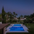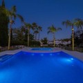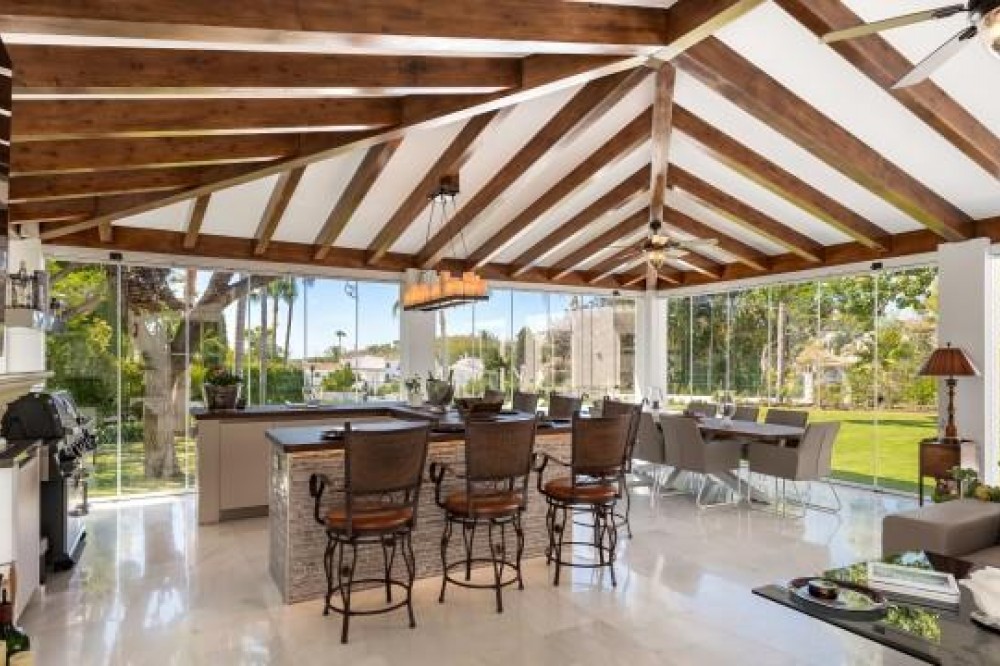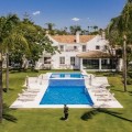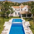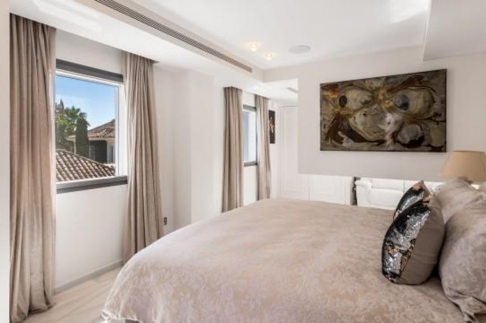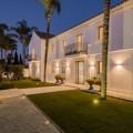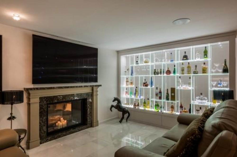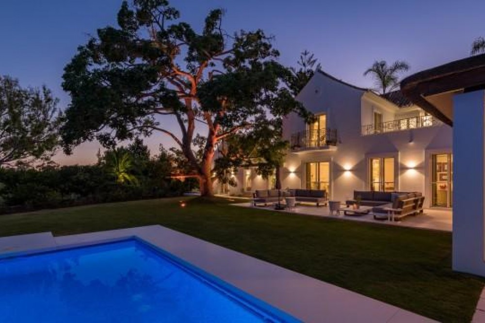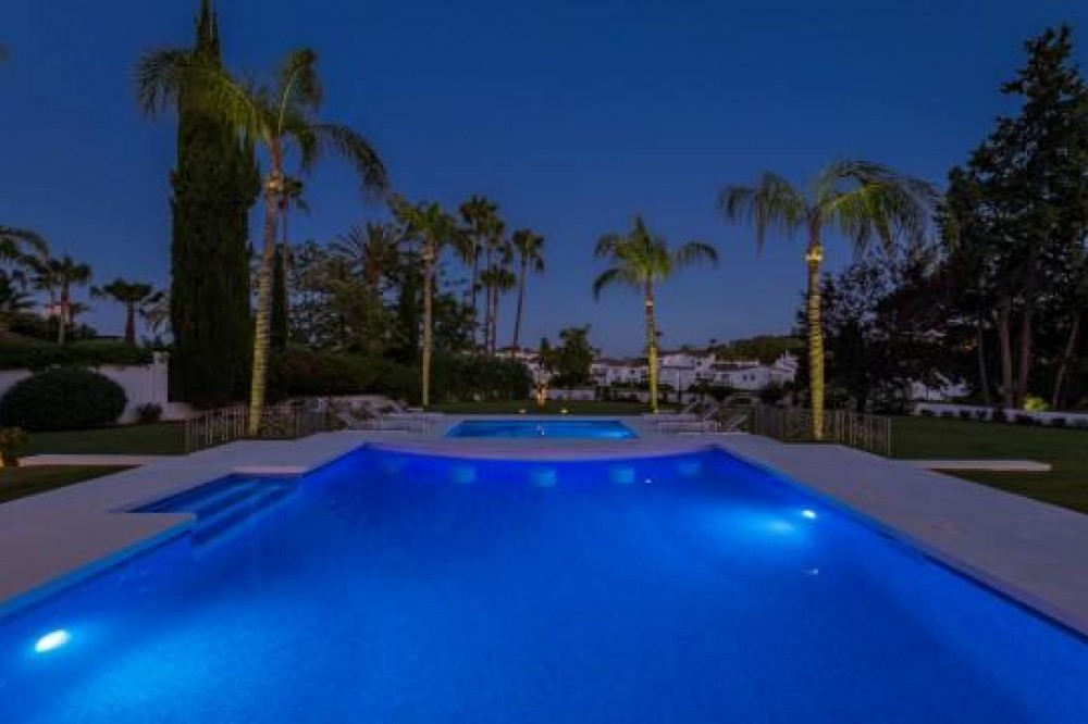 - Deze elegante luxe villa is gelegen op een ruim perceel van 2.671 m² in een van de meest prestigieuze woonwijken van Nueva Andalucía en biedt een verfijnde mix van architectonisch karakter, royale afmetingen en een uitzonderlijke buitenruimte. De woning beschikt over zes ruime slaapkamers, die allemaal zorgvuldig zijn gepositioneerd om te genieten van privacy en een weelderig groen uitzicht. Een opvallende verticale tuin scheidt de slaapvleugel van de woonruimtes en creëert een serene sfeer in het hele huis. Voor extra gemak verbindt een privétrap de carport direct met de slaapverdieping, waardoor discreet en gemakkelijk toegang mogelijk is zonder door de woonruimtes te hoeven lopen. De hoofdwoning is zowel stijlvol als uitnodigend, met een elegante open haard als middelpunt en aangevuld met op maat gemaakte planken met sfeerverlichting en zorgvuldig geselecteerde kunstwerken. Een aparte formele eetkamer biedt een elegante setting voor het ontvangen van gasten, compleet met een grote houten eettafel, gestoffeerde stoelen, twee kroonluchters en een eigen open haard. De moderne keuken is volledig uitgerust met hoogwaardige apparatuur, taupekleurige kasten, donkere stenen werkbladen en een kookeiland. Een aangrenzende informele eethoek geeft direct toegang tot de tuin, terwijl een tweede lounge met zichtbare houten balken, een bar en een stenen open haard een ontspannen maar verfijnde sfeer creëert die naadloos overgaat in het terras en het zwembad. Buitenleven is een belangrijk pluspunt van deze villa. De aangelegde tuinen beschikken over perfect onderhouden gazons, volwassen bomen voor privacy en diverse zit- en eethoeken, ontworpen om het hele jaar door van te genieten. Het grote zwembad, compleet met een verhoogd gedeelte en een waterval, vormt het middelpunt van de buitenruimte. Een charmante betegelde binnenplaats met een decoratieve fontein versterkt het gevoel van mediterrane elegantie. Een zeldzaam en zeer gewild kenmerk van deze woning is de directe toegang tot een gerenommeerde golfbaan, met privépaden die breed genoeg zijn voor een golfkarretje – een uitzonderlijk voordeel voor golfliefhebbers. Modern comfort omvat airconditioning en vloerverwarming, individueel regelbaar in elke kamer, waardoor u de temperatuur in het hele huis naar wens kunt regelen. Een uitgebreid smart home-systeem (domotica) integreert naadloos met mobiele apparaten en biedt de mogelijkheid om verlichting, klimaatbeheersing en beveiliging op afstand te beheren. Met zijn royale indeling, aangelegde tuin, geavanceerde technologie en unieke toegang tot de golfbaan, biedt deze villa een uitstekende kans om een luxe gezinswoning of een hoogwaardig investeringsobject te verwerven op een van de meest gewilde locaties van Marbella, dicht bij golfbanen van wereldklasse, stranden en alle essentiële voorzieningen.