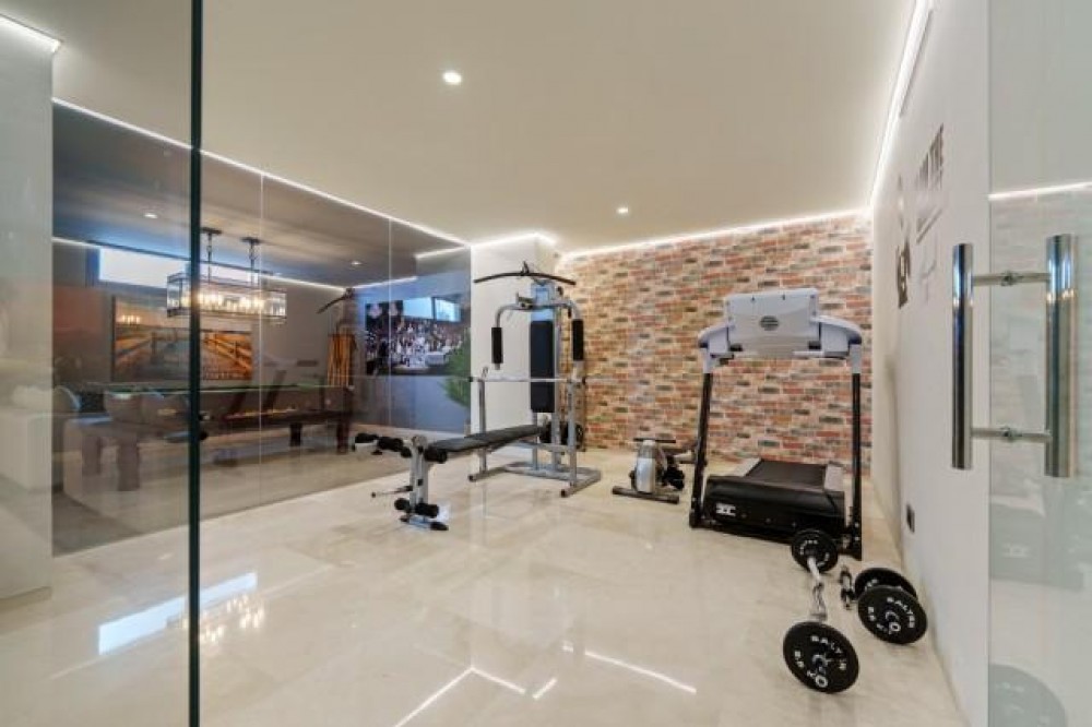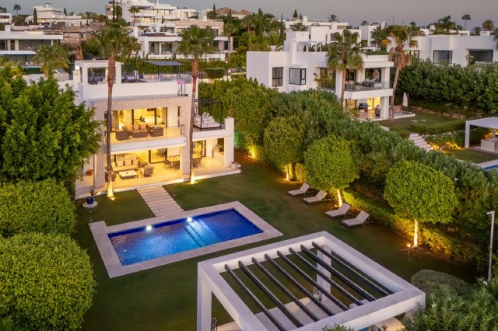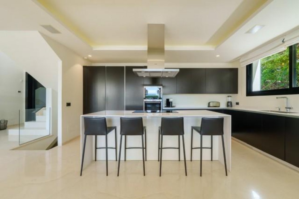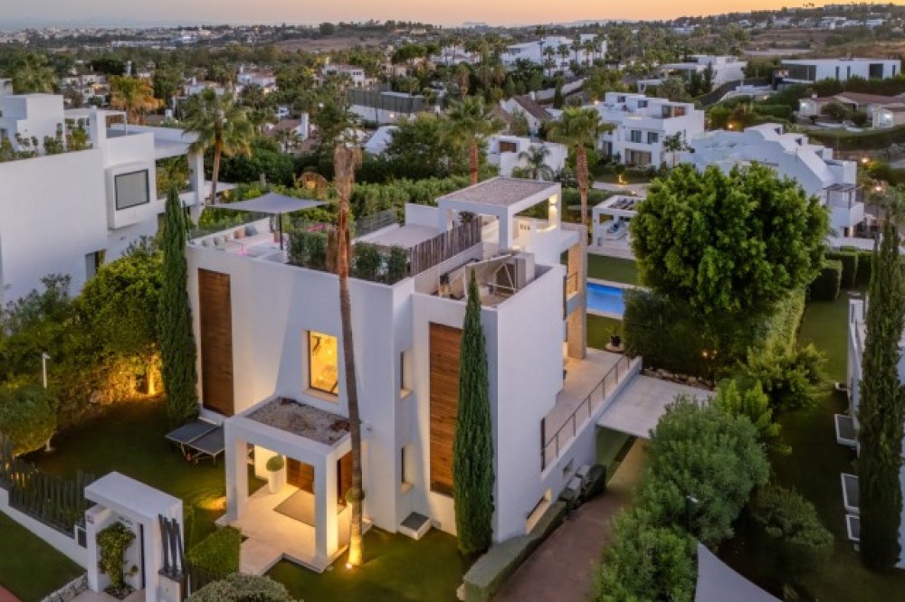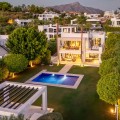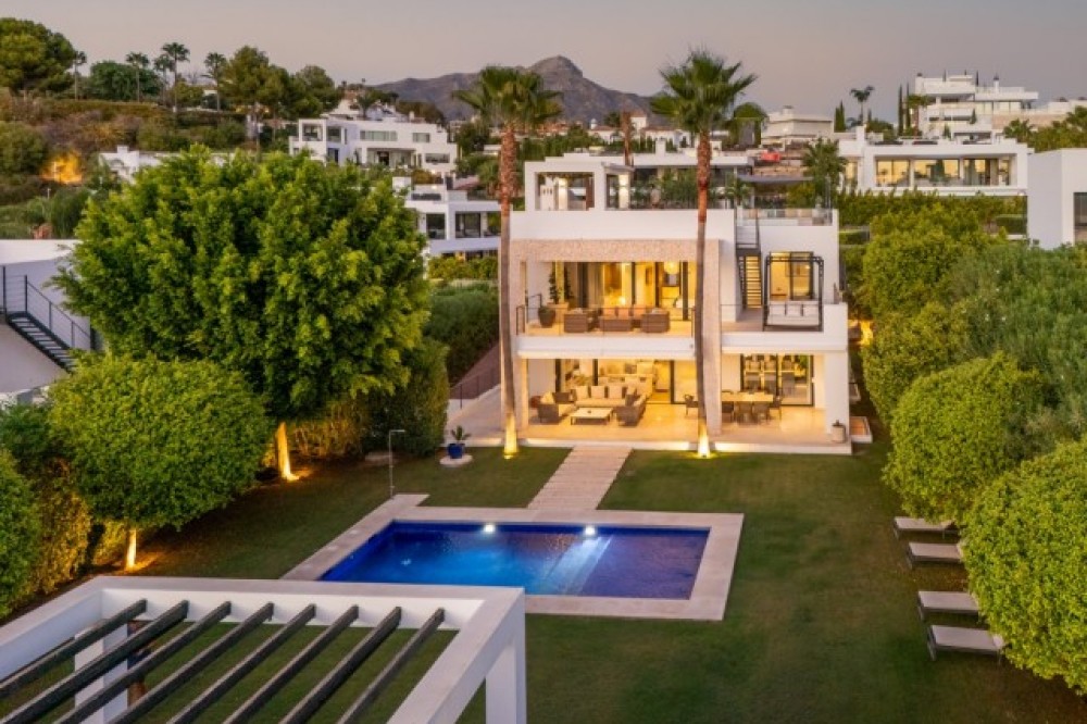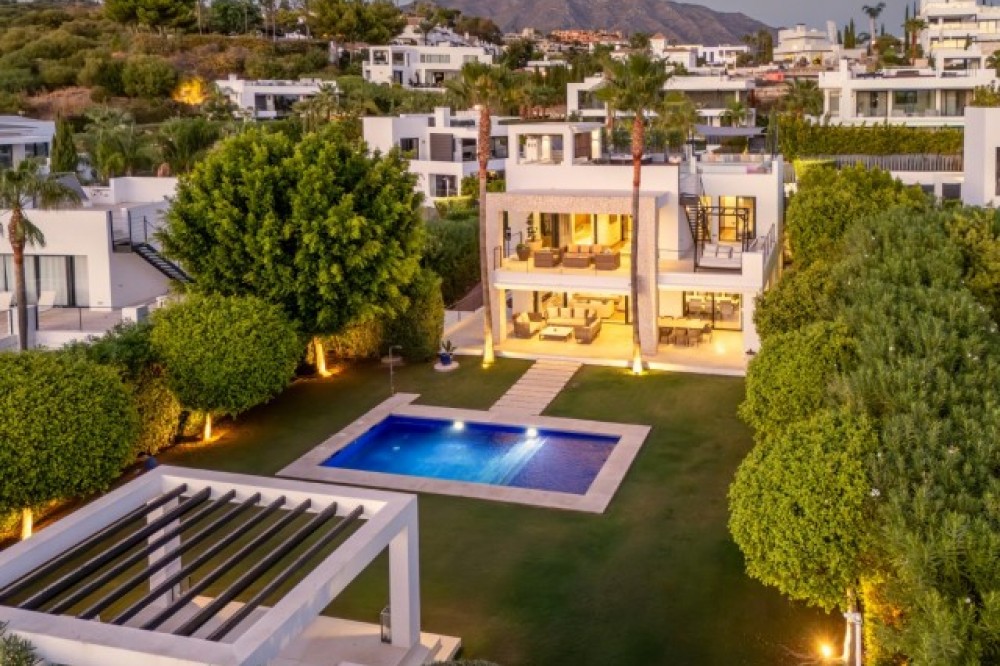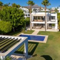 - Deze opvallende, eigentijdse villa is gelegen in een veilige, besloten woongemeenschap in een van de meest gewilde woonwijken van Nueva Andalucía en biedt een elegante balans tussen moderne architectuur, comfort en buitenleven. De woning staat op een ruim perceel van 1.344 m² en is ontworpen voor zowel ontspannen gezinsleven als stijlvol entertainment. De villa is omgeven door een prachtig aangelegde tuin met verzorgde gazons, sierlijke bomen en een charmante pergola die een schaduwrijke buitenlounge creëert. Centraal in de buitenruimte staat een prachtig privézwembad, omlijst door gladde natuurstenen accenten, terwijl het solarium op de bovenverdieping met jacuzzi de perfecte setting biedt voor zonnige middagen en ontspanning bij zonsondergang. Binnen toont de woning een verfijnd, eigentijds design met gepolijste marmeren vloeren, inbouwverlichting en ruime open leefruimtes. De woon- en eetkamer lopen naadloos over in de moderne keuken, afgewerkt met strakke donkere kasten, een groot kookeiland met zitgelegenheid en hoogwaardige inbouwapparatuur. Glazen schuifdeuren van vloer tot plafond verbinden het interieur met een overdekt terras met ingebouwde barbecue, ideaal voor dineren in de buitenlucht en gezellige bijeenkomsten. De entertainmentverdieping biedt een uitzonderlijke woonervaring met een stijlvolle recreatieruimte met een bar op maat, een biljarttafel en een comfortabele zithoek, verfraaid met moderne kunst. Aangrenzend bevindt zich een privé fitnessruimte met glazen wanden en zichtbare bakstenen details, een chique en motiverende omgeving voor dagelijkse trainingen. De ruime master suite is ontworpen als een oase van rust en beschikt over een inloopkast, een luxe en-suite badkamer en directe toegang tot een privéterras, ingericht voor rustige ochtenden of avondontspanning. De overige slaapkamers zijn ruim en bieden privacy en comfort voor zowel familie als gasten. Een privégarage en voldoende parkeergelegenheid op de oprit zorgen voor gemak en veiligheid. Met zijn verfijnde interieur, uitnodigende buitenruimtes en toplocatie biedt deze villa een uitzonderlijke kans om te genieten van modern mediterraan leven op een van de meest gewilde plekken van Marbella.