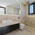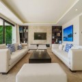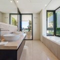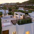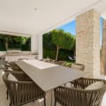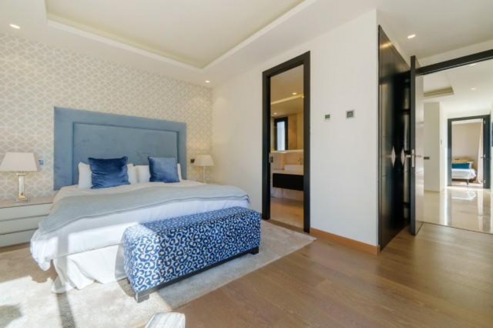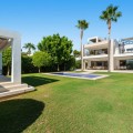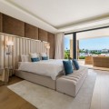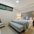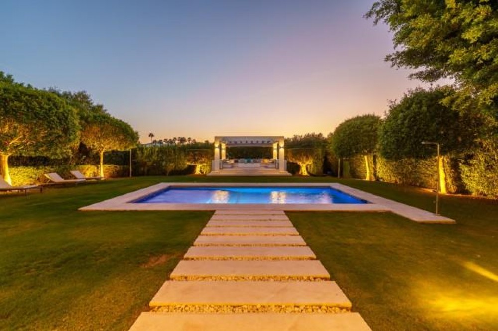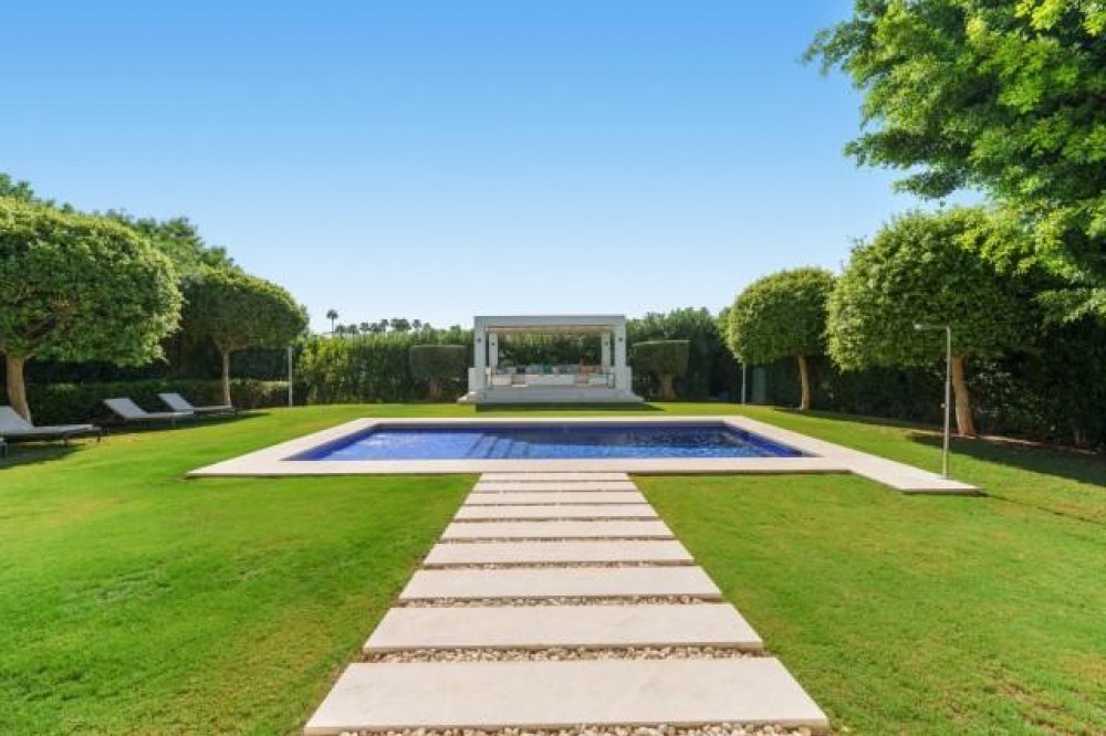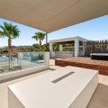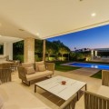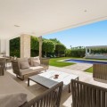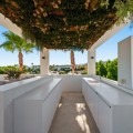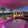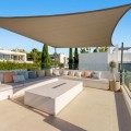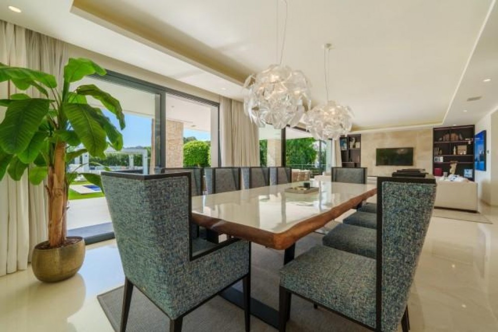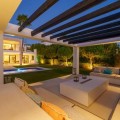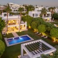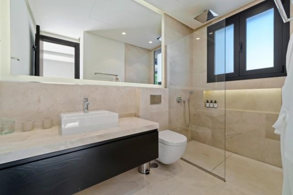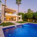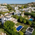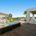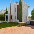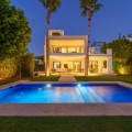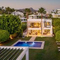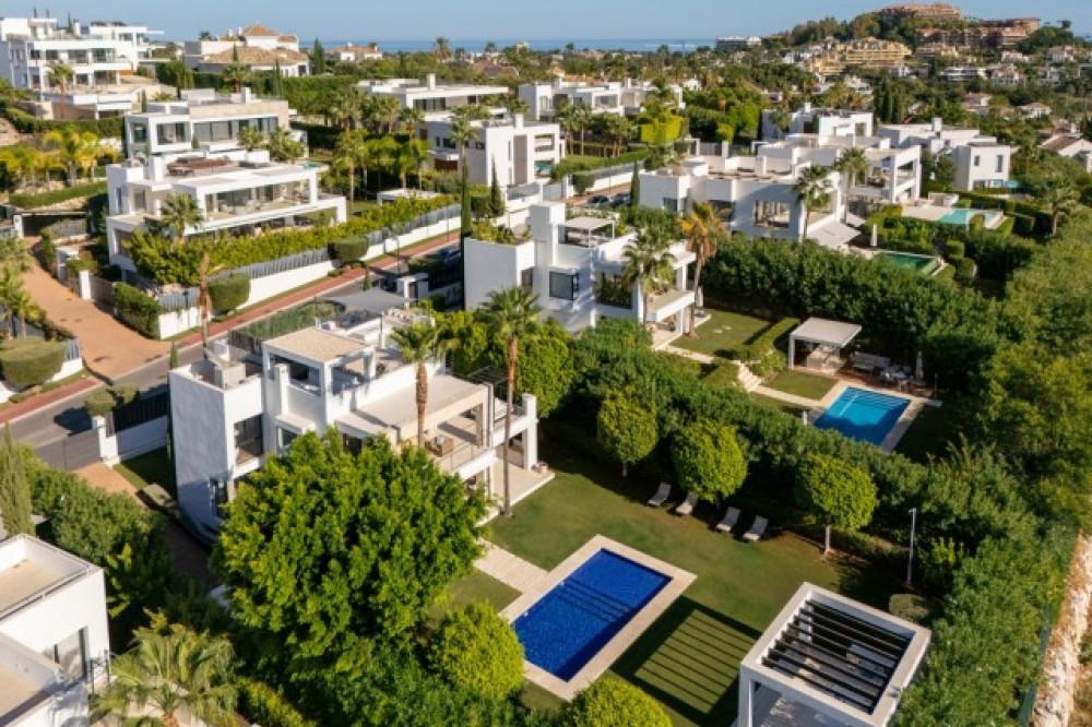 - Deze opvallende, eigentijdse villa is gelegen in een veilige, besloten woongemeenschap in een van de meest gewilde woonwijken van Nueva Andalucía en biedt een elegante balans tussen moderne architectuur, comfort en buitenleven. De woning staat op een ruim perceel van 1.344 m² en is ontworpen voor zowel ontspannen gezinsleven als stijlvol entertainment. De villa is omgeven door een prachtig aangelegde tuin met verzorgde gazons, sierlijke bomen en een charmante pergola die een schaduwrijke buitenlounge creëert. Centraal in de buitenruimte staat een prachtig privézwembad, omlijst door gladde natuurstenen accenten, terwijl het solarium op de bovenverdieping met jacuzzi de perfecte setting biedt voor zonnige middagen en ontspanning bij zonsondergang. Binnen toont de woning een verfijnd, eigentijds design met gepolijste marmeren vloeren, inbouwverlichting en ruime open leefruimtes. De woon- en eetkamer lopen naadloos over in de moderne keuken, afgewerkt met strakke donkere kasten, een groot kookeiland met zitgelegenheid en hoogwaardige inbouwapparatuur. Glazen schuifdeuren van vloer tot plafond verbinden het interieur met een overdekt terras met ingebouwde barbecue, ideaal voor dineren in de buitenlucht en gezellige bijeenkomsten. De entertainmentverdieping biedt een uitzonderlijke woonervaring met een stijlvolle recreatieruimte met een bar op maat, een biljarttafel en een comfortabele zithoek, verfraaid met moderne kunst. Aangrenzend bevindt zich een privé fitnessruimte met glazen wanden en zichtbare bakstenen details, een chique en motiverende omgeving voor dagelijkse trainingen. De ruime master suite is ontworpen als een oase van rust en beschikt over een inloopkast, een luxe en-suite badkamer en directe toegang tot een privéterras, ingericht voor rustige ochtenden of avondontspanning. De overige slaapkamers zijn ruim en bieden privacy en comfort voor zowel familie als gasten. Een privégarage en voldoende parkeergelegenheid op de oprit zorgen voor gemak en veiligheid. Met zijn verfijnde interieur, uitnodigende buitenruimtes en toplocatie biedt deze villa een uitzonderlijke kans om te genieten van modern mediterraan leven op een van de meest gewilde plekken van Marbella.