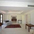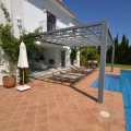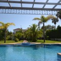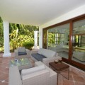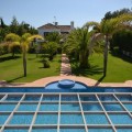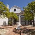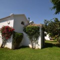 • Beautiful cortijo style villa set in the prestigious golf estate of Guadalmina Baja, within walking distance to the beach and close to a SPA hotel, international schools and the commercial centre of Guadalmina with shops, bars, and restaurants. This Andalusian-style home consists of a main house, a pool house and a private padel tennis court. The house offers a lovely entrance area, with Spanish patio with orange trees surrounding a fountain approaching the main house, which consists of an entrance hall with staircase leading up to the upper floor, continuing towards the living room with fireplace, a fitted kitchen with working island on the right hand side with dining room, adjacent laundry room and staff accommodation. The living room has exit to a covered terrace and the beautiful garden. Two double bedrooms, with en suite bathrooms and a further sitting room with fireplace are on the left hand side of the entrance area, also with exit to the terrace and garden. Upstairs the master suite incorporates a walk-in wardrobe, an en-suite bathroom with bathtub and shower plus a private terrace with views over the pool area and garden and there is a further bedroom with en-suite bathroom and guest toilet. A double garage completes this house. There is a mature garden with large pool and a private paddle- court. The guest / pool house offers a guest toilet, BBQ area and shower and a guest suite, with living/dining room, kitchenette and bedroom on the upper floor.