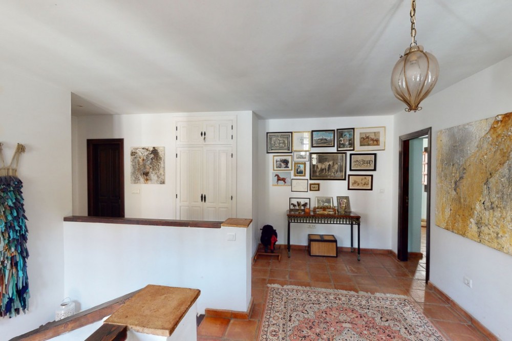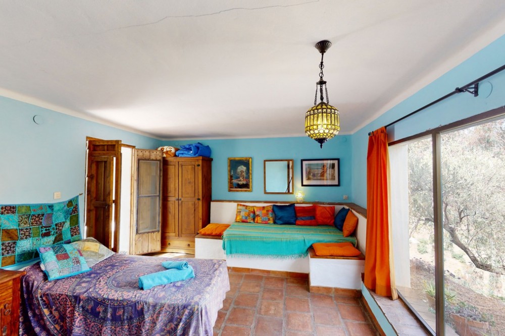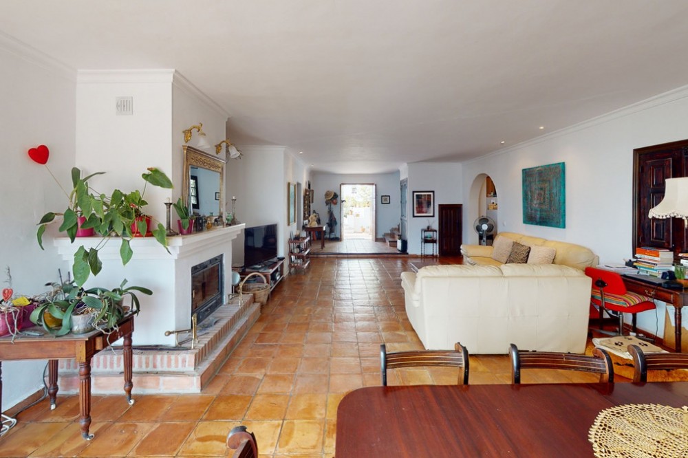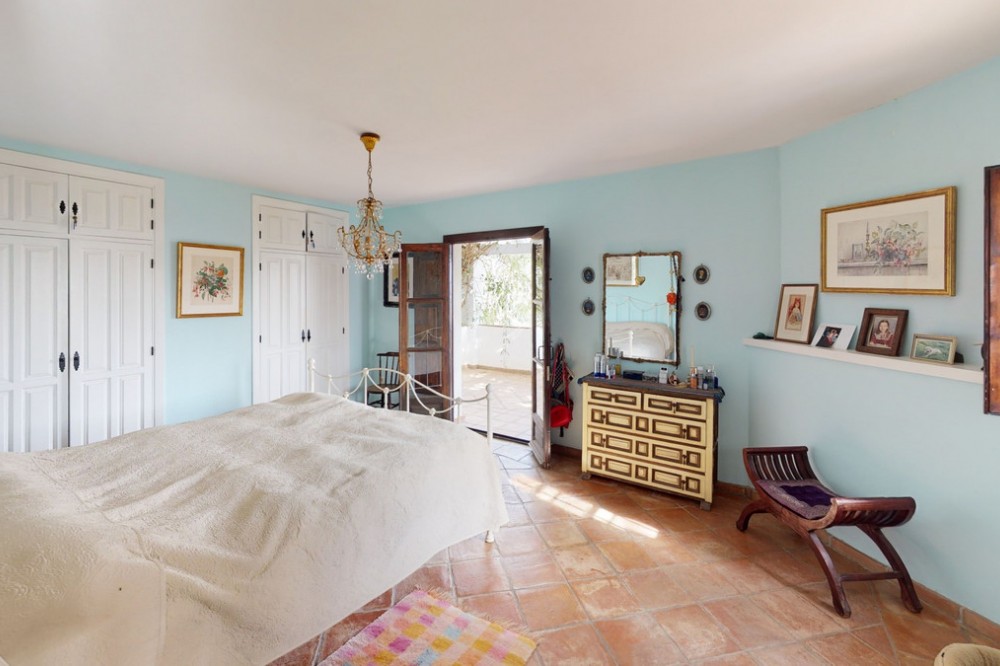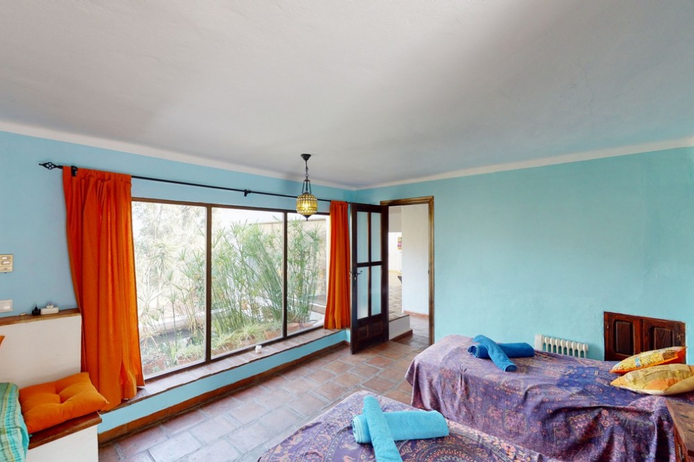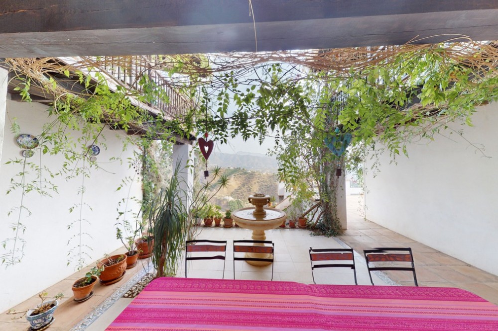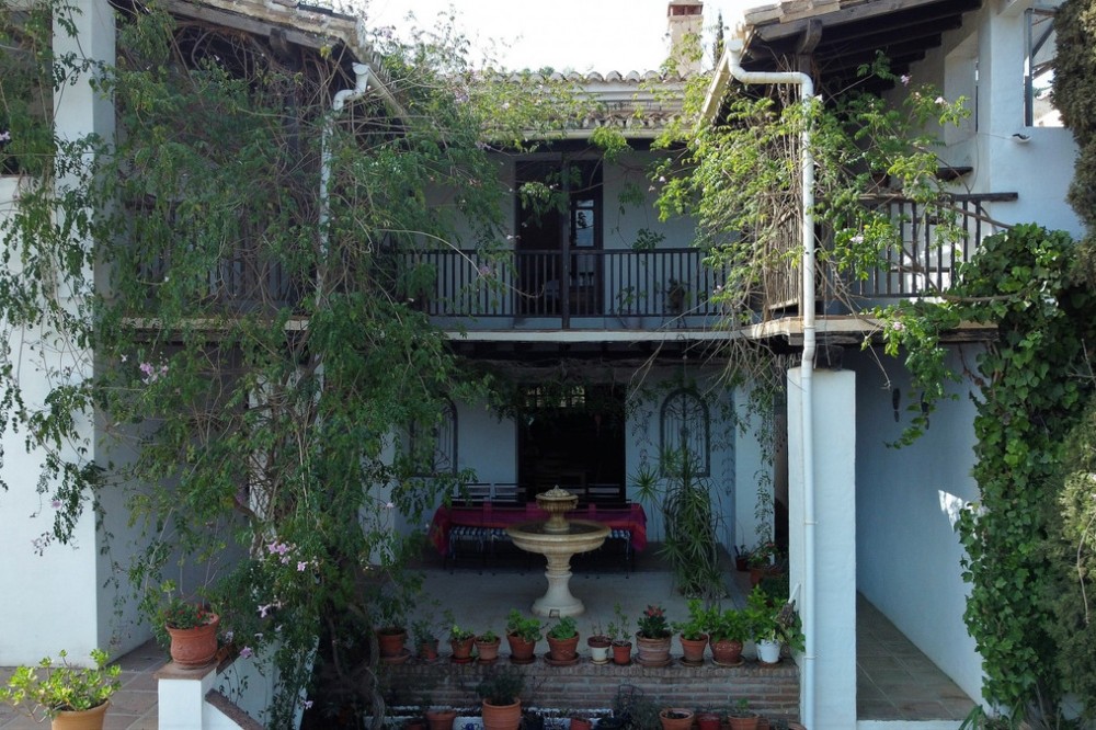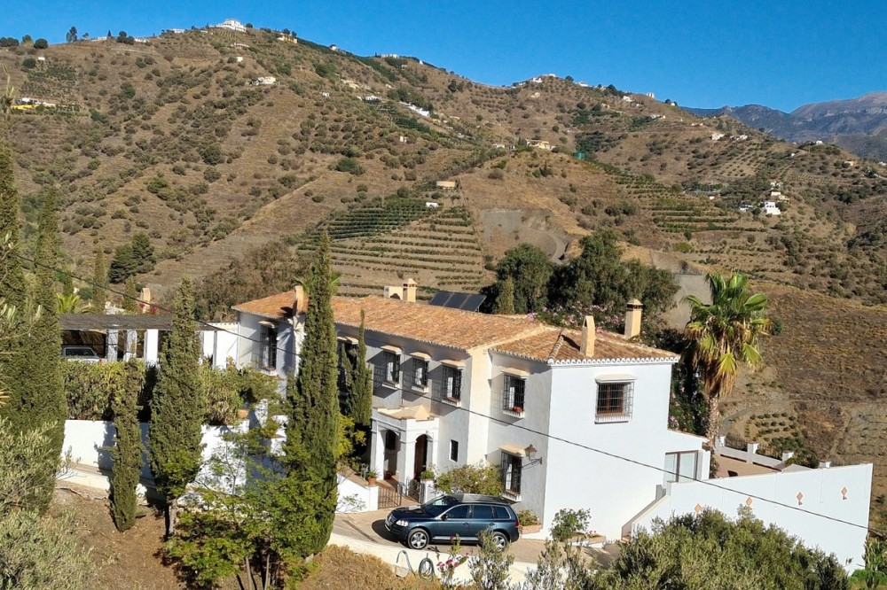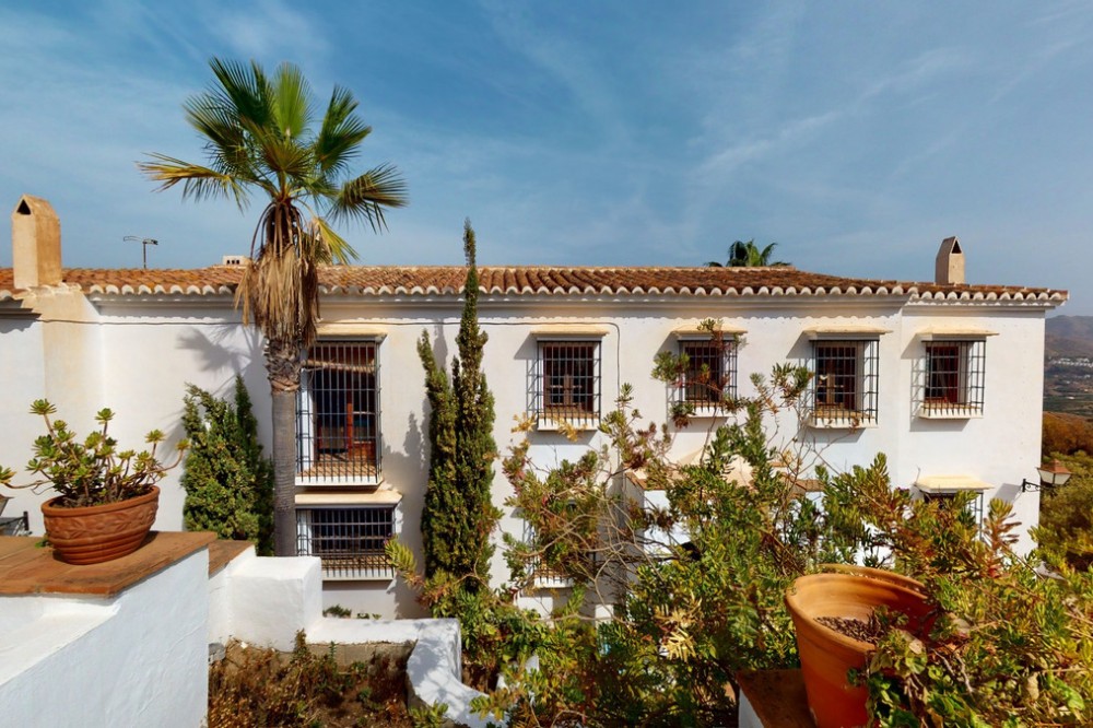 • Are you looking for an oasis in harmony with nature? A place of peace and relaxation, where time runs a little slower? Yes?! Then we would like to show you this fantastic villa, in the mountains of Torrox. It offers an imposing, grand main house, a separate, small guest house and a pool, as well as 5,569 m2 of land, which is predominantly flat and thus offers countless possibilities. The layout of the property makes it possible to use the main house as two independent living units, with separate entrances. This fabulous property is perfect as a multi-family home, B&B or as an investment opportunity for a yoga center, event location, dance school or meditation temple.... An almost completely paved driveway leads you to a concrete parking area, which is partially covered. On this level is the charming guest cottage with its own covered terrace. It is equipped with a cozy, open living/dining area with a bed, a kitchen and a bathroom. The fireplace provides comfortable warmth in the cooler months. A driveway, as well as stairs, lead to the lower level. Another heavy wooden door with an iron horse door knocker grants entry into the spacious, imposing living area with fireplace, of the first part of the house. To the right is a guest toilet. Next to this is a room which is currently used as an office/library. It can also be heated to a comfortable temperature in the cooler seasons with the fireplace. We have adjacent a small, glazed room from which you can enjoy the view of the surrounding countryside. The large terrace at the front of the house offers breathtaking views of the famous white village of Frigiliana and the Sierra de Tejada in the background. Thanks to the hillside location, the hollow space under this terrace can still be closed and create more living space, if needed. From the living room, also with access to the terrace, one enters the spacious open kitchen with dining area. The interplay of traditional and modern has been perfectly achieved here. A glass patio door leads to the beautiful u-shaped and typical Andalusian courtyard with a fountain. On the second floor of the house there are three bedrooms and two bathrooms. The master bedroom has a large, modern bathroom with its own sauna, as well as a bathtub and shower. From two of the bedrooms there is access to an enchanted u-shaped balcony with views down into the Andalusian courtyard. Its wooden beams and plantings make it feel like you've stepped into another era. A corridor leads from this balcony to the second part of the house. On the second floor there is a bedroom with another fireplace, called the Sunroom because of its wall color. A staircase leads down to a huge open space with a large flat skylight that lets in natural light. The space can be used for a wide variety of possibilities. As a dance studio, atelier, or conference room. A feel-good temperature can also be created here with a great fireplace. On this level we also have a large heavy wooden door, the separate entrance to this part of the house. Right next to the entrance area there is a fully equipped bathroom. Through an open arch you enter a living area with a small, charming kitchen. Through almost floor-to-ceiling windows, you look out onto an idyllic pond and out into the countryside. There is another bathroom and two bedrooms, both with access to the outdoor area. The outdoor area includes a pool, many terraces with seating, a small vegetable garden and some olive trees. The bodega, or wine cellar, adds the finishing touches to the mansion and guarantees the right temperature for your wine. We are pleased to be able to present this dream property to you soon, either personally or via virtual viewing. Because this world, it is unique - just like our Axarquía. In Andalusia. On the Costa del Sol. Here, on the sunny side of life...
