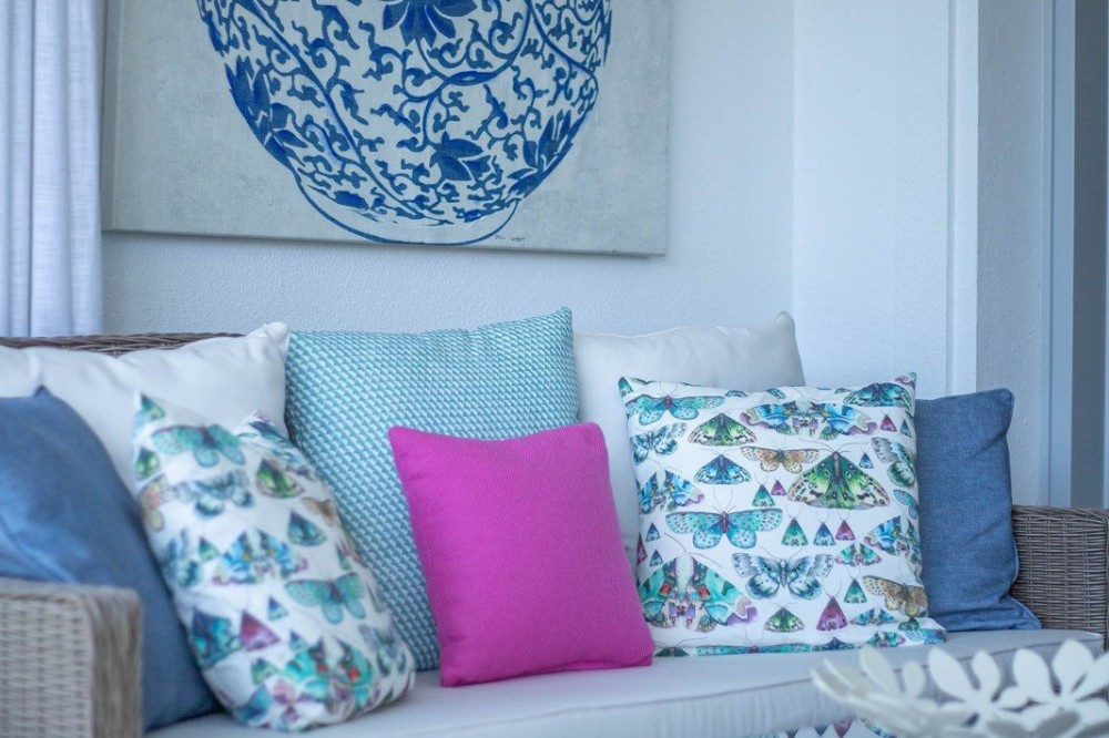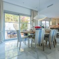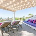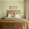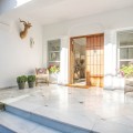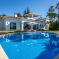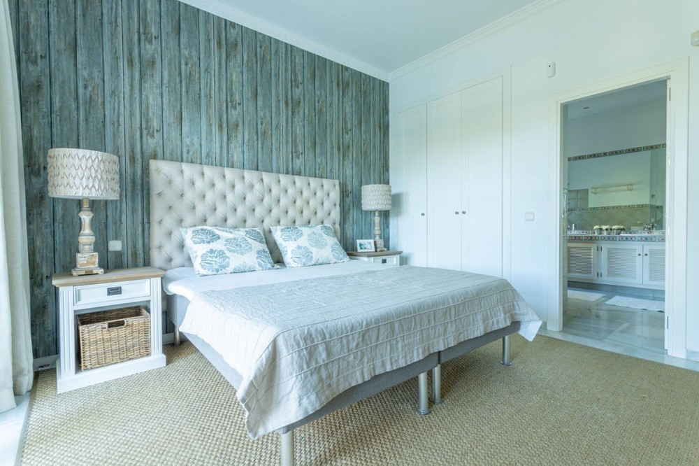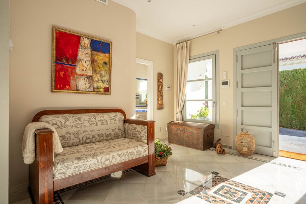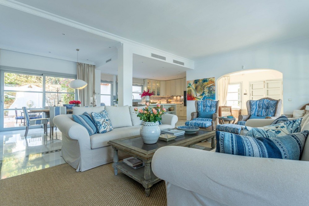 - FOR SALE: This one level villa is located in the heart of Sierra Blanca, Marbella – one of the most prestigious areas in southern Spain. With its 4 bedrooms and 4 bathrooms it can accommodate up to 8 guests who get spoiled by a perfectly maintained garden who lovingly embraces the pool in front of the house, as well as a particular charming interior design that combines harmoniously the Scandinavian soul of the owner with international art pieces. The interiors are accessed via a spacious foyer with lots of sunlight. From here you will find a bedroom with double bed and its own bathroom with shower and bath tube on the left hand side. The bedroom is characterized by floor-to-ceiling windows for plenty of natural light in the room, as well as a desk and a TV. On the right hand side of the foyer you will find a particular coloured bathroom for guests. In the further course the central area of the house opens up with living, dining and kitchen area. The floor-to-ceiling windows bring in plenty of natural light. The floor plan is open for a particularly generous feeling of space. The kitchen is equipped with all modern equipment. The dining area is framed by a small library with a collection of international books and from the living area with fireplace you access the covered terrace. This area is divided into a lounge area and an alfresco dining area, both with a fantastic view into the garden and the pool area. The west wing of the house has 1 master bedroom with direct access to the garden and an en suite bathroom with bathtub and shower. Two further bedrooms and a bathroom with shower complete the space of the villa. On the north side you will find another alfresco dining area, ideal for barbecues. A very special highlight – the sail-protected sun terrace with sea view can be reached via an external staircase. Ideal to read a book in peace, enjoy the sea view or pursue your own thoughts. The villa is the perfect choice for a family with kids or a group of friends that are looking for a villa with pool in a prestigious area close to Marbella and the beach.