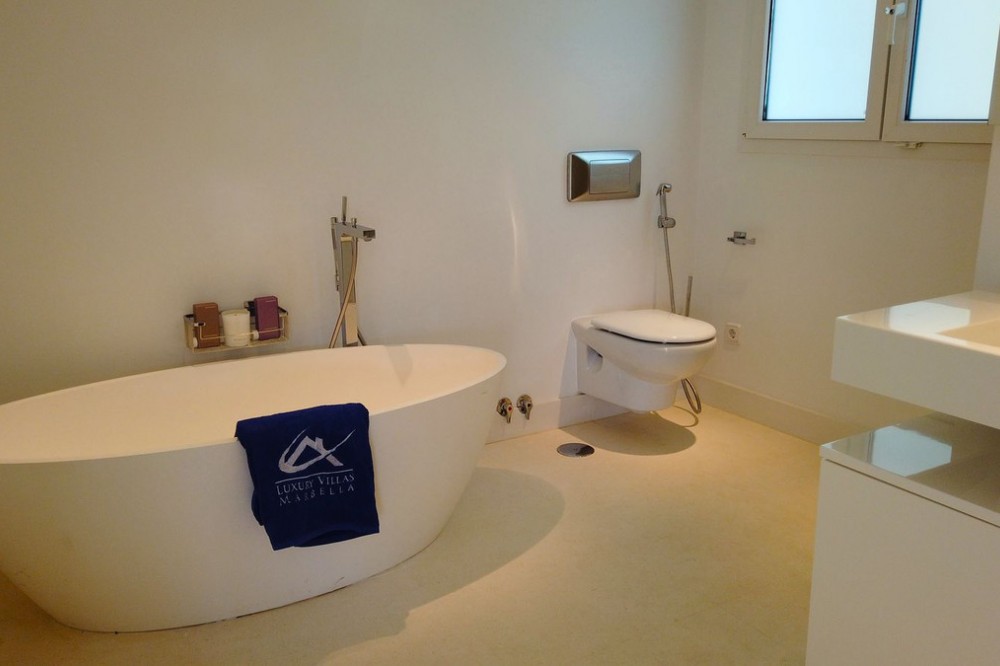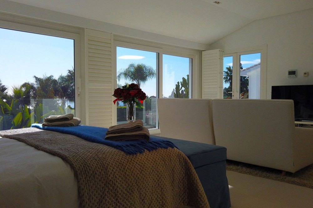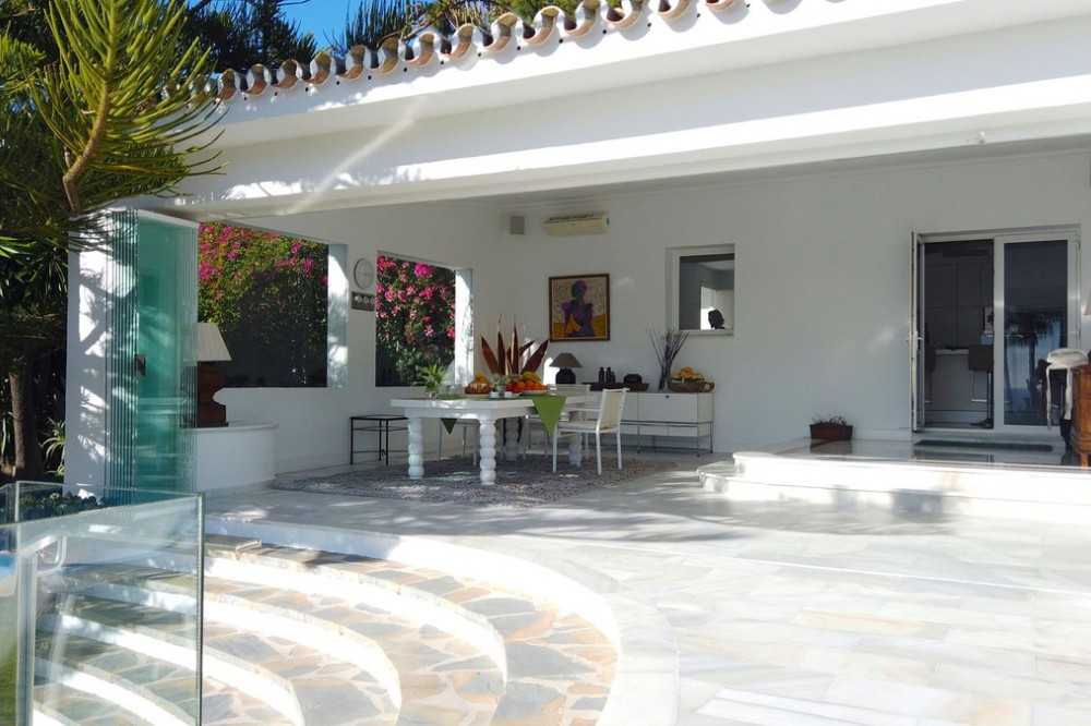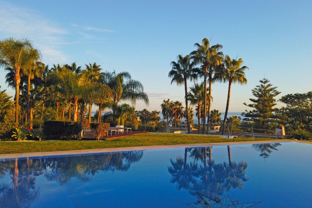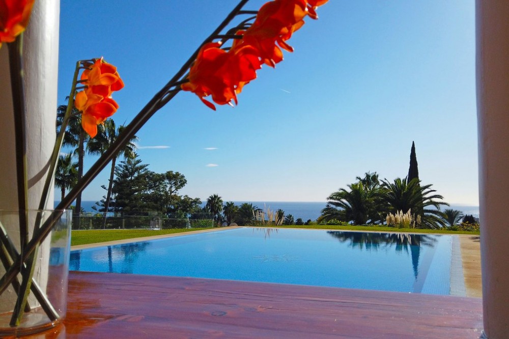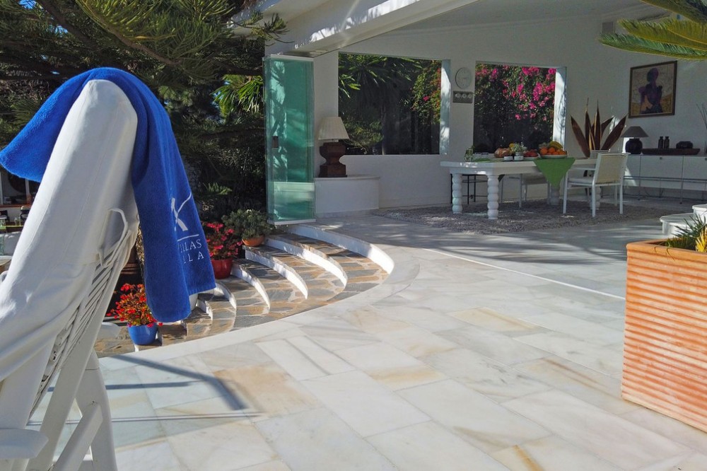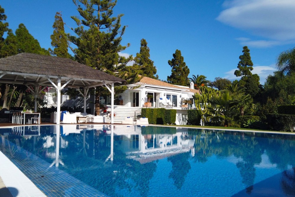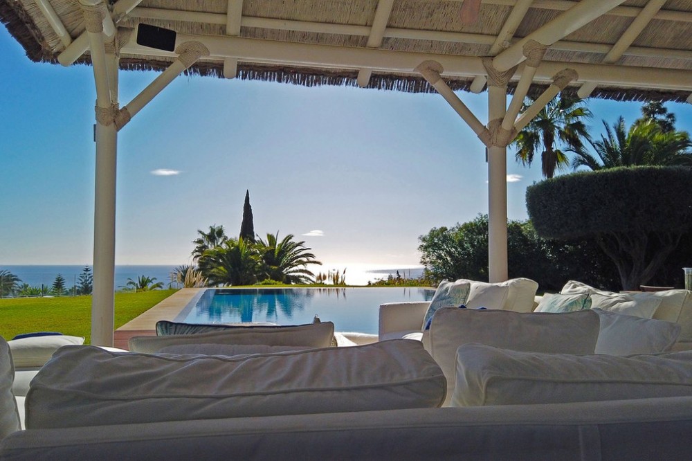 - INVESTORS DREAM Luxury villa set in beautiful tropical gardens with amazing sea views from everywhere. One of east Marbella finest villa, this 7 bedroom 9 bathroom luxury villa has everything you could want, large bright airy rooms all with great views of the gardens then out to sea, beautiful established tropical gardens with a fantastic pool and poolside area. The 12 meter by 7 meter heated, salt water pool is enhanced with a very large bali style bar/kitchen and seating area, sauna and large jacuzzi all with outstanding sea views, a great area for entertaining. The villa has an Ibiza style to it, very big comfortable rooms flowing into each other, all the bedrooms are well thought out with great light and views with the master bedroom taking your breath away, large glass doors leading out to an amazing rap around terrace. The villa is in the middle of one of the best resorts in Marbella, Hacienda Las Chapas with its 24 hour guards, manicured street and great communal areas. Even though this beautiful villa is central to the whole resort, no part of the villa or gardens is overlooked.