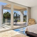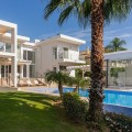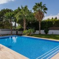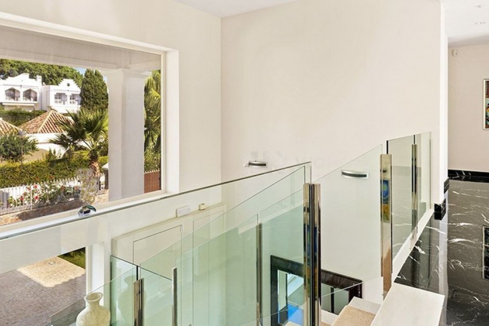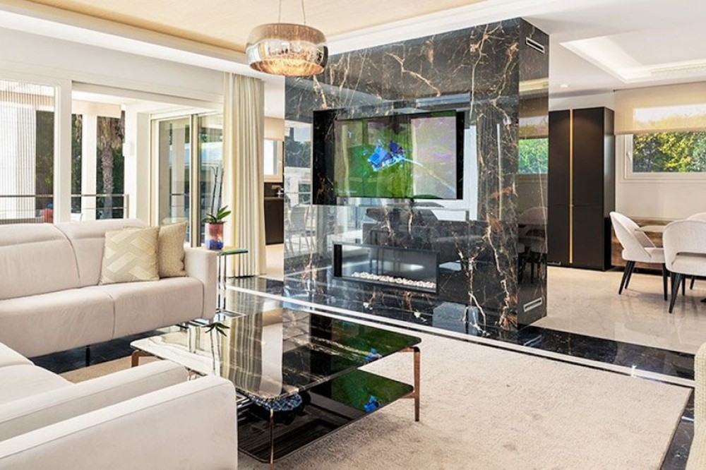 - This newly renovated, seven-bedroom villa nestled on a sprawling 1770m2 plot between Aloha and Las Brisas presents a harmonious blend of sophistication and comfort. Boasting an elevator servicing all three levels, this modern sanctuary unveils an abundance of space and opulence. Step into the grand entrance suffused with natural light, guiding you to an expansive open-plan living area adorned with a sleek fireplace. The heart of this home lies in the newly fitted kitchen, complete with a cooking island doubling as a breakfast bar and seamlessly merging with a dining space for eight. Large sliding doors lead to a sprawling covered terrace overlooking the 15-meter swimming pool, complete with a solar-powered electric cover ensuring year-round comfort. Indulge in outdoor entertaining at the fully equipped covered BBQ area, effortlessly transitioning to an extra living space with foldable glass walls and electric awnings. This haven also boasts two ensuite bedrooms on the ground floor, while the first floor hosts three additional ensuite bedrooms, including the master suite with a walk-in wardrobe and a charming garden-facing terrace. The lower floor beckons with entertainment options—a cinematic experience awaits in the theater room with an 86-inch TV and surround sound, while the garden-view gym inspires fitness. Two more bedrooms, a garage for three cars, and ample parking space complete this exceptional property—a masterpiece awaiting its discerning owner’s touch.