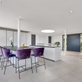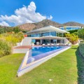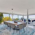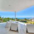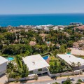 - Contemporary designer villa with breathtaking views towards the sea. The villa comprises of two floors with main entrance on the upper level. From the moment you step through the front door, you are struck by the fantastic view thanks to the floor-to-ceiling glass doors along the whole front side of the house. The upper floor is characterized by an open floor plan that houses a kitchen island, integrated kitchen cabinets, dining area and sofa group. In the middle sits a glass wine cabinet. On this floor is also the master bedroom with bathroom en-suite and private dressing room. Outside the large glass doors is a lovely covered terrace that leads out to a wooden deck and lawn. From the wooden deck, a three-meter-wide staircase leads down to the 67 m2 pool with Jacuzzi. The villa's two floors are connected by the specially designed staircase, which is the jewel of the house. On the lower level there are four bedrooms, each with an en-suite bathroom with glass walls, a guest toilet, a TV-room with a small kitchen and a fireplace, a laundry room and a large double garage. Three of the four bedrooms and the TV-room have access to the wooden deck next to the pool where, in addition to space for sun loungers and a dining table, there is an outdoor kitchen, barbecue and toilet, all protected by roll-up canvas roofs. The villa is equipped with air conditioning, under floor heating, alarms, security cameras, home automation, etc. The villa is located on one of the best plots in the exclusive Reserva del Higueron urbanization on the border between Fuengirola and Benalmadena only 15 minutes from Malaga International Airport. In the area there is the 5-star Hotel Hilton, sports club with gym, spa, padel and tennis courts and a Michelin restaurant.