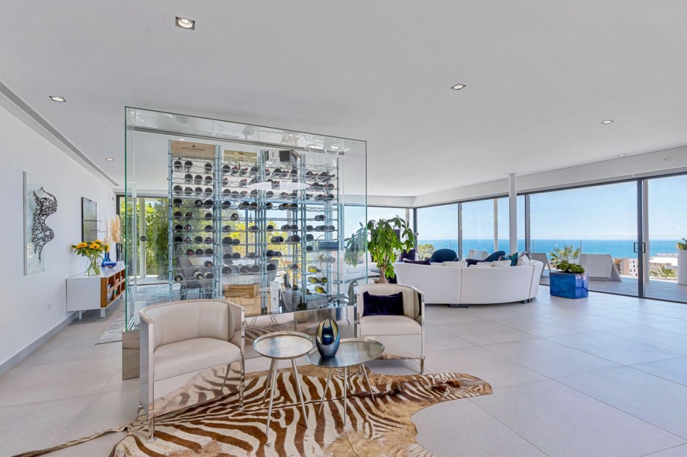 - Contemporary designer villa with breathtaking views towards the sea. The villa comprises of two floors with main entrance on the upper level. From the moment you step through the front door, you are struck by the fantastic view thanks to the floor-to-ceiling glass doors along the whole front side of the house. The upper floor is characterized by an open floor plan that houses a kitchen island, integrated kitchen cabinets, dining area and sofa group. In the middle sits a glass wine cabinet. On this floor is also the master bedroom with bathroom en-suite and private dressing room. Outside the large glass doors is a lovely covered terrace that leads out to a wooden deck and lawn. From the wooden deck, a three-meter-wide staircase leads down to the 67 m2 pool with Jacuzzi. The villa's two floors are connected by the specially designed staircase, which is the jewel of the house. On the lower level there are four bedrooms, each with an en-suite bathroom with glass walls, a guest toilet, a TV-room with a small kitchen and a fireplace, a laundry room and a large double garage. Three of the four bedrooms and the TV-room have access to the wooden deck next to the pool where, in addition to space for sun loungers and a dining table, there is an outdoor kitchen, barbecue and toilet, all protected by roll-up canvas roofs. The villa is equipped with air conditioning, under floor heating, alarms, security cameras, home automation, etc. The villa is located on one of the best plots in the exclusive Reserva del Higueron urbanization on the border between Fuengirola and Benalmadena only 15 minutes from Malaga International Airport. In the area there is the 5-star Hotel Hilton, sports club with gym, spa, padel and tennis courts and a Michelin restaurant.