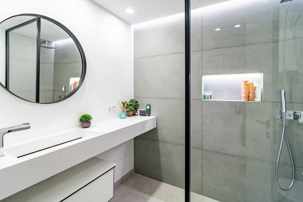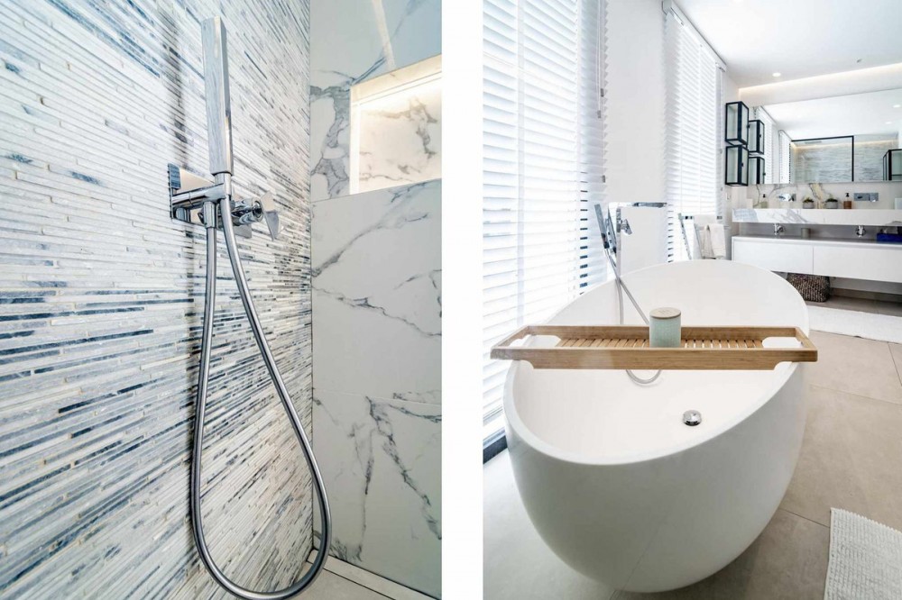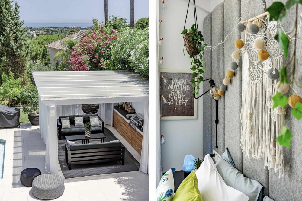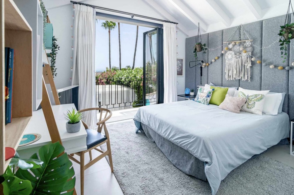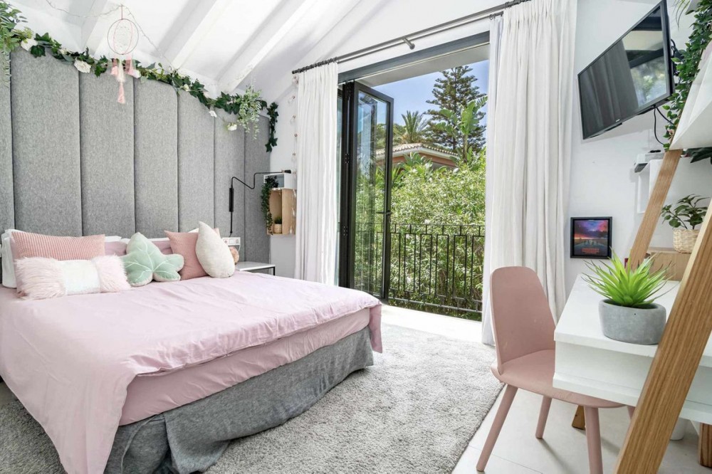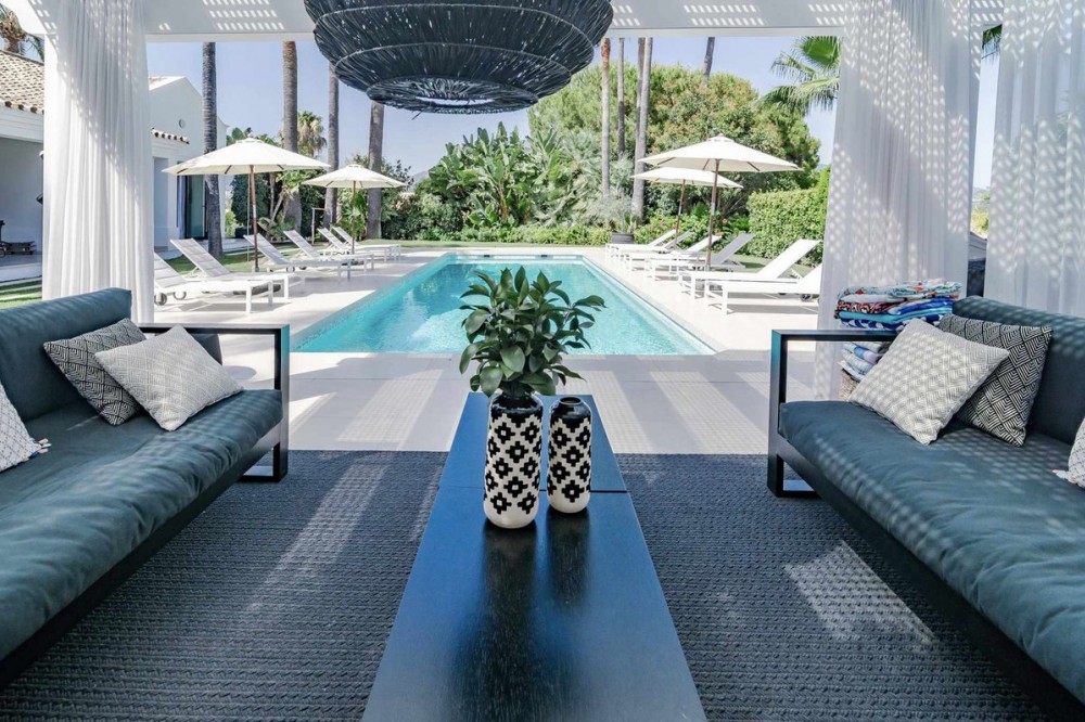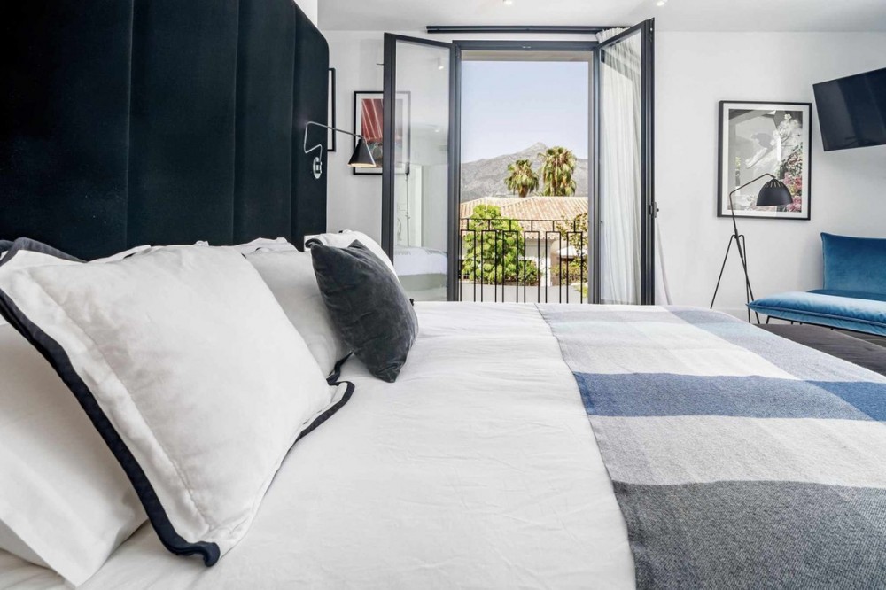- Modern villa with heated pool. Nestled in a lush garden setting, exudes the charm of a timeless Andalusian residence while boasting contemporary interiors and a refined atmosphere. Positioned on a tranquil cul-de-sac, the villa enjoys an elevated, south-facing location that provides breathtaking vistas and abundant sunshine all day long. Upon stepping in, you'll be greeted by soaring vaulted ceilings and expansive floor-to-ceiling windows, bathing the interiors in natural light. The main level features a well-appointed kitchen by Santos with open-plan design and Siemens appliances, seamlessly flowing into the spacious living and dining areas, both of which open onto a terrace with alfresco dining space. The ground floor also houses the luxurious master suite complete with a walk-in closet and en suite bathroom, while above, an office/study with steel-framed windows offers serene views overlooking the living room. Upstairs, two additional bedrooms and bathrooms await, with one bedroom boasting captivating sea and garden views. The lower level offers ample entertainment space with a generous playroom/TV area and a climate-controlled wine cellar. The garage, conveniently accessible via a glass wall from the playroom, is also located on this level along with a fourth bedroom and bathroom. Outside, the tropical garden provides a haven of privacy and tranquility, centered around a large heated pool and complemented by a fully equipped cabana featuring an outdoor kitchen, barbecue, and lounge area. This stunning villa in the heart of Nueva Andalucia is equipped with a Sonos sound system throughout the property and garden, underfloor heating on the ground floor and in all bathrooms, as well as solar panels supplying energy for the pool heater and water boiler.