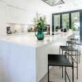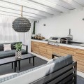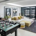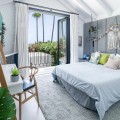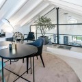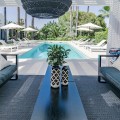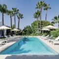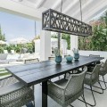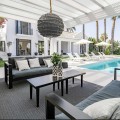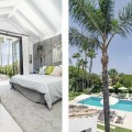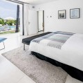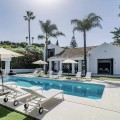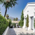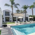 - Modern villa with heated pool. Nestled in a lush garden setting, exudes the charm of a timeless Andalusian residence while boasting contemporary interiors and a refined atmosphere. Positioned on a tranquil cul-de-sac, the villa enjoys an elevated, south-facing location that provides breathtaking vistas and abundant sunshine all day long. Upon stepping in, you'll be greeted by soaring vaulted ceilings and expansive floor-to-ceiling windows, bathing the interiors in natural light. The main level features a well-appointed kitchen by Santos with open-plan design and Siemens appliances, seamlessly flowing into the spacious living and dining areas, both of which open onto a terrace with alfresco dining space. The ground floor also houses the luxurious master suite complete with a walk-in closet and en suite bathroom, while above, an office/study with steel-framed windows offers serene views overlooking the living room. Upstairs, two additional bedrooms and bathrooms await, with one bedroom boasting captivating sea and garden views. The lower level offers ample entertainment space with a generous playroom/TV area and a climate-controlled wine cellar. The garage, conveniently accessible via a glass wall from the playroom, is also located on this level along with a fourth bedroom and bathroom. Outside, the tropical garden provides a haven of privacy and tranquility, centered around a large heated pool and complemented by a fully equipped cabana featuring an outdoor kitchen, barbecue, and lounge area. This stunning villa in the heart of Nueva Andalucia is equipped with a Sonos sound system throughout the property and garden, underfloor heating on the ground floor and in all bathrooms, as well as solar panels supplying energy for the pool heater and water boiler.
