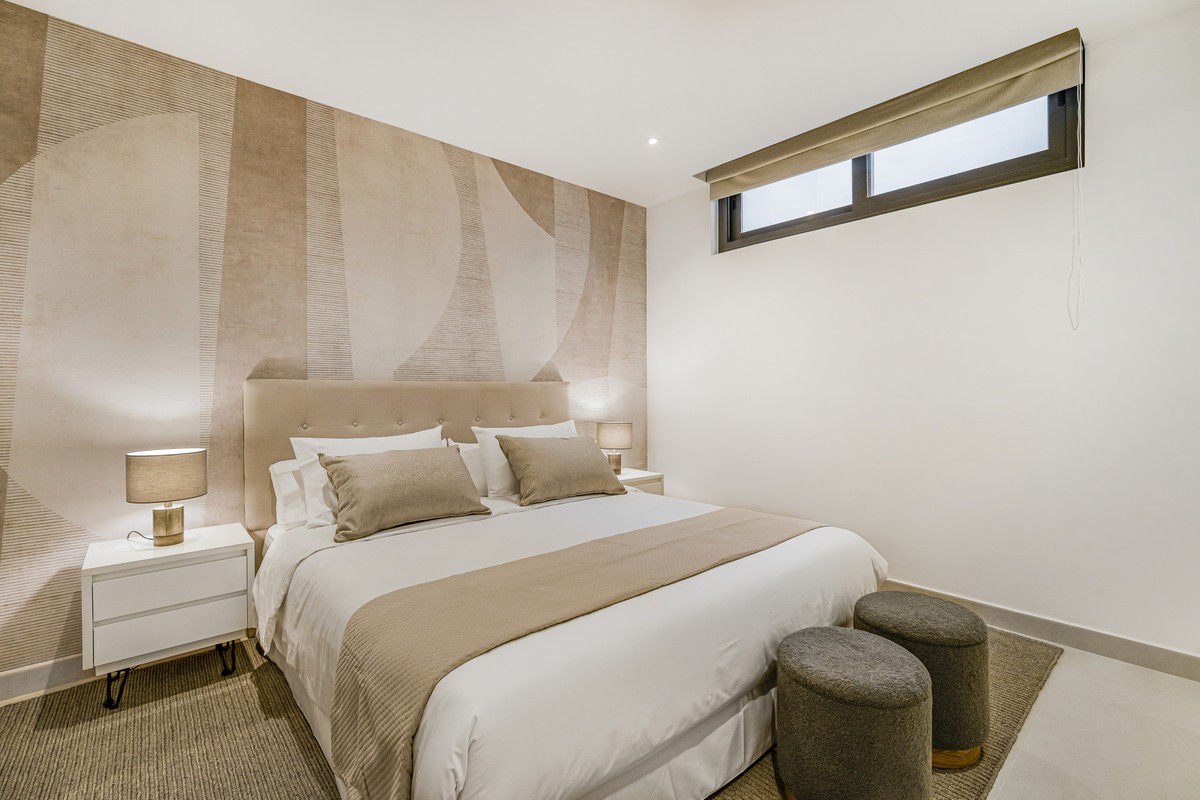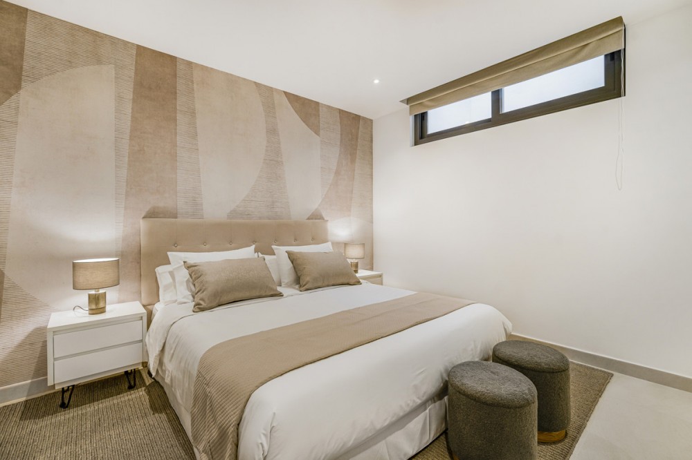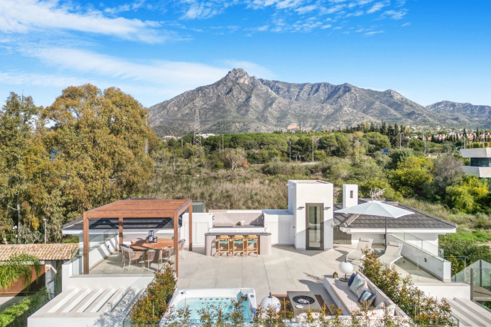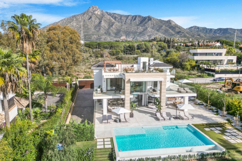 - Discover this brand-new, six-bedroom south-facing villa, situated in the prestigious gated community of Lomas del Marques, just above the renowned Puente Romano Resort on Marbella’s Golden Mile. Ideally located within walking distance to the beach and just minutes from both Puerto Banús and Marbella Town, this exquisite property combines modern luxury with unparalleled convenience. Set on a meticulously landscaped private plot, the villa features a heated swimming pool surrounded by lush greenery, creating an idyllic outdoor retreat. The ground floor offers an open-plan living and dining area that seamlessly connects to the garden, a state-of-the-art kitchen with premium appliances, and a stylish guest suite. On the first floor, you’ll find two elegant guest suites and a luxurious master suite, complete with a walk-in wardrobe and a private terrace. From this level, you can access a spacious solarium, boasting breathtaking sea views and equipped with a jacuzzi and outdoor kitchen, perfect for entertaining or unwinding in style. The lower level of the villa is designed for relaxation and entertainment, with a lounge area, bar, pool table, and two additional guest suites. This floor also provides access to a private garage with space for three cars, including electric car chargers. Additional features include hot and cold air-conditioning, built-in wardrobes, a comprehensive alarm system with security cameras, and an elevator connecting all levels of the property. Whether you’re looking for a dream family home or a high-yield rental investment, this remarkable villa—complete with a touristic license—is perfectly suited for year-round living. With its prime location and impeccable design, this property truly stands out as one of Marbella’s finest offerings.