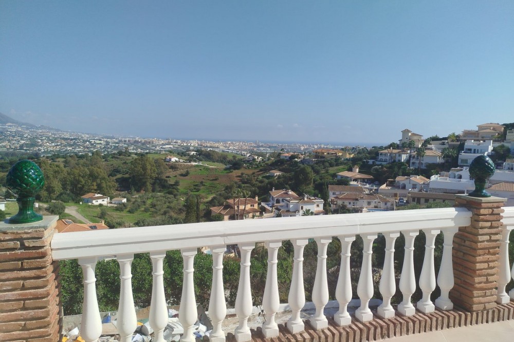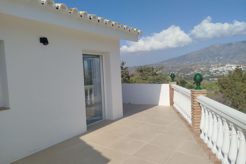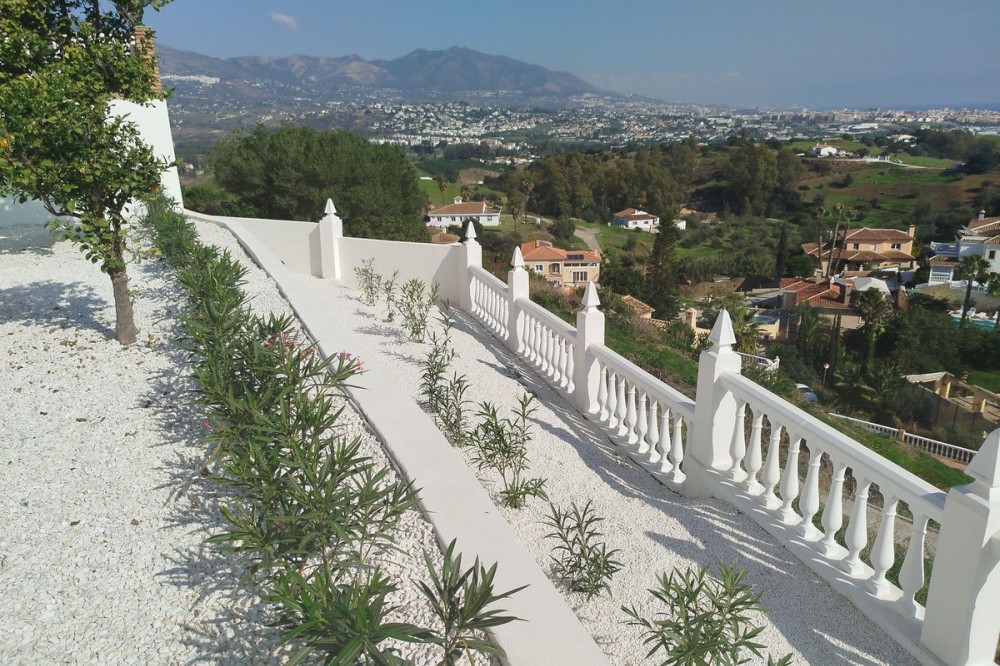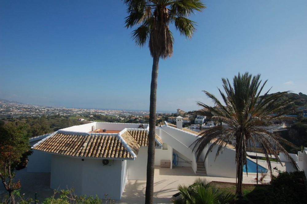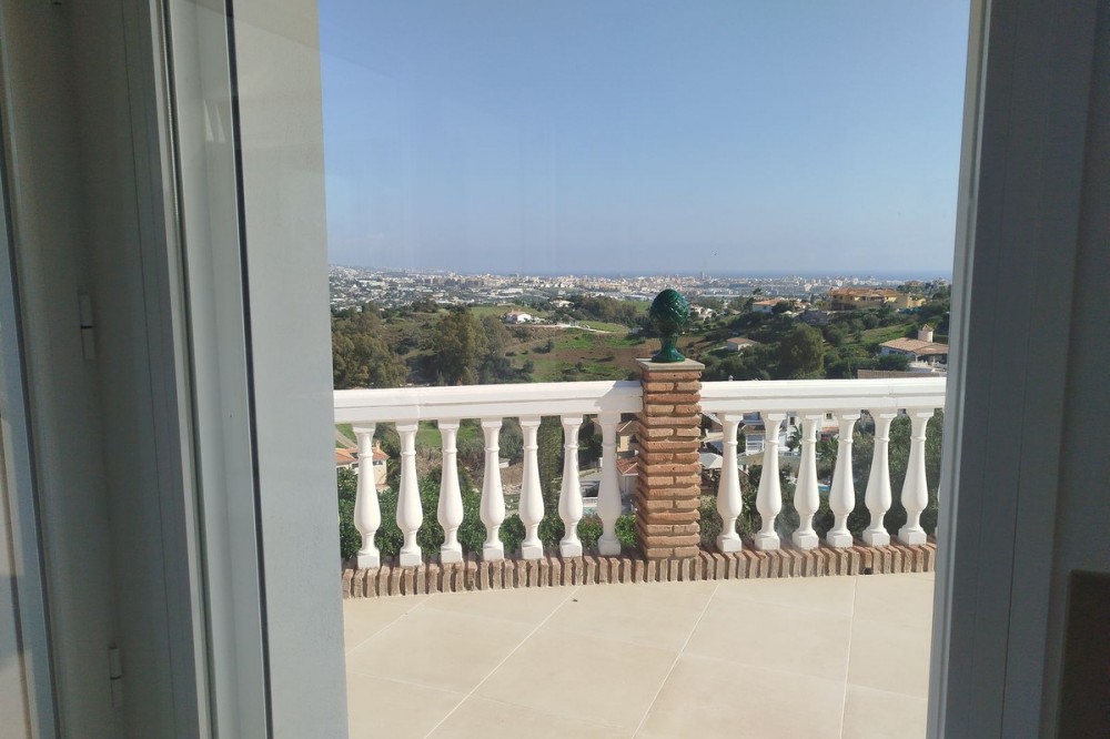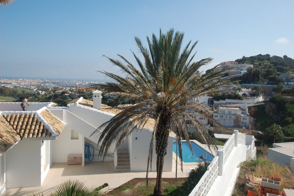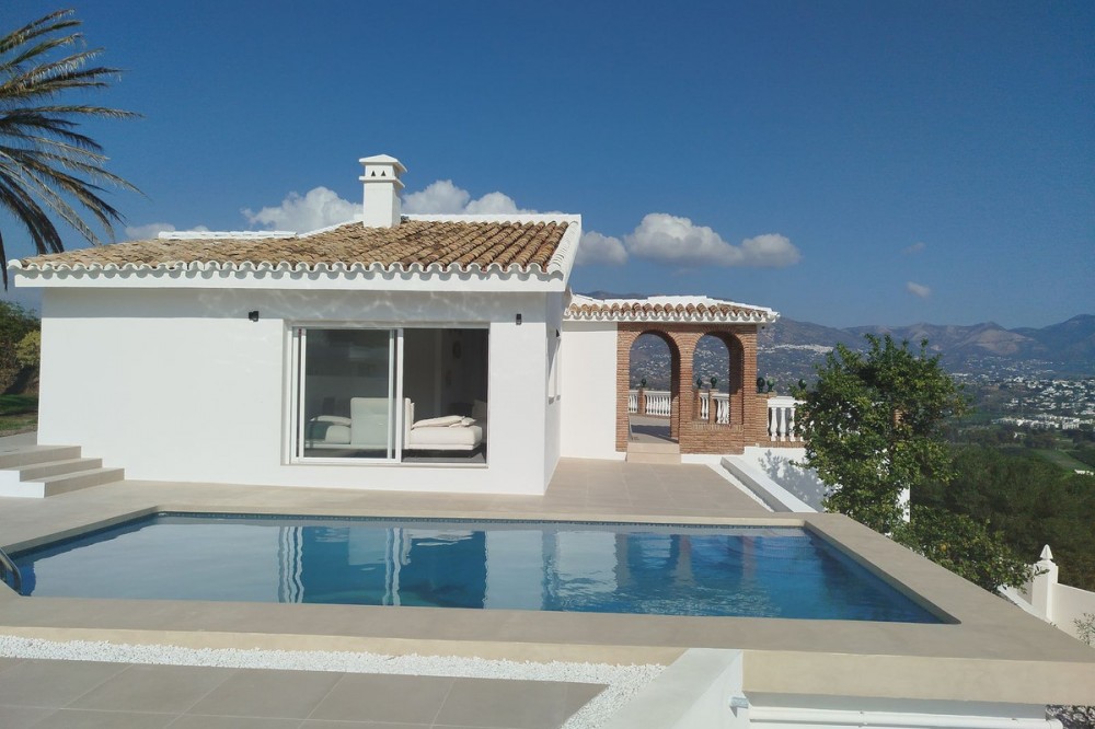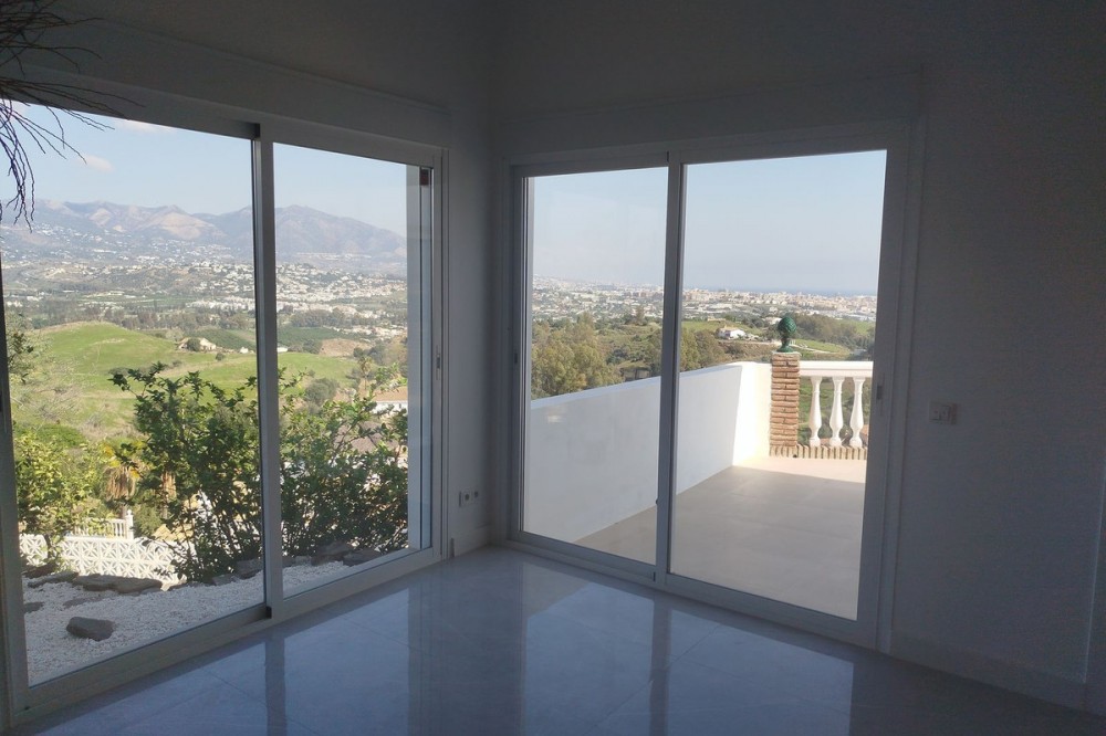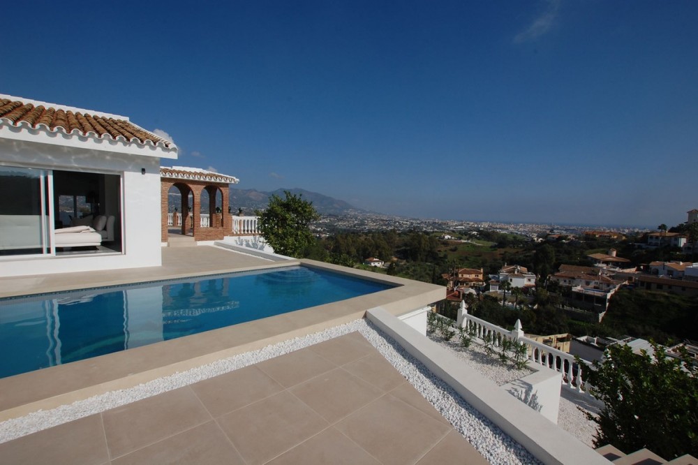 - This immaculate 3-bedroom villa with 3 ensuite bathrooms has recently been totally renovated to a high standard. It is set in an elevated position in Cerros de Aguila with unparalled panoramic sea and mountain views. You enter via a long driveway with private parking plus a covered garage for 2 cars and with a good-sized storeroom. There is a gated entrance to the one level villa with an open plan living/dining room and kitchen diner both with access to large terraces with panoramic sea views and to the landscaped gardens with an infinity pool. There are 2 guest bedrooms with ensuites with access to the back garden and terraces, a guest toilet, and a large master bedroom with a feature bath, washbasin and toilet with panoramic views to the sea. The property has underfloor heating in most rooms with electric blinds and hot and cold air conditioning. The property is all fenced and alarmed with terraced gardens with a selection of fruit and palm trees. There is also a roof solarium with panoramic 360-degree views of the mountains and the sea. The property is within easy access to Fuengirola and Mijas, bars, restaurants, beach and the new Mijas park. You also have the well-placed community pool, gardens, sport facilities, bars and shops of the local community of Cerros de Aguila. Detached Villa, Mijas Costa, Costa del Sol. 3 Bedrooms, 3 Bathrooms, Built 241 m², Terrace 100 m², Garden/Plot 1000 m². Setting : Suburban, Close To Golf, Close To Shops, Close To Sea, Close To Town, Close To Schools, Urbanisation. Orientation : South. Condition : Excellent, Recently Renovated, Recently Refurbished. Pool : Private. Climate Control : Air Conditioning, Hot A/C, Cold A/C, U/F Heating, U/F/H Bathrooms. Views : Sea, Mountain, Panoramic. Features : Covered Terrace, Fitted Wardrobes, Private Terrace, Solarium, Storage Room, Ensuite Bathroom, Marble Flooring, Double Glazing. Furniture : Part Furnished. Kitchen : Fully Fitted. Garden : Private. Security : Electric Blinds, Alarm System. Parking : Underground, Garage, Open, Private. Utilities : Electricity, Drinkable Water. Category : Resale.