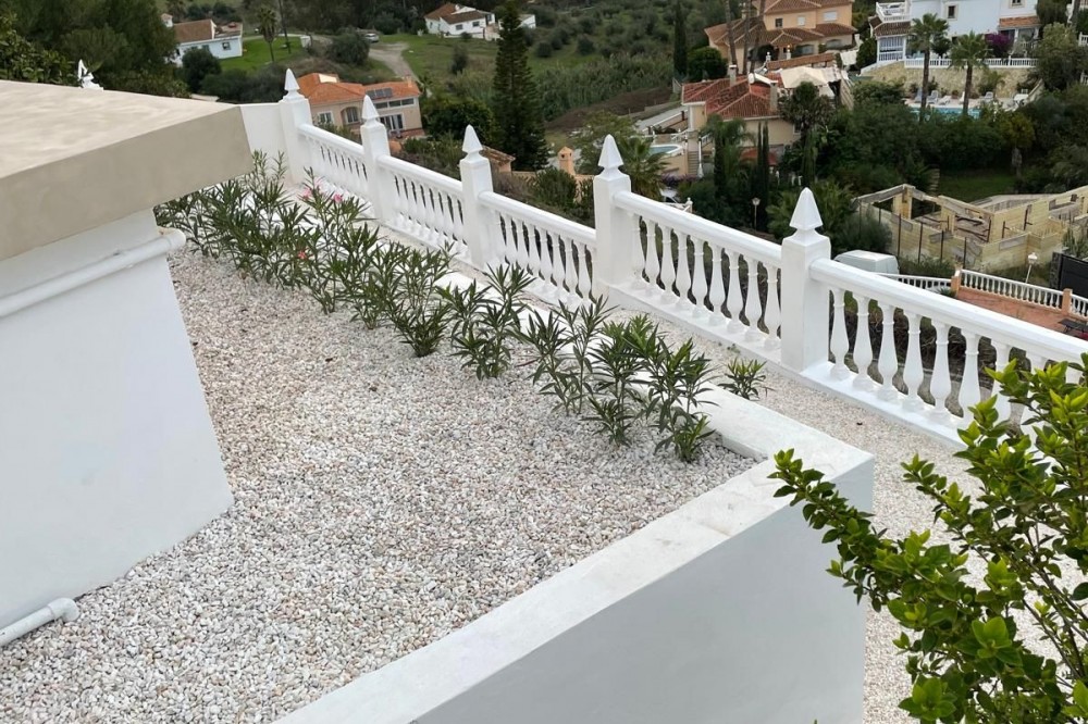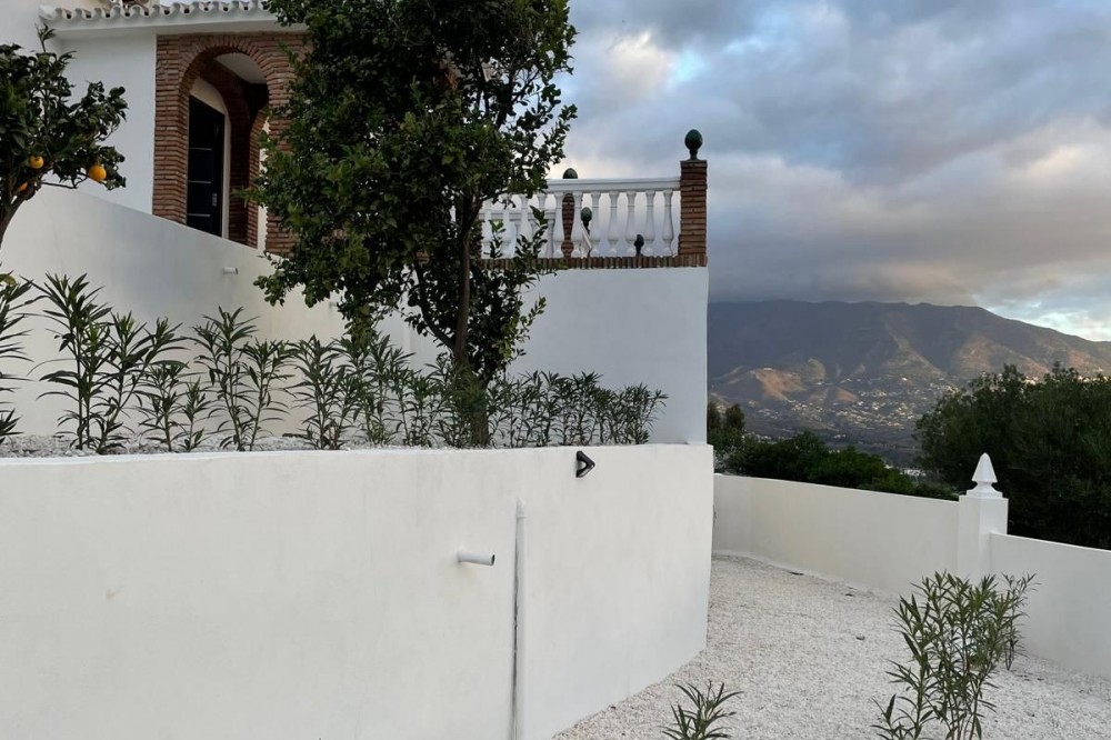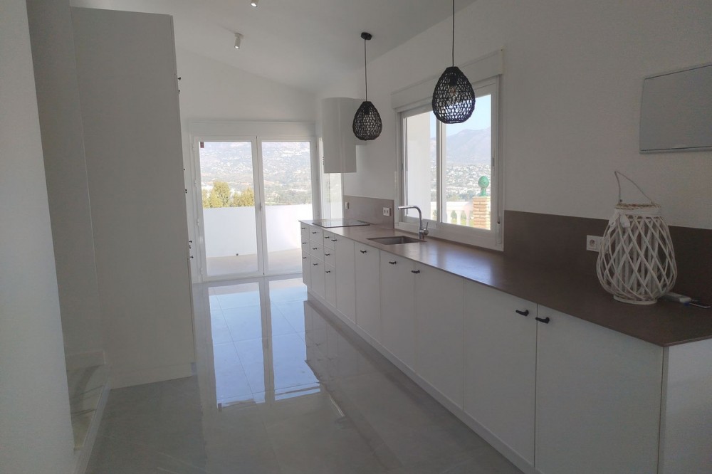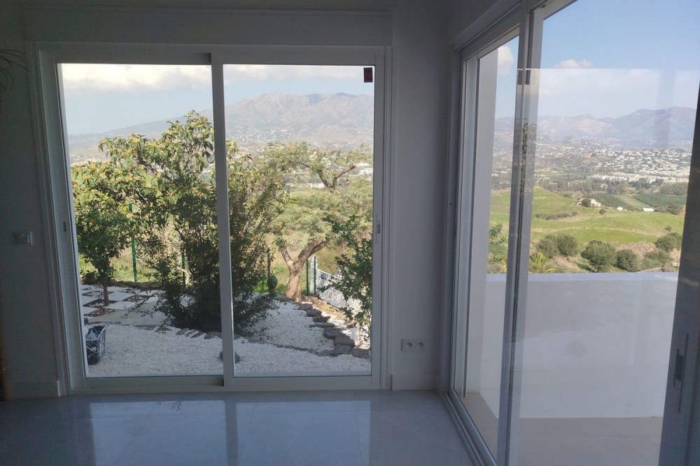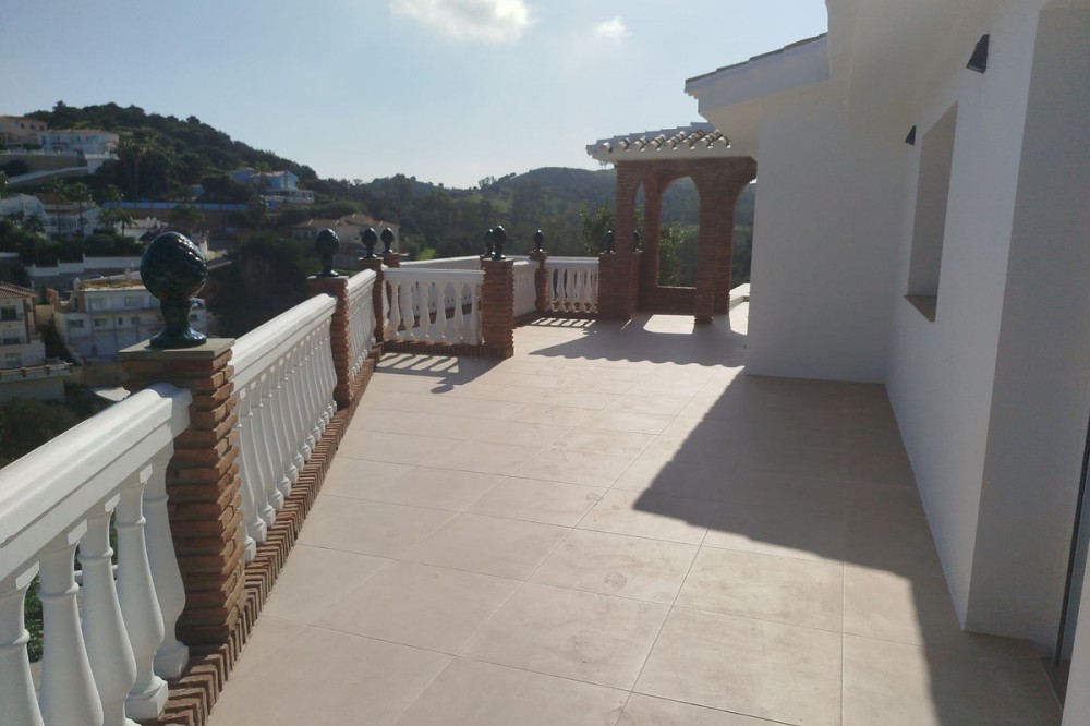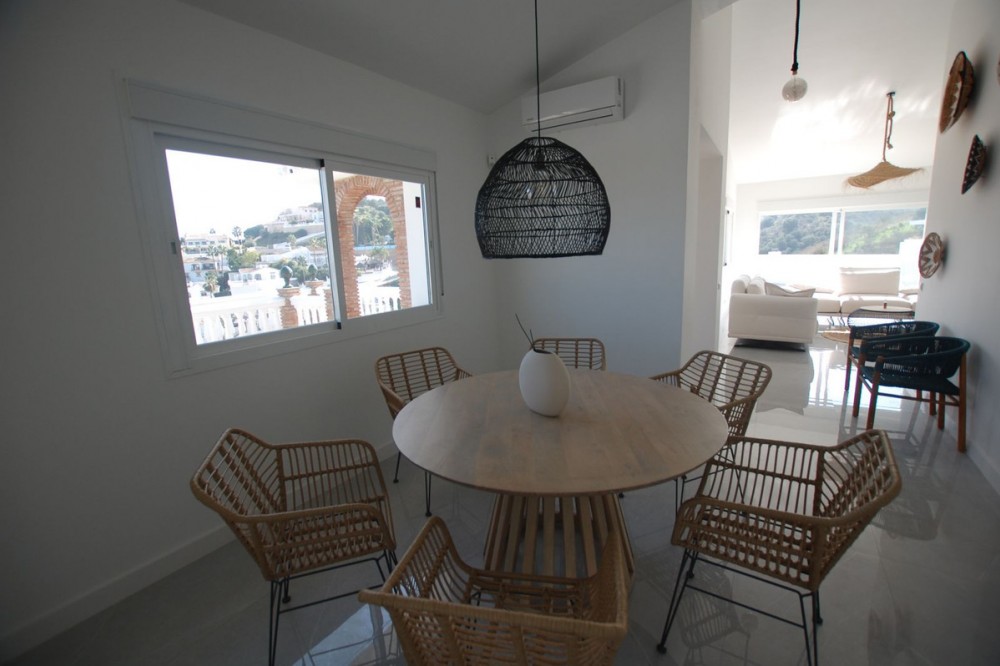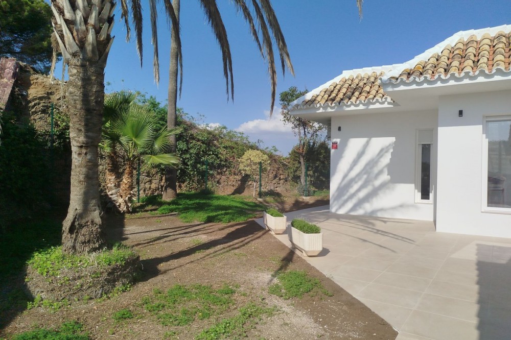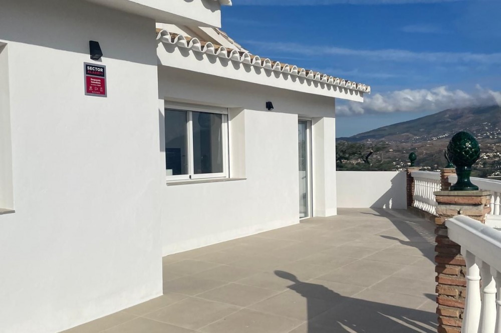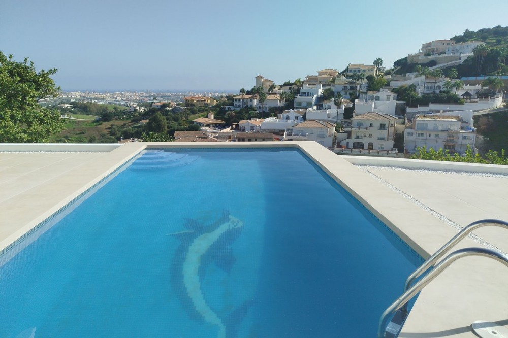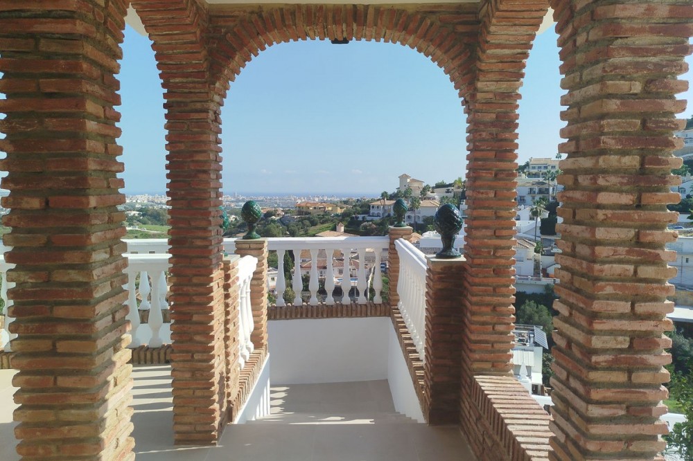 - This immaculate 3-bedroom villa with 3 ensuite bathrooms has recently been totally renovated to a high standard. It is set in an elevated position in Cerros de Aguila with unparalled panoramic sea and mountain views. You enter via a long driveway with private parking plus a covered garage for 2 cars and with a good-sized storeroom. There is a gated entrance to the one level villa with an open plan living/dining room and kitchen diner both with access to large terraces with panoramic sea views and to the landscaped gardens with an infinity pool. There are 2 guest bedrooms with ensuites with access to the back garden and terraces, a guest toilet, and a large master bedroom with a feature bath, washbasin and toilet with panoramic views to the sea. The property has underfloor heating in most rooms with electric blinds and hot and cold air conditioning. The property is all fenced and alarmed with terraced gardens with a selection of fruit and palm trees. There is also a roof solarium with panoramic 360-degree views of the mountains and the sea. The property is within easy access to Fuengirola and Mijas, bars, restaurants, beach and the new Mijas park. You also have the well-placed community pool, gardens, sport facilities, bars and shops of the local community of Cerros de Aguila. Detached Villa, Mijas Costa, Costa del Sol. 3 Bedrooms, 3 Bathrooms, Built 241 m², Terrace 100 m², Garden/Plot 1000 m². Setting : Suburban, Close To Golf, Close To Shops, Close To Sea, Close To Town, Close To Schools, Urbanisation. Orientation : South. Condition : Excellent, Recently Renovated, Recently Refurbished. Pool : Private. Climate Control : Air Conditioning, Hot A/C, Cold A/C, U/F Heating, U/F/H Bathrooms. Views : Sea, Mountain, Panoramic. Features : Covered Terrace, Fitted Wardrobes, Private Terrace, Solarium, Storage Room, Ensuite Bathroom, Marble Flooring, Double Glazing. Furniture : Part Furnished. Kitchen : Fully Fitted. Garden : Private. Security : Electric Blinds, Alarm System. Parking : Underground, Garage, Open, Private. Utilities : Electricity, Drinkable Water. Category : Resale.