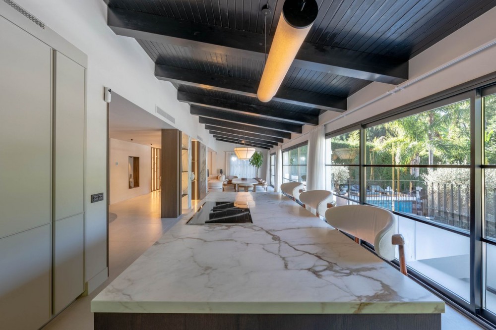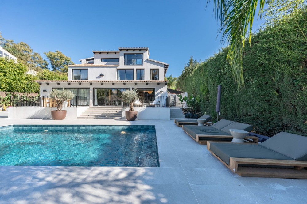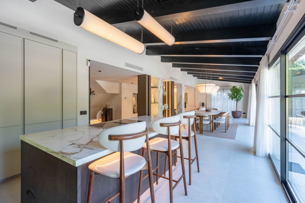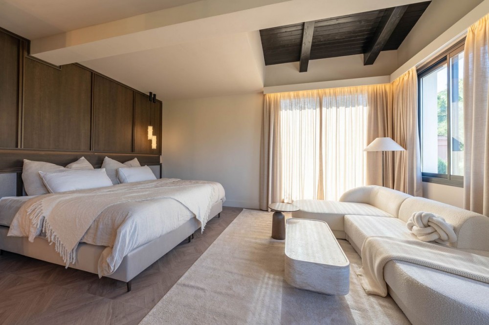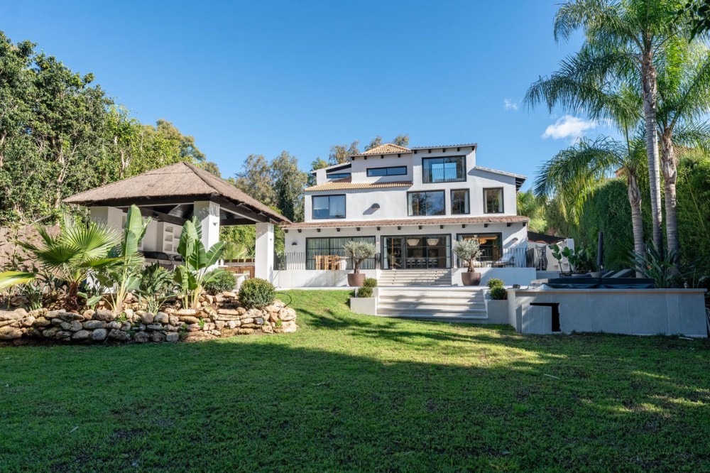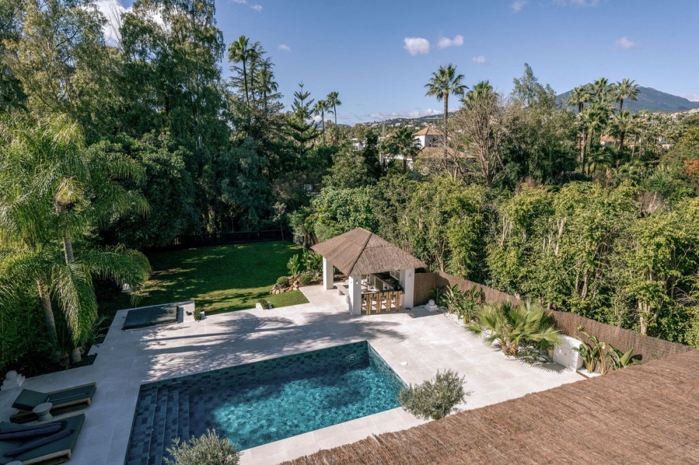 - Welcome to this stunning villa in the heart of Nueva Andalucía, where privacy and modern convenience seamlessly blend together. Recently renovated in the serene Scandinavian-Japandi style, this exceptional home offers an elegant retreat that prioritizes comfort and tranquility. Inside, you’ll find a harmonious use of natural materials and calming colors, creating an inviting atmosphere that promotes relaxation. The spacious layout features five beautifully designed bedrooms and six modern bathrooms, making it an ideal space for families and those who love to entertain. The expansive garden provides an extraordinary sense of privacy, surrounded by lush greenery that evokes a serene, jungle-like ambiance, allowing you to unwind in your own personal oasis. The living room effortlessly connects to the outdoor space, ensuring a fluid transition between indoor and outdoor living. This inviting area is perfect for relaxation or entertaining, enhanced by an outdoor BBQ that is ideal for hosting gatherings. On warm days, take a refreshing dip in the massive pool, perfect for sunbathing and enjoying the outdoors. As the evenings cool down, unwind in the luxurious jacuzzi, a cozy retreat that invites relaxation under the stars. Equipped with smart home technology, this villa offers modern amenities that enhance convenience and security, allowing you to effortlessly control various aspects of your home. For fitness enthusiasts, there is also an outdoor gym, making it easy to maintain an active lifestyle while soaking in the breathtaking views. This villa is not just a home; it’s a luxurious sanctuary that combines cutting-edge technology, nature’s beauty, and the utmost privacy. Don’t miss the opportunity to make this exquisite property yours!