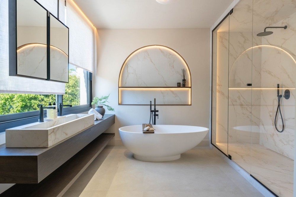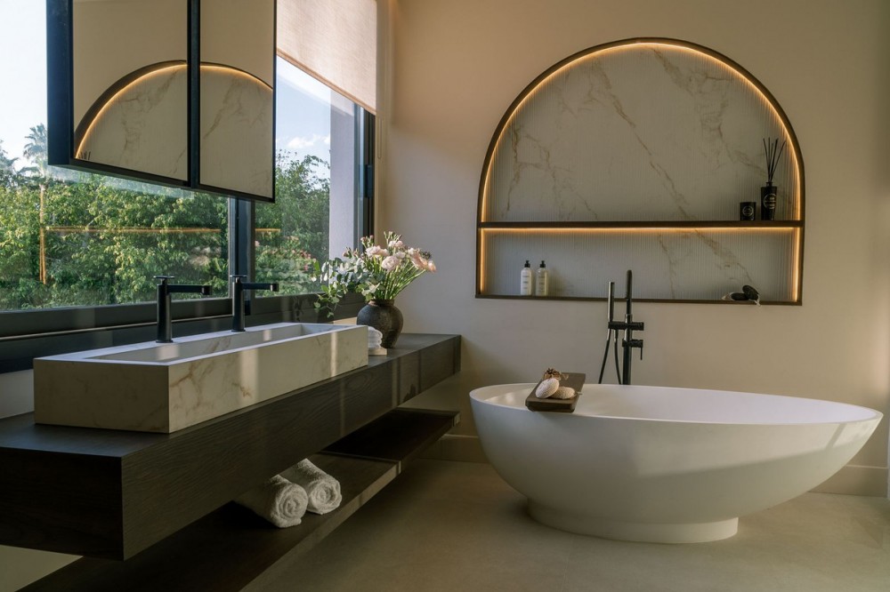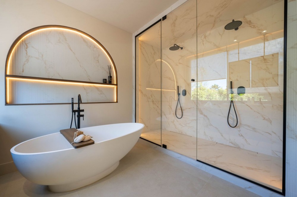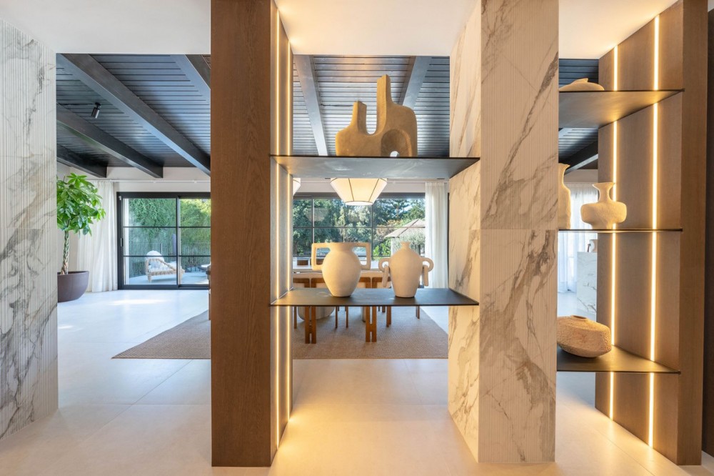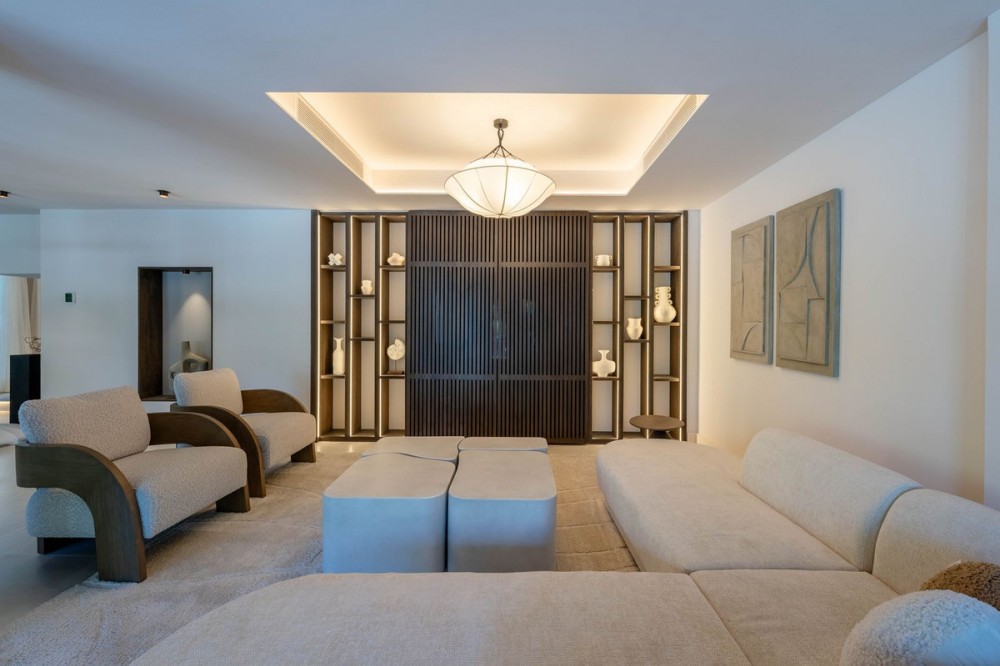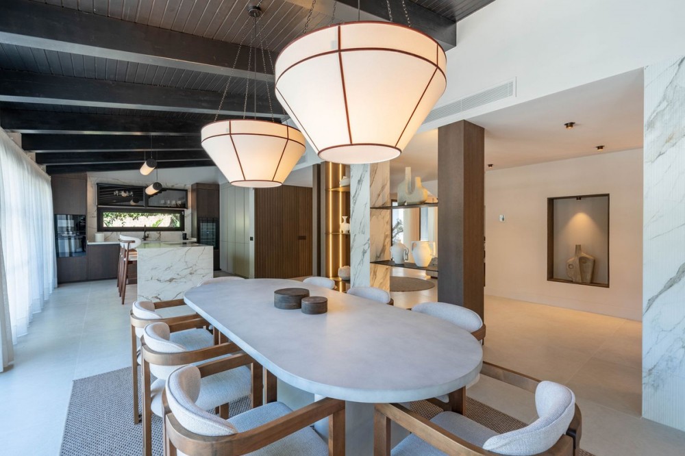 - Welcome to this stunning villa in the heart of Nueva Andalucía, where privacy and modern convenience seamlessly blend together. Recently renovated in the serene Scandinavian-Japandi style, this exceptional home offers an elegant retreat that prioritizes comfort and tranquility. Inside, you’ll find a harmonious use of natural materials and calming colors, creating an inviting atmosphere that promotes relaxation. The spacious layout features five beautifully designed bedrooms and six modern bathrooms, making it an ideal space for families and those who love to entertain. The expansive garden provides an extraordinary sense of privacy, surrounded by lush greenery that evokes a serene, jungle-like ambiance, allowing you to unwind in your own personal oasis. The living room effortlessly connects to the outdoor space, ensuring a fluid transition between indoor and outdoor living. This inviting area is perfect for relaxation or entertaining, enhanced by an outdoor BBQ that is ideal for hosting gatherings. On warm days, take a refreshing dip in the massive pool, perfect for sunbathing and enjoying the outdoors. As the evenings cool down, unwind in the luxurious jacuzzi, a cozy retreat that invites relaxation under the stars. Equipped with smart home technology, this villa offers modern amenities that enhance convenience and security, allowing you to effortlessly control various aspects of your home. For fitness enthusiasts, there is also an outdoor gym, making it easy to maintain an active lifestyle while soaking in the breathtaking views. This villa is not just a home; it’s a luxurious sanctuary that combines cutting-edge technology, nature’s beauty, and the utmost privacy. Don’t miss the opportunity to make this exquisite property yours!