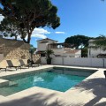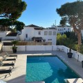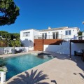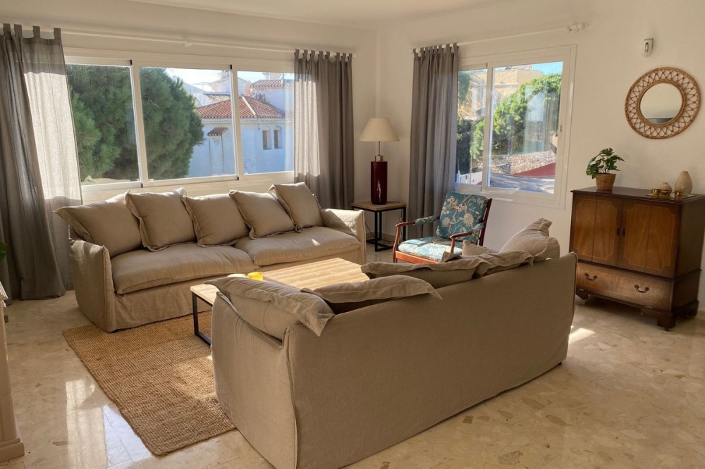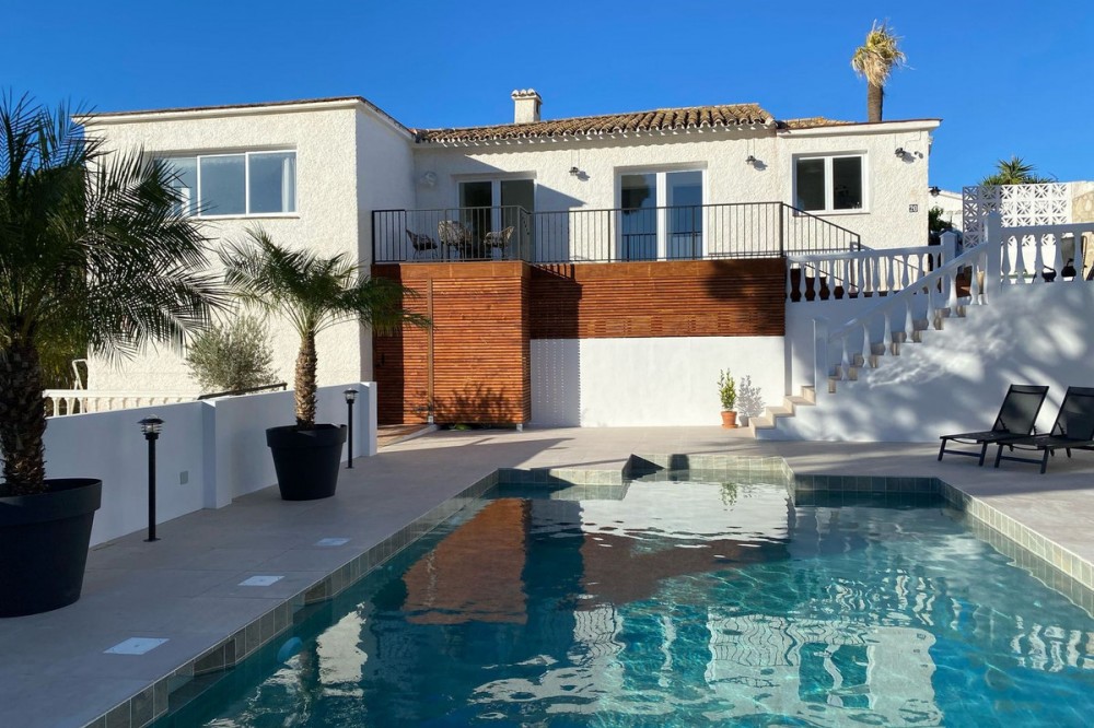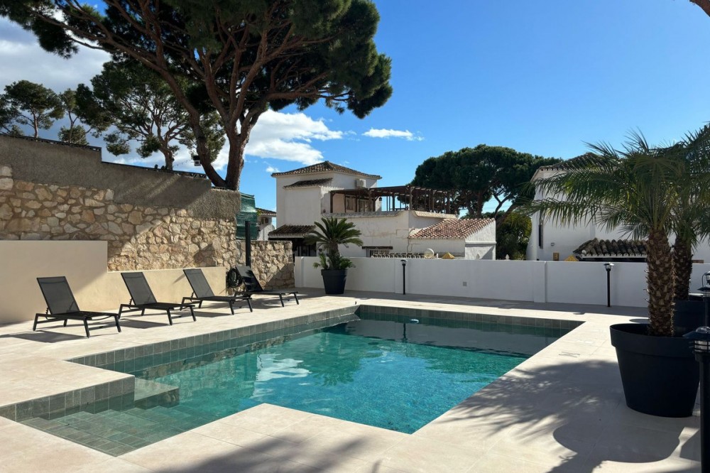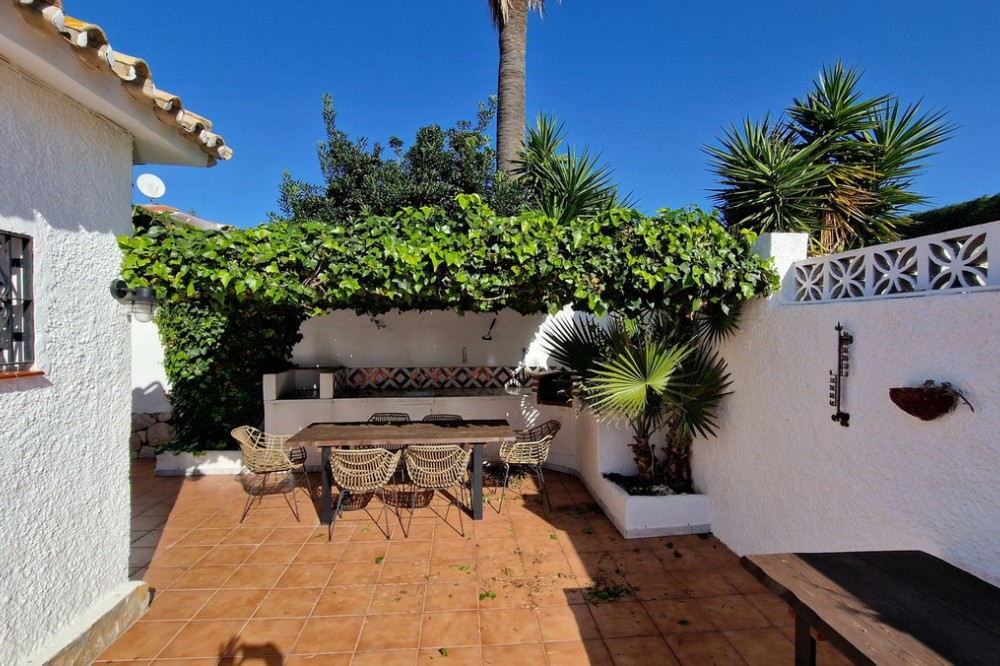 - Villa within walking distance to the beach for sale in Calahonda, Mijas Costa. This villa was renovated (2023/2024) in most areas and a brand new terrace and pool area have been built. You find that the pool is heated, a barbecue area, an outside dining area with an extra gas grill, room for entertainment currently used for table tennis and nice gardens around. Overall a beautiful family home located on a quiet street, 150 meters to restaurants and 700 meters to the beach. Great rental potential with a history of short term rentals and with a touristic license in place. The house is suitable for 10-12 people offering four bedrooms, three bathrooms and one toilet. Also a brand new kitchen with all appliances, a dining area and a large living room. You find the living area, the kitchen and dining as well as two bedrooms, a large bathroom and a separate toilet upstairs, the other two bedrooms each with a bathroom offering a shower are downstairs. About 35minutes from the Málaga Airport and city and just 20 minutes from Marbella city centre.