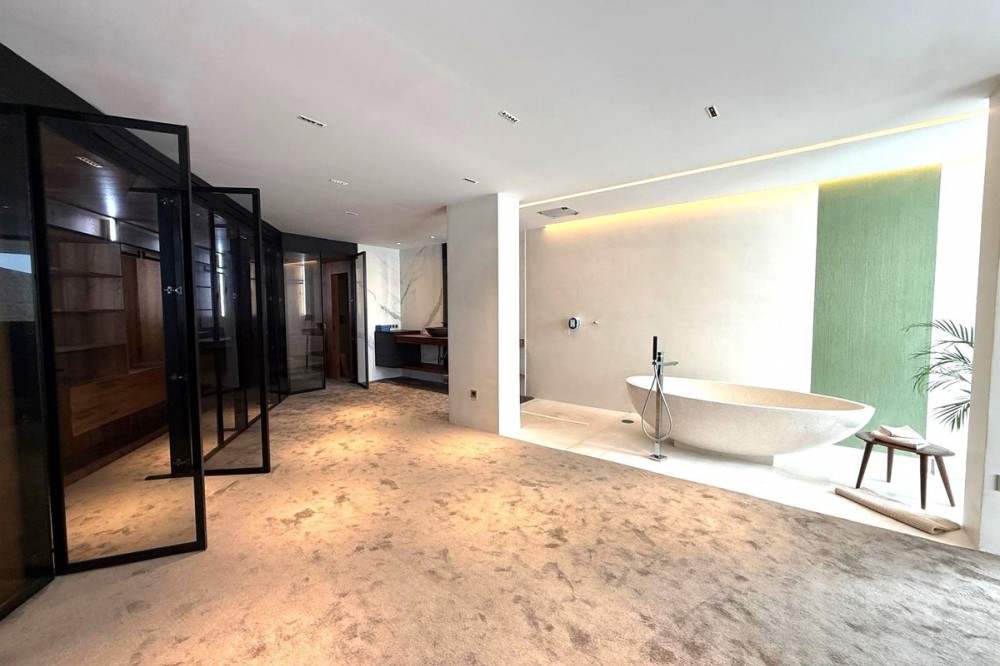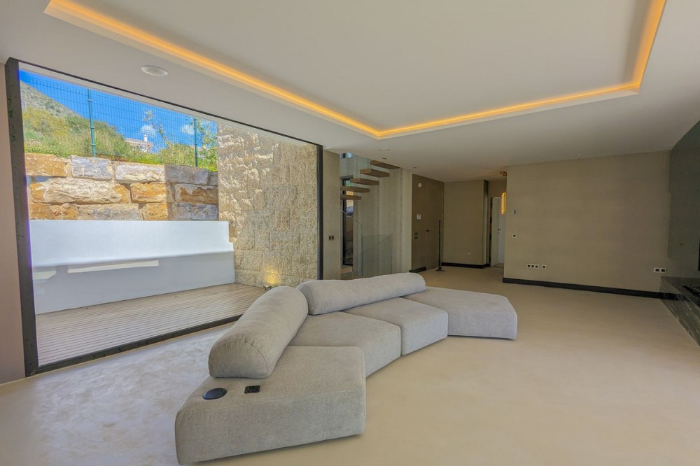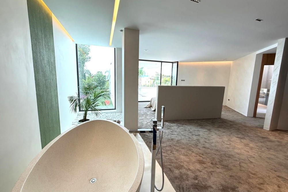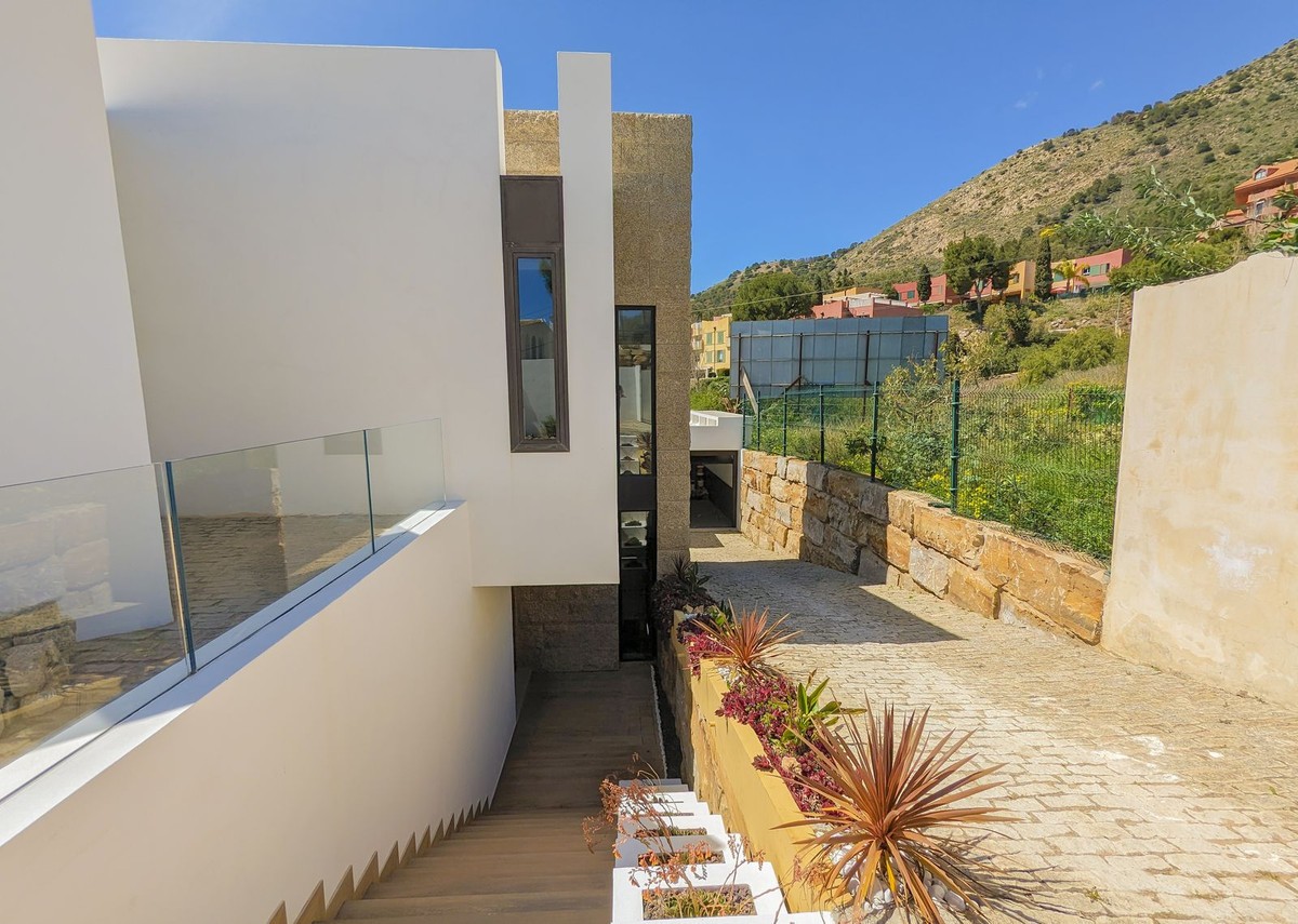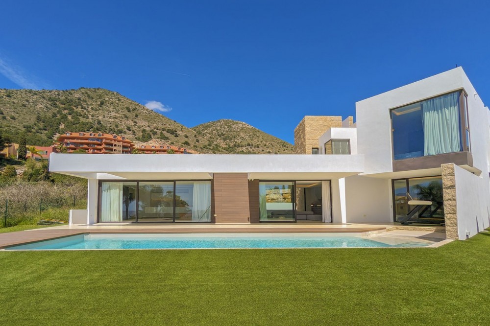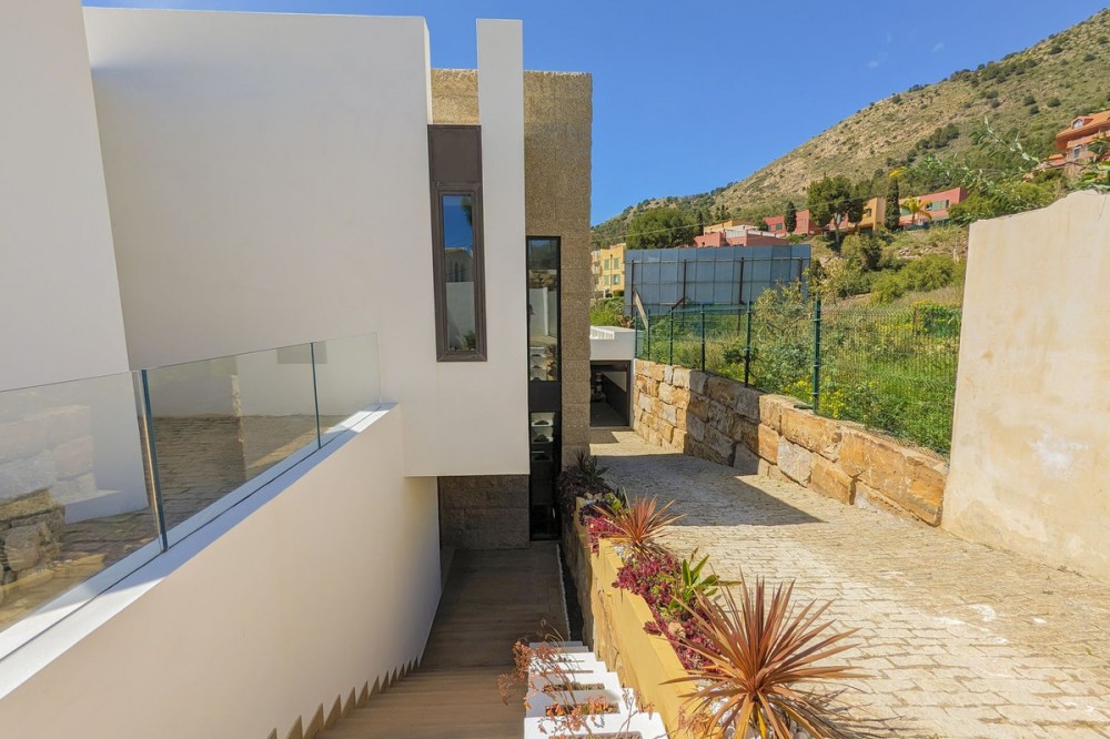 - Wonderful brand new luxury villa in one of the most sought-after areas of Benalmádena, in the heart of the Costa del Sol. The real star of the show is the exterior. Enjoy the magnificent sun terrace, designed for leisure and relaxation, with an impressive swimming pool with a waterfall that blends in with the blue of the sea and the green of the vegetation. Everything is brand new, in one of the most sought-after areas of Benalmádena (Higuerón) in the heart of the Costa del Sol. It has 3 bedrooms, 3 bathrooms, a guest toilet, a huge living room with a fireplace, a top-of-the-range kitchen and large windows with panoramic views. Gym. Some of the additional premium features: Solar panels, underfloor heating throughout the house, air conditioning/heating with airzone. The property boasts exceptional qualities. Huge living room with fireplace opening onto a 150 m² porch, where you can contemplate an oasis of peace, tranquillity and sea views. Kitchen open to the living room with top-of-the-range appliances, laundry area. The master bedroom has its own designer en-suite bathroom and an unrivalled dressing room. Everything straight out of a fairy tale.