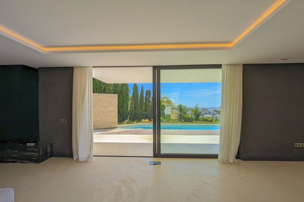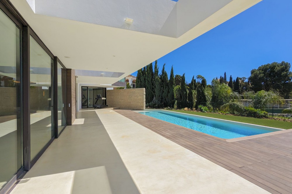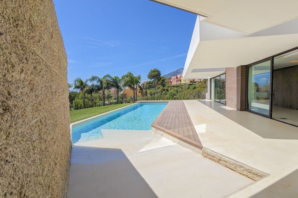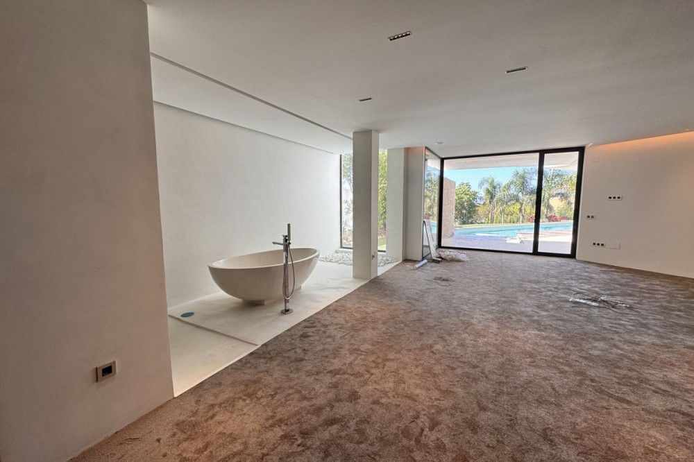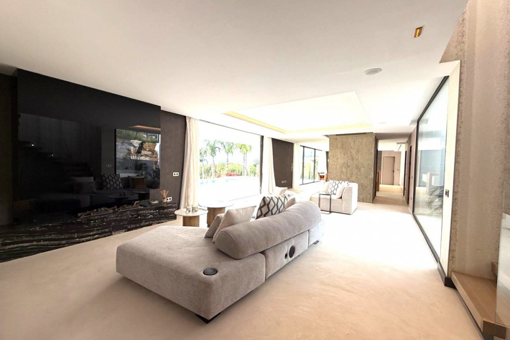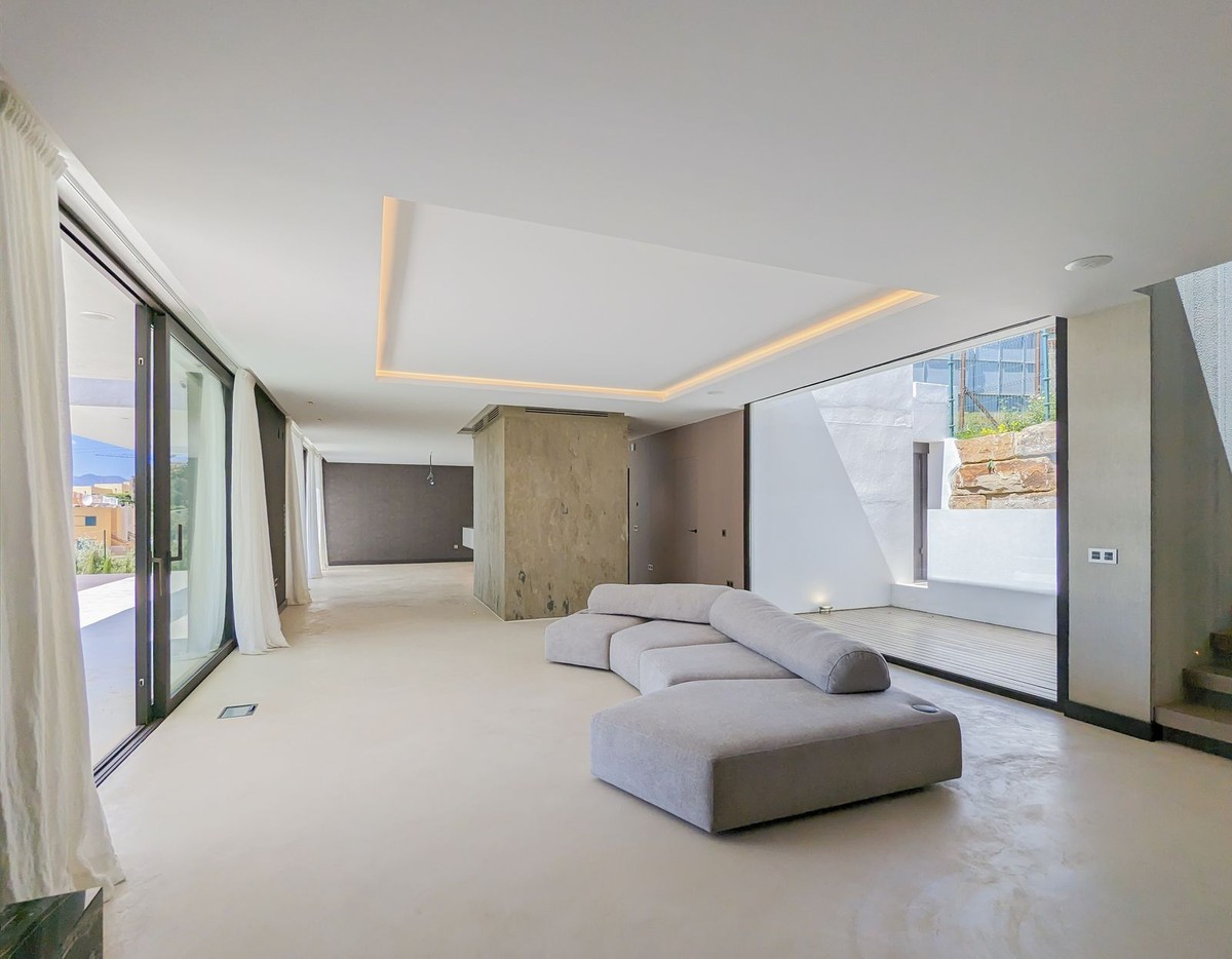 - Wonderful brand new luxury villa in one of the most sought-after areas of Benalmádena, in the heart of the Costa del Sol. The real star of the show is the exterior. Enjoy the magnificent sun terrace, designed for leisure and relaxation, with an impressive swimming pool with a waterfall that blends in with the blue of the sea and the green of the vegetation. Everything is brand new, in one of the most sought-after areas of Benalmádena (Higuerón) in the heart of the Costa del Sol. It has 3 bedrooms, 3 bathrooms, a guest toilet, a huge living room with a fireplace, a top-of-the-range kitchen and large windows with panoramic views. Gym. Some of the additional premium features: Solar panels, underfloor heating throughout the house, air conditioning/heating with airzone. The property boasts exceptional qualities. Huge living room with fireplace opening onto a 150 m² porch, where you can contemplate an oasis of peace, tranquillity and sea views. Kitchen open to the living room with top-of-the-range appliances, laundry area. The master bedroom has its own designer en-suite bathroom and an unrivalled dressing room. Everything straight out of a fairy tale.