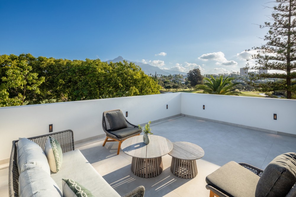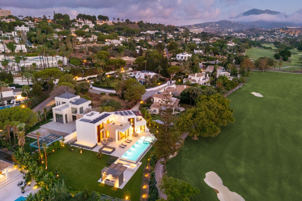 • Villa Imagine is an exceptional frontline golf Villa for sale in Las Brisas. This property offers a luxurious living experience with modern design and natural beauty. This stunning villa, offers a thoughtfully crafted design by a renowned architect and developed by a top-tier developer known for impeccable standards and attention to detail. Situated frontline golf of Las Brisas Golf Club in Nueva Andalucía, the location is one of Villa Imagine’s standout features. Las Brisas is known for its tranquil residential setting, beautiful landscapes, and proximity to top Marbella amenities. Nueva Andalucía blends tranquillity with convenience, offering easy access to the vibrant Puerto Banús, famous for its luxury marina, high-end shopping, and fine dining. Residents enjoy a serene atmosphere within a well-established neighbourhood while being a short drive from Marbella's bustling heart. Located on a generous plot of 1,454 square metres, Villa Imagine spans 627square metres across three levels. This property features five spacious bedrooms, each with its own en-suite bathroom, and an additional toilet, ensuring ample space and privacy for family and guests. The villa's design impresses with high ceilings, expansive windows, and premium materials throughout. Upon entering, the villa reveals an inviting atmosphere where warm tones and elegant finishes blend seamlessly. The large archway and lead lights create a sense of grandeur, while wooden doors add rustic charm. The main living area is both functional and aesthetically pleasing, with an open-plan layout maximising space and light. Hidden warm LED lighting adds a cosy ambiance, and high windows frame breathtaking views of La Concha mountain, the golf course, and a serene lake with a fountain. The kitchen is a highlight, equipped with high-end appliances and ample storage. It features an oversized kitchen island, ideal for casual dining or entertaining. The kitchen overlooks the infinity pool and jacuzzi, offering stunning views of the golf course and lush landscape. The outdoor spaces are equally impressive, with a private pool, a fire pit, and a covered area for an outdoor kitchen, perfect for alfresco dining. The villa’s garden is meticulously landscaped, providing a beautiful and functional outdoor space. The property enjoys sunlight throughout the day, making it ideal for relaxing or entertaining. The front-line golf location offers a unique advantage, providing unobstructed views of the well-maintained golf course and surrounding nature, ensuring privacy with no risk of errant golf balls. In the basement, Villa Imagine continues to impress with a fully fitted techno gym, a sauna, and a steam room, creating a private wellness retreat. The basement also features a second living room with full windows that let in natural light, eliminating the typical basement feel. This space includes a bar with a stone wall backsplash, a home cinema, and additional bedrooms, making it a versatile area for relaxation and entertainment. The staircase is a work of art, with hidden lights and beautifully designed steps adding to the villa's elegance. The property is designed to offer a blend of luxury and comfort, with every detail thoughtfully considered to create a harmonious living environment. Villa Imagine is more than just a home; it is a sanctuary where modern luxury meets natural beauty. The developer's commitment to quality and the architect's vision have created a property offering an unparalleled living experience. With its prime location, exceptional design, and extensive amenities, Villa Imagine is set to be one of the most sought-after properties in the area. Whether you are a golf enthusiast or simply appreciate fine living, this villa offers a lifestyle that is both luxurious and deeply connected to its beautiful surroundings.