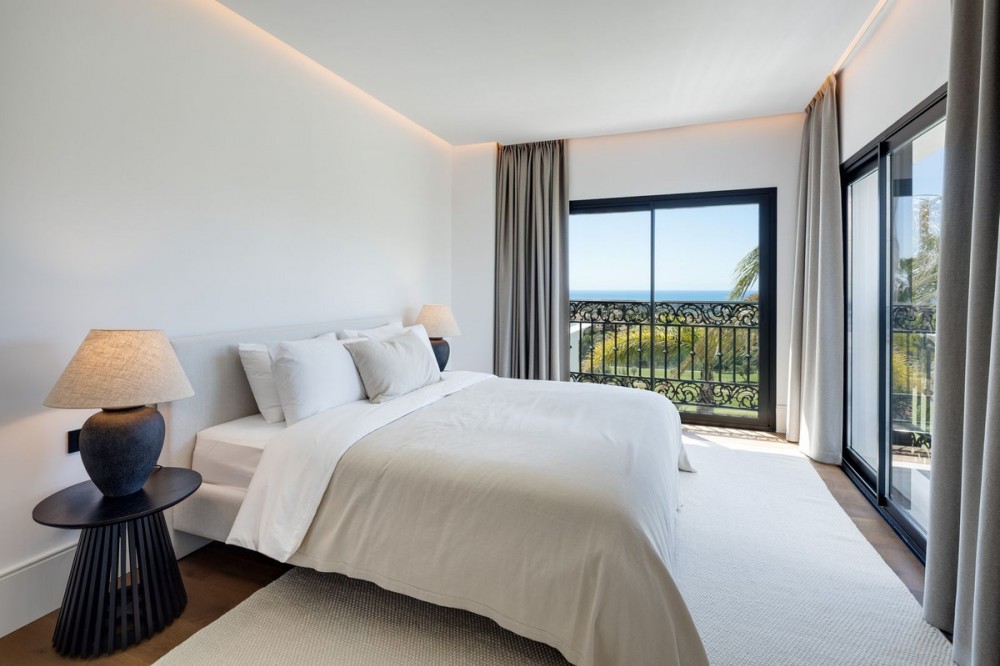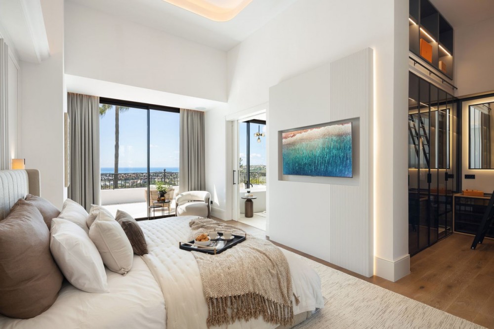 - Discover this spectacular, fully renovated luxury villa located in the prestigious gated community of Los Arqueros, boasting breathtaking views over the renowned golf course. Blending timeless Mediterranean architecture with sleek contemporary elegance, this residence offers the perfect combination of sophistication, comfort, and prime location—just minutes from Marbella’s upscale shopping, fine dining, and golden beaches. Set on a 1,016 m² plot with a total built area of 972 m², the villa features expansive, light-filled interiors, multiple terraces, and sweeping sea views. It comprises five generously sized en-suite bedrooms and a guest powder room. The open-plan layout on the main floor includes a refined living area, a bespoke Danish kitchen fitted with Gaggenau and Siemens appliances, Dekton countertops, and sleek lacquered cabinetry, along with an elegant dining area and cozy TV lounge. The beautifully landscaped outdoor areas are ideal for al fresco living, featuring a dining space with BBQ, sunbathing zones, a private gym, and a south-facing 50 m² swimming pool that enjoys sunlight throughout the day. The upper level hosts a luxurious master suite with a walk-in closet, a spa-style bathroom, and a private terrace with panoramic views. Two additional en-suite bedrooms also open onto terraces, offering space and privacy. The lower level is designed for entertainment, complete with a custom bar and lounge, a glass-enclosed wine cellar, and a private cinema. A unique garage with a glass wall showcases your car collection as part of the home’s aesthetic. With Control4 home automation, Sonos sound, underfloor heating, and solar panels, this villa is the epitome of modern Mediterranean luxury.