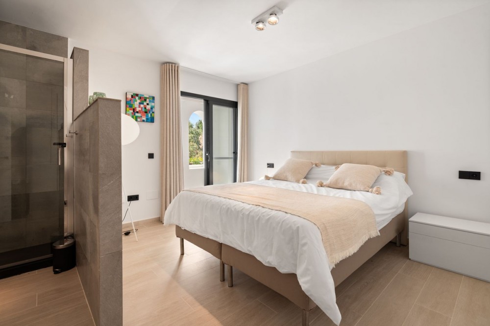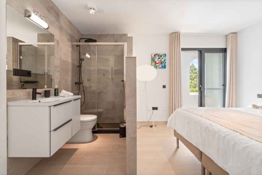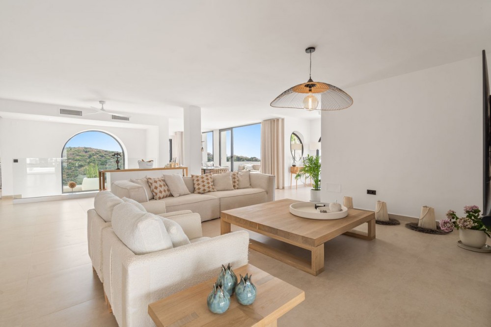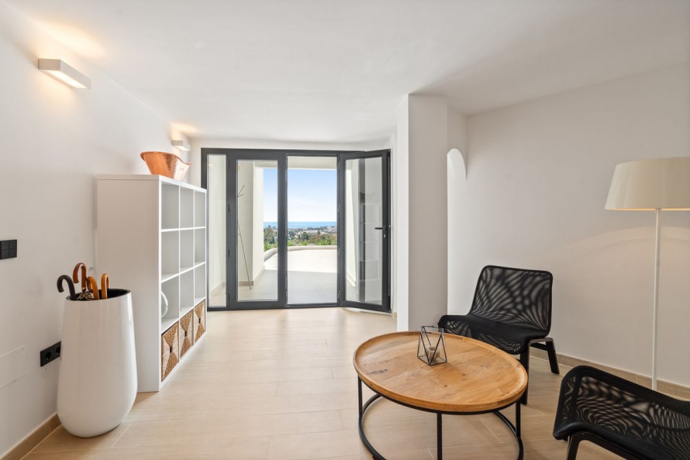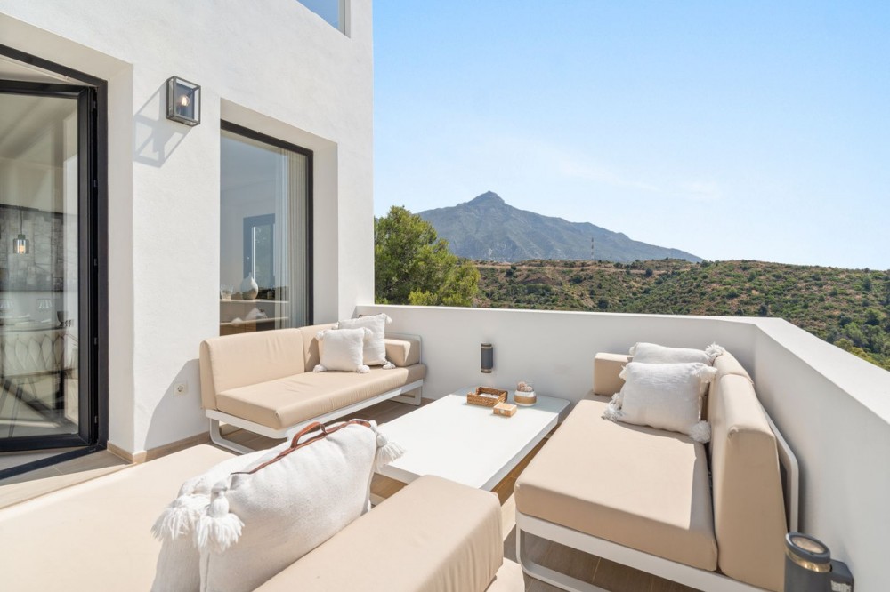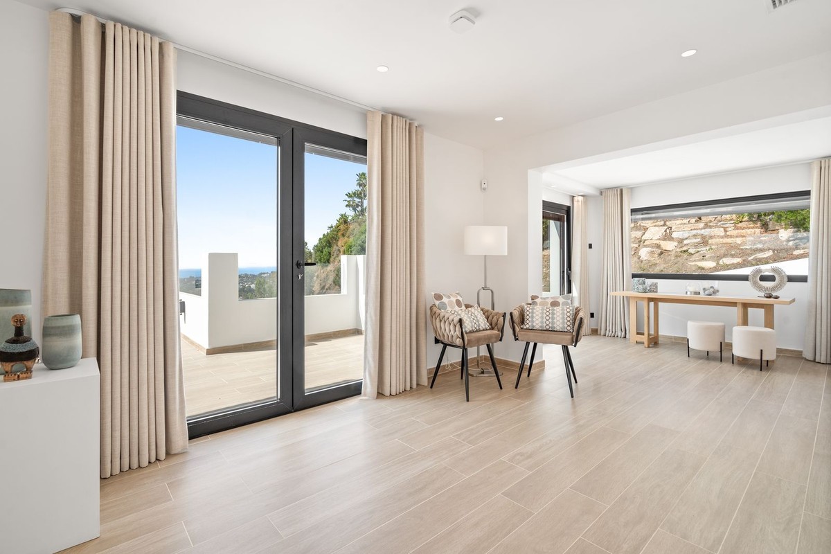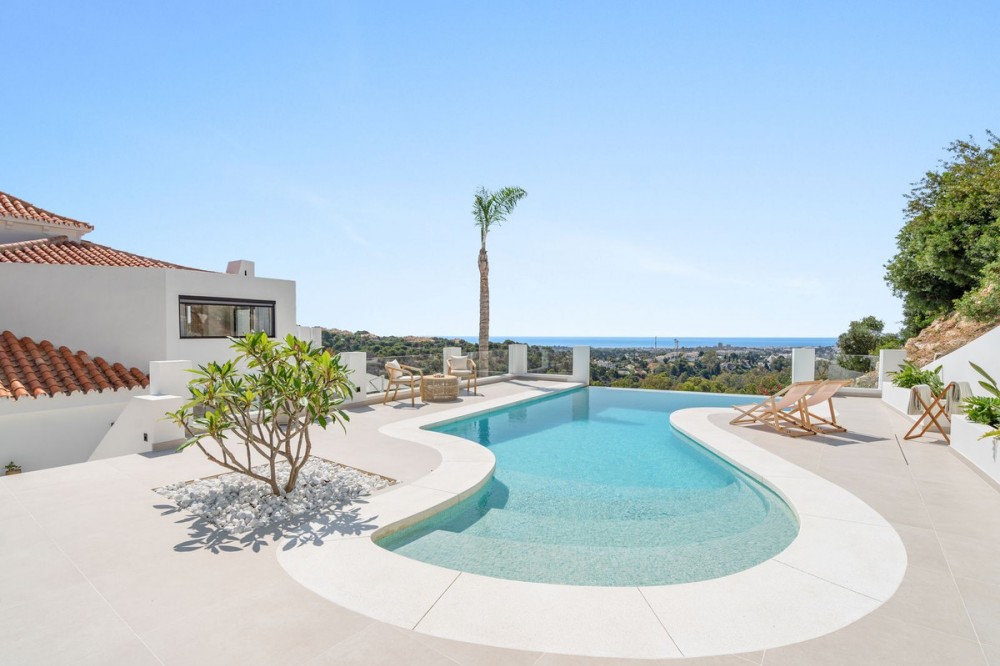 - Exclusive Villa with Panoramic Views in the Heart of Nueva Andalucía This majestic villa, nestled in the prestigious heart of Nueva Andalucía, embodies a lifestyle of unmatched elegance, comfort, and sophistication. With breathtaking views of Puerto Banús, the shimmering Mediterranean Sea, and the iconic La Concha mountain, this exceptional residence offers a panoramic setting that feels like a living postcard every day. The villa boasts five spacious bedrooms and five stylish bathrooms, thoughtfully designed to combine luxury, privacy, and openness. Upon arrival, a grand driveway welcomes you, offering space for three to five vehicles. To the side, a discreet storage area provides the perfect place for garden tools, bicycles, or sports equipment. A unique feature of this property is its two separate entrances. The first, located beside the storage area, leads into a versatile space ideal as a home office or playroom. From here, you access three en-suite bedrooms, each with its own charm. Two enjoy stunning views of the sea and mountains, while the third overlooks lush greenery and rolling hills – a true retreat for those seeking peace and tranquility. A stylish staircase connects to the main living area, where the living room, dining space, and kitchen flow together in an open, airy, and elegant ambiance. This floor also features a fourth bedroom with en-suite bathroom, which can conveniently serve as a guest toilet. The villa’s second access point is located on the opposite side of the plot. A charming exterior staircase leads to a beautifully appointed outdoor kitchen with a dining area – perfect for refined al fresco dinners under the stars. Here, you'll also find the main entrance and the spectacular infinity pool – a true architectural masterpiece with sweeping views over the sea, the mountains, and the vibrant Puerto Banús marina. Inside, the living area exudes understated grandeur, featuring a large dining table and expansive windows framing the horizon. The state-of-the-art open-plan kitchen is fully equipped with premium appliances, generous storage, and exquisite finishes to satisfy even the most discerning gourmet. The upper floor is entirely dedicated to the master suite – a sublime private sanctuary where luxury meets serenity. From the bed, enjoy uninterrupted views of the mountains and the sea. The suite includes a spacious walk-in wardrobe, a cozy lounge corner, and an elegant bathroom with a view of La Concha that makes every morning feel magical – a daily reminder of the extraordinary life this villa offers.