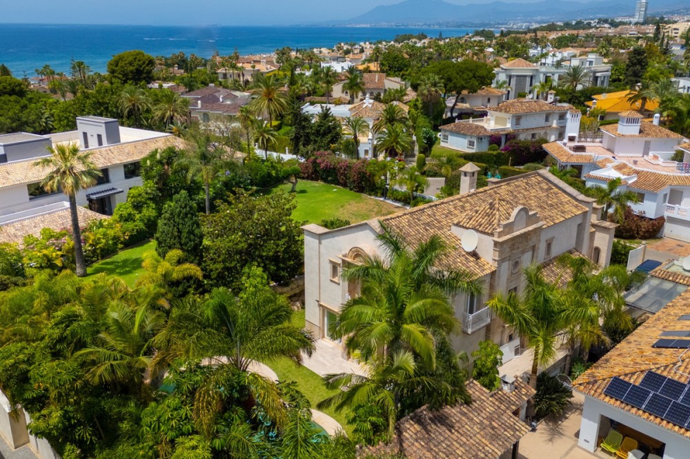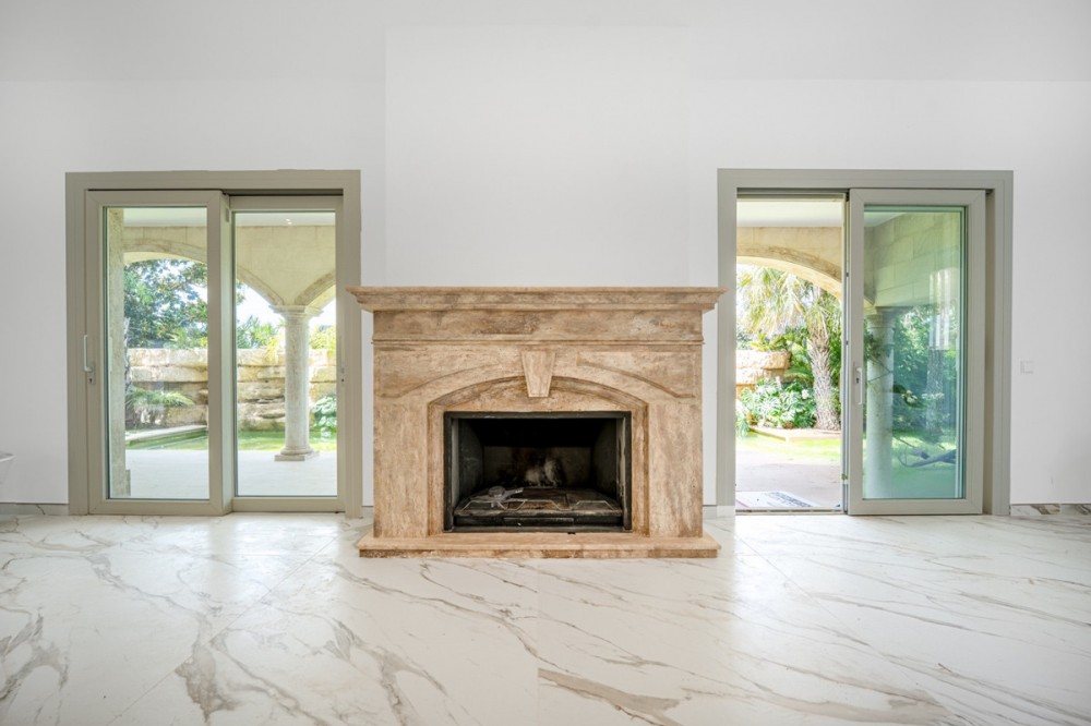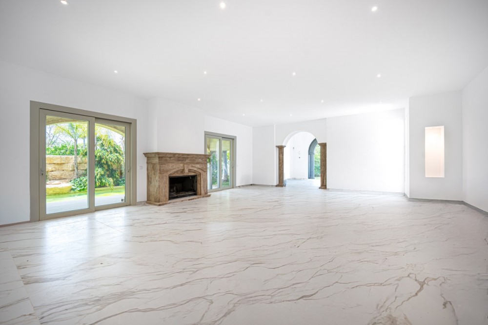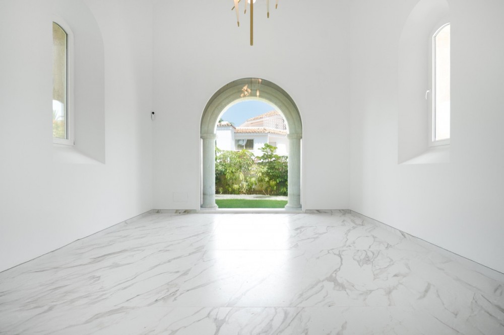 - Villa Roma is a stunning four-bedroom, four-bathroom home in the exclusive beachside area of Los Monteros, Marbella East. Just a short walk from the beach, this elegant villa sits on a 933m² plot and combines classic European design with modern coastal comfort. Spread across three levels, it offers generous living spaces, two en-suite bedrooms, and seamless indoor-outdoor flow, creating the perfect balance of style and practicality. Step inside through a grand entrance with elegant pillars and marble floors that set the tone for this exceptional home. The open-plan living room features a grand fireplace, while the upper level enjoys natural light from a domed ceiling and large windows. The master suite includes a walk-in dressing room, a Juliet balcony overlooking the pool, and a sense of calm and privacy. The lower level adds flexibility with space for a gym, cinema, or guest suite—ideal for modern living. Outside, Villa Roma offers a private haven surrounded by tall palm trees. The pool, with its four waterfalls, creates a peaceful, spa-like atmosphere, while a stone terrace with a wood-burning barbecue makes entertaining easy. A fishlake beside the terrace adds to the villa’s charm and serenity. Every detail of Villa Roma has been designed with care, making it a rare opportunity to own a truly timeless property just moments from Marbella’s finest beaches.