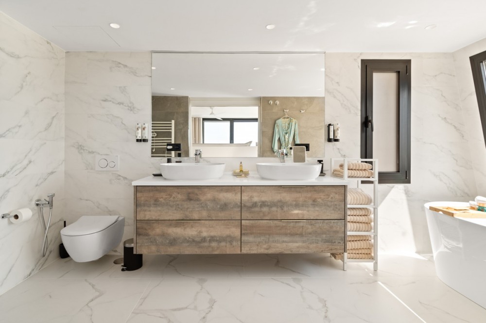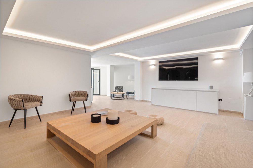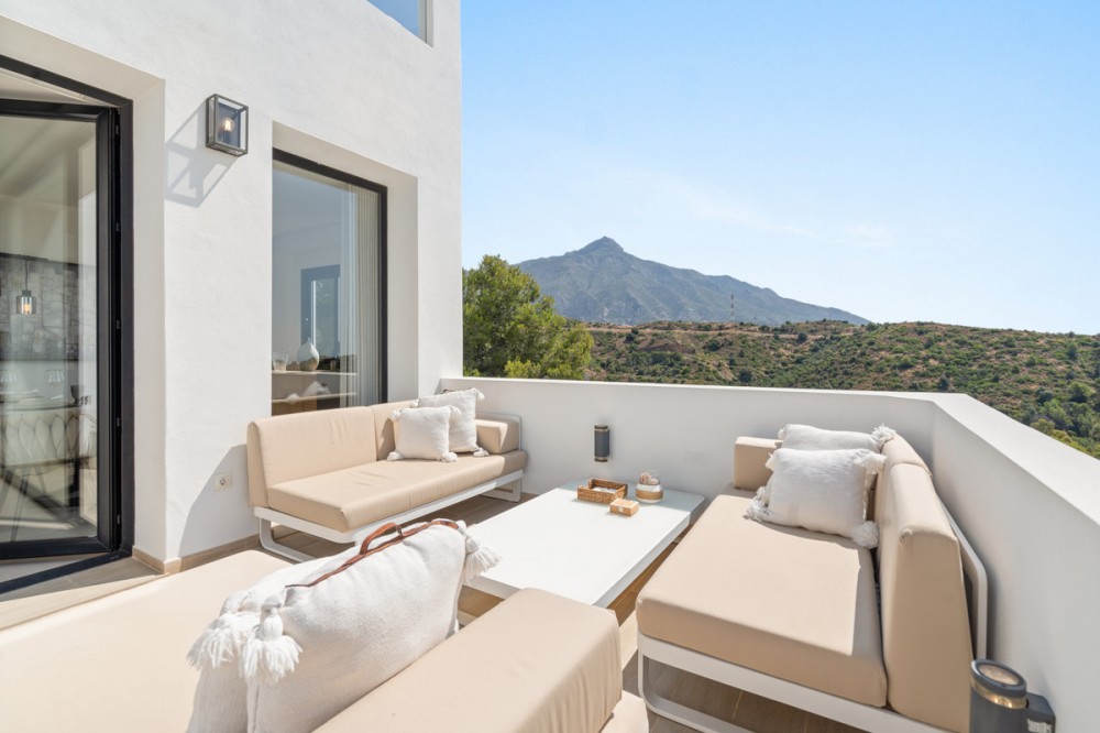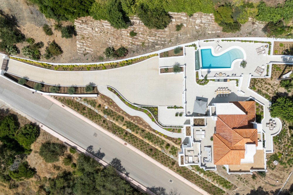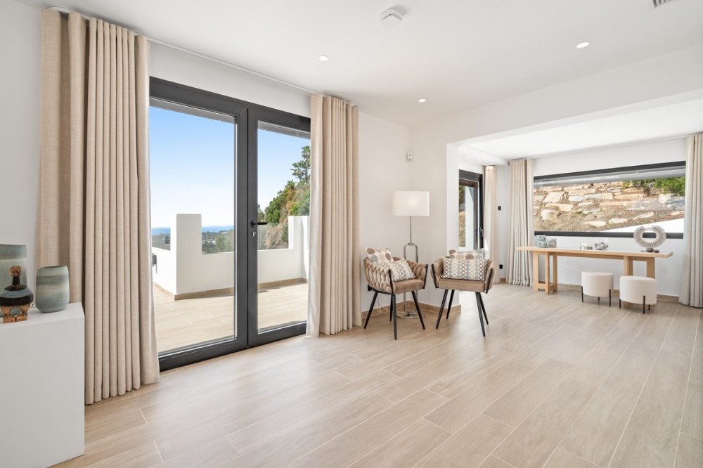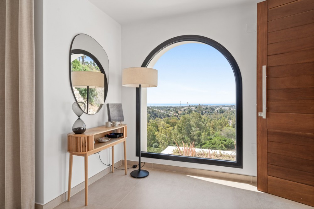 - Located in one of Marbella’s most sought-after residential areas, this five-bedroom, five-bathroom villa offers panoramic, frontal views of the Mediterranean Sea, La Concha mountain, and Puerto Banús. Positioned on a 1,950 m² plot, the property includes 444 m² of interior space and more than 300 m² of terraces, designed to highlight volume, light, and privacy. The architecture emphasizes clean lines and openness. Large windows in main living areas and bedrooms fill the home with natural light while capturing the sea and mountain views from multiple vantage points. Living and dining areas are arranged to establish visual clarity while connecting directly to the outdoor terraces. The kitchen features integrated appliances and minimalist cabinetry, blending functionality with a streamlined aesthetic. The primary suite includes a tailored dressing area, en-suite bathroom, and access to a private terrace with full southern exposure and uninterrupted views. The remaining bedrooms, each with en-suite bathrooms, are distributed to ensure privacy. Multi-level terraces offer shaded lounges, open-air dining, and an infinity-edge pool oriented toward the sea. The overall design maintains clear sightlines, with every space feeling connected to the natural setting. Exterior materials include natural stone and textured finishes that harmonize with the landscape. The terrace is carefully landscaped to preserve both open views and seclusion. Just minutes from international schools, renowned golf clubs, and the marina of Puerto Banús, this residence combines architectural simplicity with frontal views, natural light, and a private setting. Property Highlights •Panoramic frontal views of the Mediterranean Sea, La Concha mountain, and Puerto Banús •1,950 m² plot with 444 m² of interior living space and 300 m² of terraces •Five bedrooms, each with en-suite bathrooms •Large windows throughout providing natural light and visual connection to the surroundings •Open-plan living and dining areas with direct access to outdoor spaces •Infinity-edge pool oriented for unobstructed southern views •Multi-level terraces for outdoor dining, lounging, and entertaining •Natural stone and refined exterior finishes •Located minutes from international schools, golf clubs, and the Puerto Banús marina
