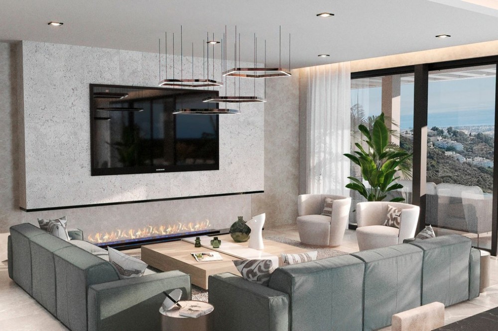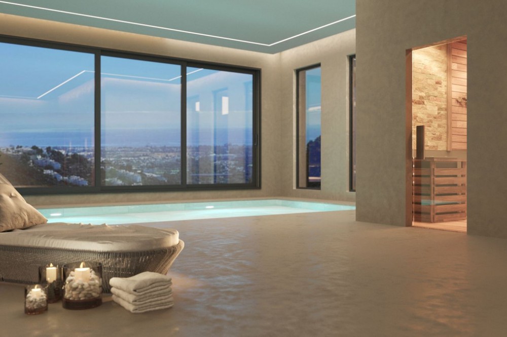 - Stunning contemporary villa located in the heart of Madroñal, Benahavis, with breathtaking panoramic sea views. This luxury 6 bedroom home is located within an exclusive gated community with 24 hour security. This property is spread over 3 levels. The lower floor has various areas: a spa, a fully equipped gym, a games room with a pool table, a bar and a spacious wine cellar. The spa is built using the latest micro-cementation technology and consists of an indoor, heated pool, a Finnish sauna and a Turkish bath. The interior design of the villa consists of two glass cubes, allowing for additional open space where you will find a beautiful olive tree and can enjoy smoking shisha. Thanks to floor-to-ceiling windows, the villa is very bright and filled with natural light. These windows not only flood the interior with sunshine but also feature sun protection, ensuring a comfortable and ambient atmosphere year-round. As you step outside, a large terrace boasts panoramic sea views. Here, you'll find an infinity, panoramic pool built of Indonesian stone, known for its water purifying properties. Sunbeds, a spacious dining table, a chic chill-out area create the perfect place for basking in the Mediterranean sun. The master bedroom features two en-suite bathrooms and two separate dressing areas, ensuring the utmost in convenience and comfort. A staff room and a laundry area provide added functionality to this already impeccable residence. For car enthusiasts, the villa has a private garage with ample space for four vehicles. Plus, in just two years, a new road will connect Madroñal directly with Real de la Quinta and Nueva Andalucia, enhancing accessibility and convenience for residents. In this villa, you'll discover a harmonious blend of modern design, luxurious amenities, and breathtaking, panoramic sea views, creating an extraordinary living experience in Madroñal, Benahavis. The villa will be sold fully furnished and ready to move in.
