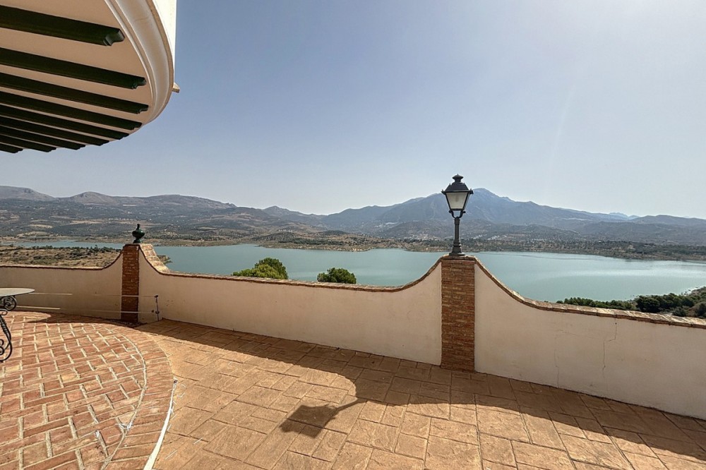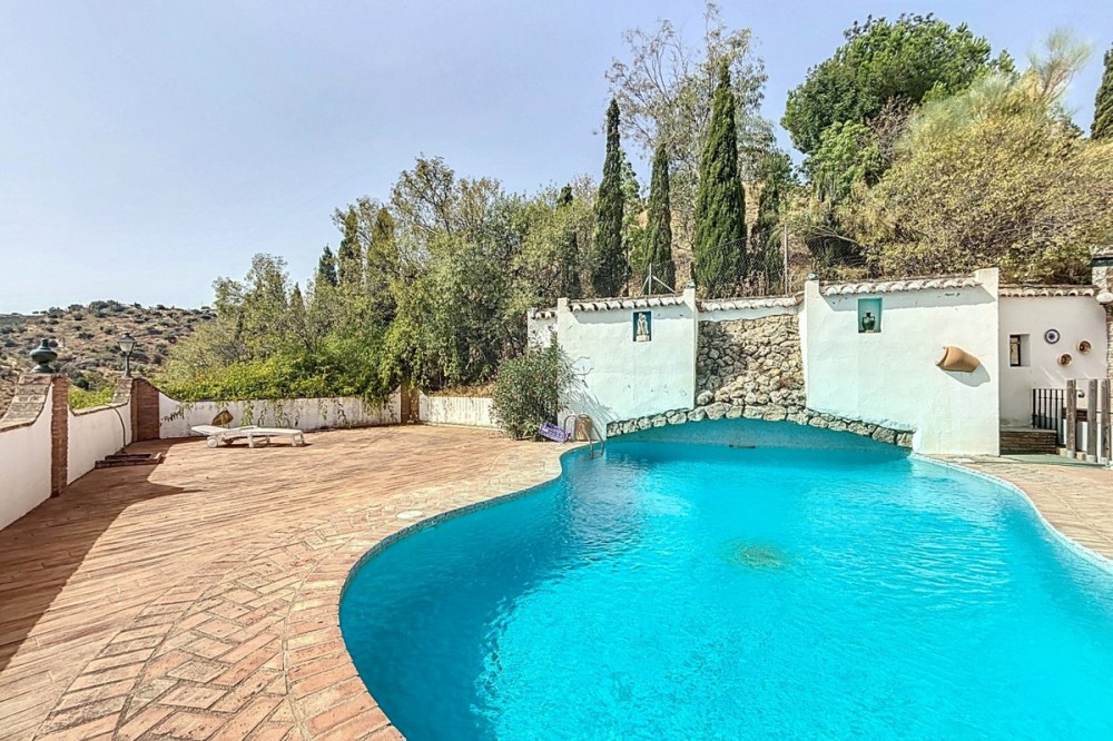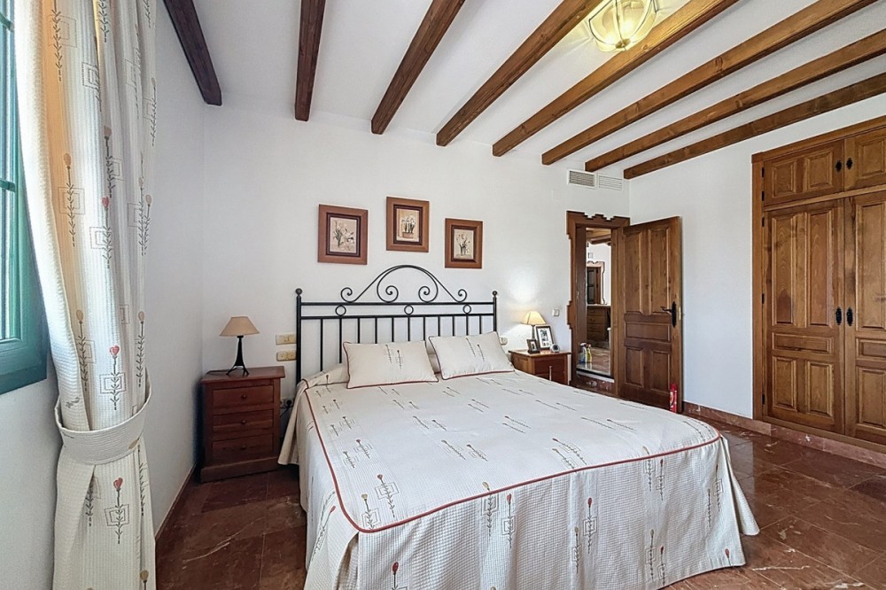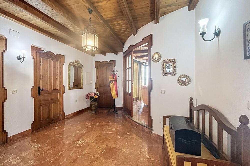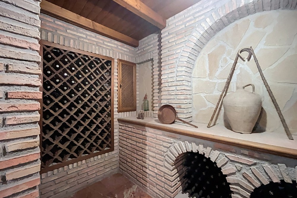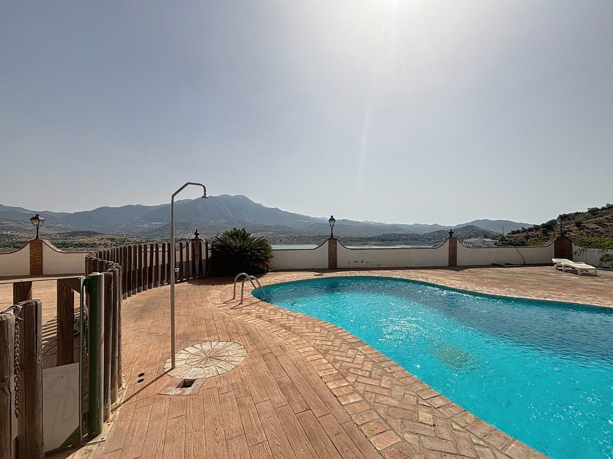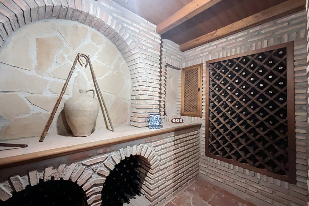 - This charming villa in Los Romanes, Málaga, perfectly combines traditional Spanish architecture with modern comfort. The main house features 4 bedrooms, including a spacious master suite, 3 full bathrooms, a guest toilet, a laundry room, and a wine cellar in the basementideal for wine lovers. The living areas are characterized by wooden beam ceilings that add warmth and character. The main living room stands out with its striking sun-patterned wooden ceiling and a large wrought-iron chandelier. A fireplace and comfortable furnishings create a cozy atmosphere. Large windows and French doors flood the space with natural light and offer beautiful views of Lake Viñuela and the surrounding nature. The property also includes a separate guest apartment with 2 bedrooms, a bathroom, and a cozy open-plan living-dining area with a kitchenideal for visitors or additional accommodation. Outside, the villa boasts a large plot with a private pool, an outdoor kitchen with barbecue, a covered terrace, a pavilion, two garages, and two storage rooms with the potential to be converted into another apartment. Additionally, the property has its own well and a water cistern in one of the garages, ensuring a reliable water supply year-round. We are pleased to be able to present this dream property to you soon, either personally or via virtual viewing. Because this world is unique - just like our Axarquía. In Andalusia. On the Costa del Sol. Here, on the sunny side of life...