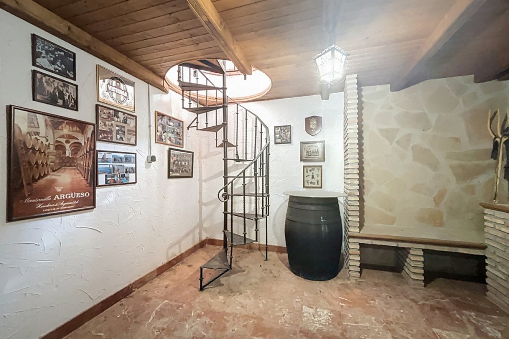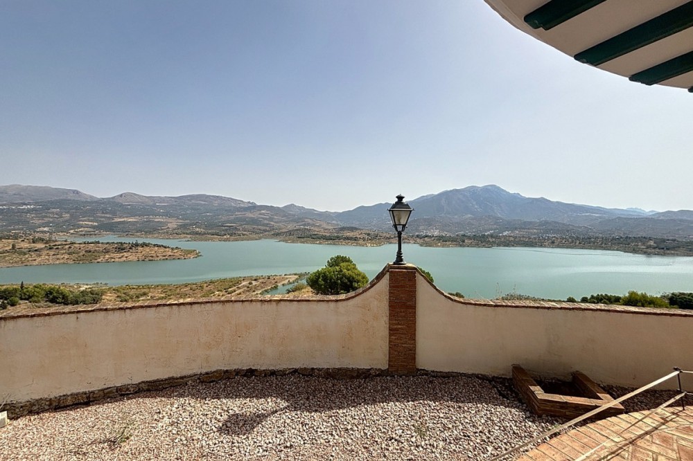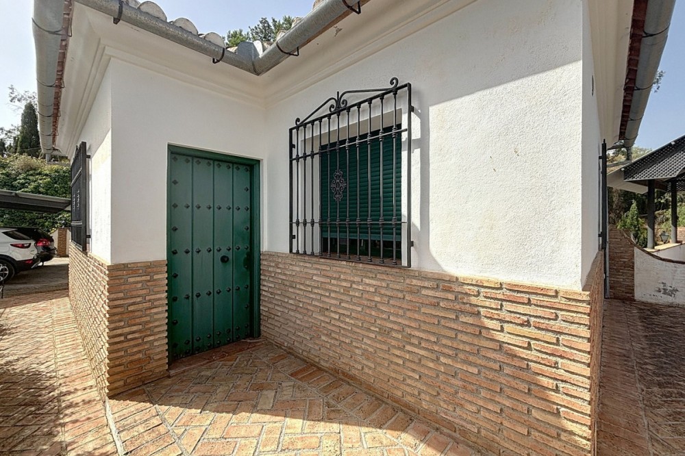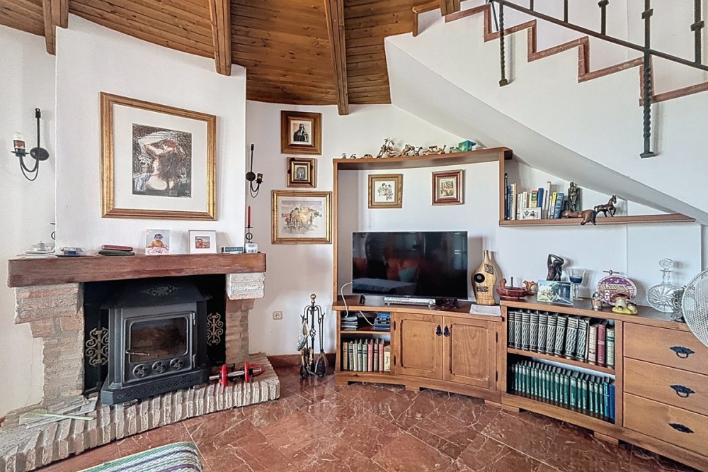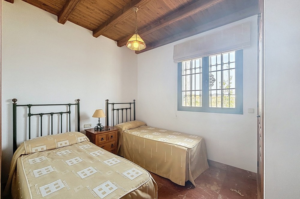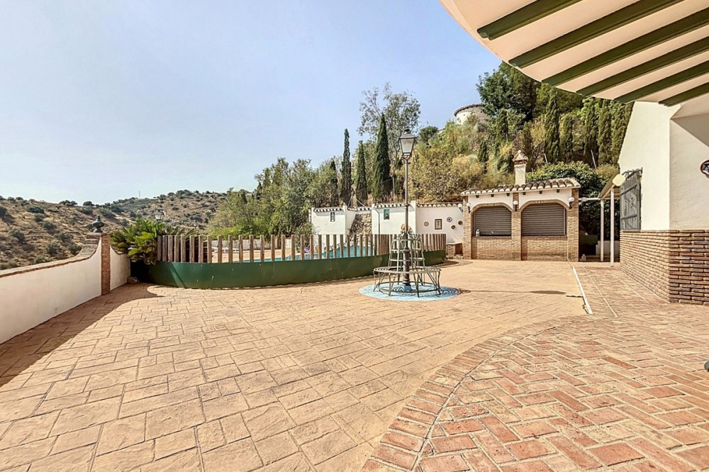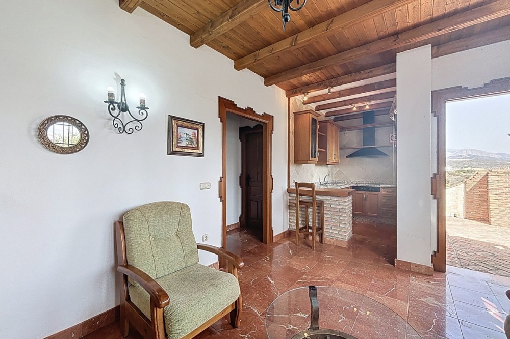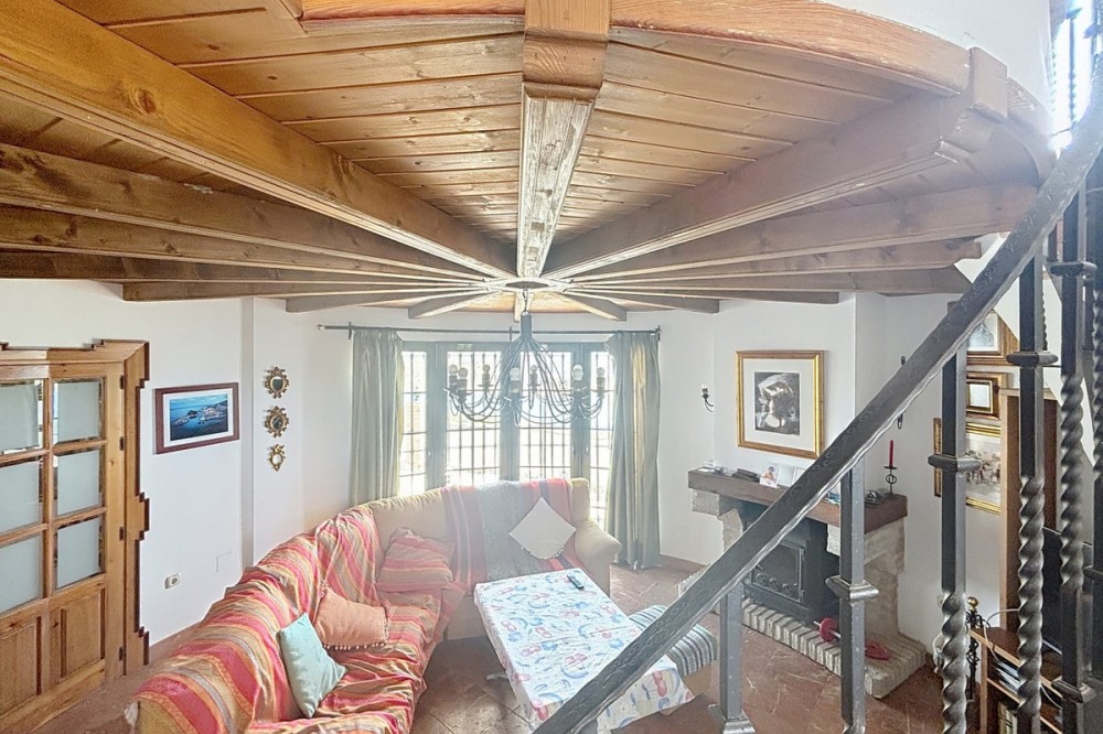 - This charming villa in Los Romanes, Málaga, perfectly combines traditional Spanish architecture with modern comfort. The main house features 4 bedrooms, including a spacious master suite, 3 full bathrooms, a guest toilet, a laundry room, and a wine cellar in the basementideal for wine lovers. The living areas are characterized by wooden beam ceilings that add warmth and character. The main living room stands out with its striking sun-patterned wooden ceiling and a large wrought-iron chandelier. A fireplace and comfortable furnishings create a cozy atmosphere. Large windows and French doors flood the space with natural light and offer beautiful views of Lake Viñuela and the surrounding nature. The property also includes a separate guest apartment with 2 bedrooms, a bathroom, and a cozy open-plan living-dining area with a kitchenideal for visitors or additional accommodation. Outside, the villa boasts a large plot with a private pool, an outdoor kitchen with barbecue, a covered terrace, a pavilion, two garages, and two storage rooms with the potential to be converted into another apartment. Additionally, the property has its own well and a water cistern in one of the garages, ensuring a reliable water supply year-round. We are pleased to be able to present this dream property to you soon, either personally or via virtual viewing. Because this world is unique - just like our Axarquía. In Andalusia. On the Costa del Sol. Here, on the sunny side of life...