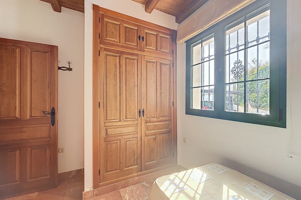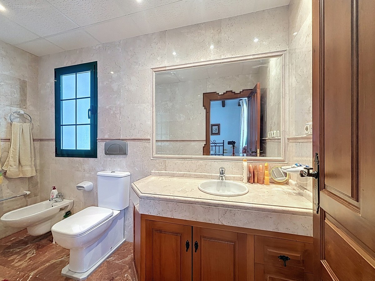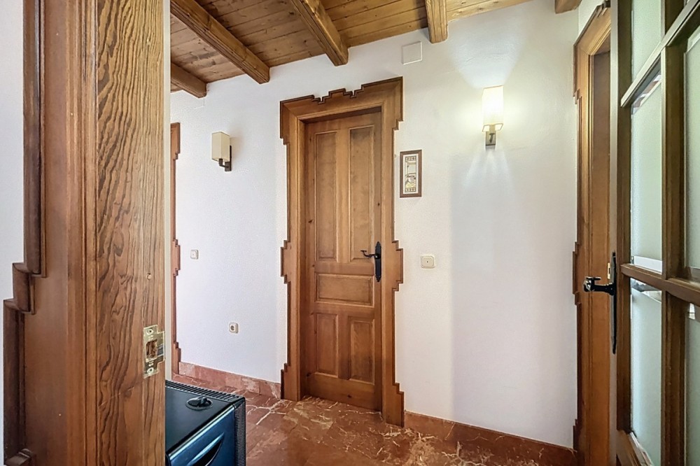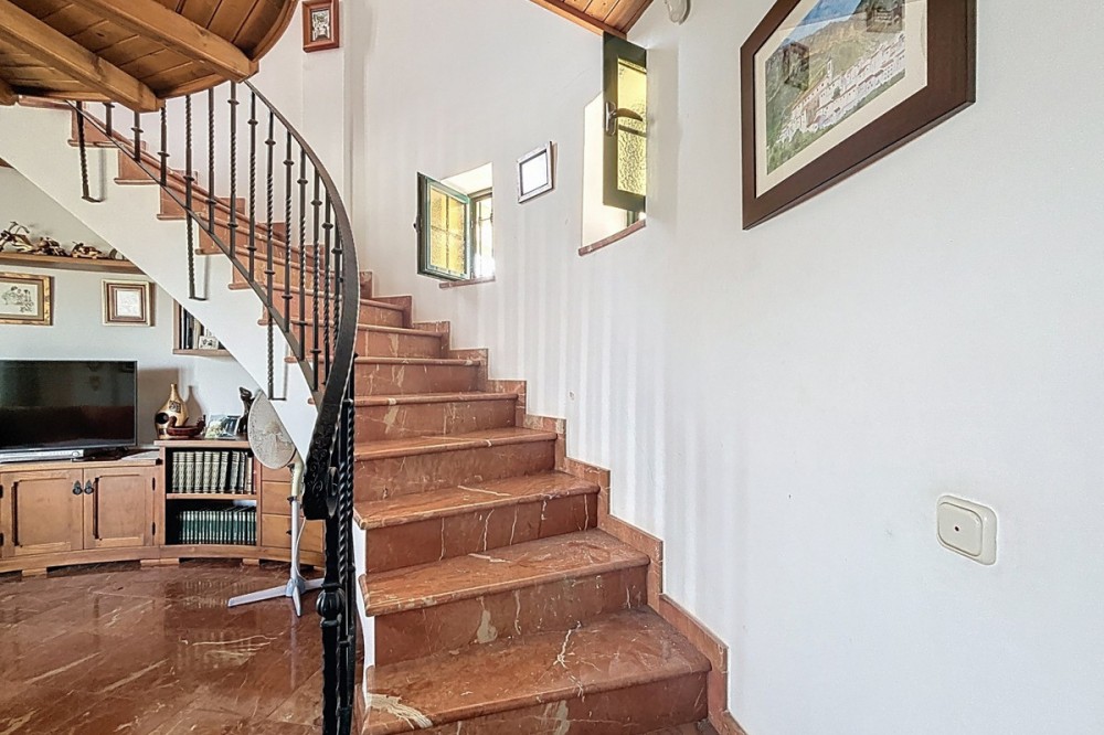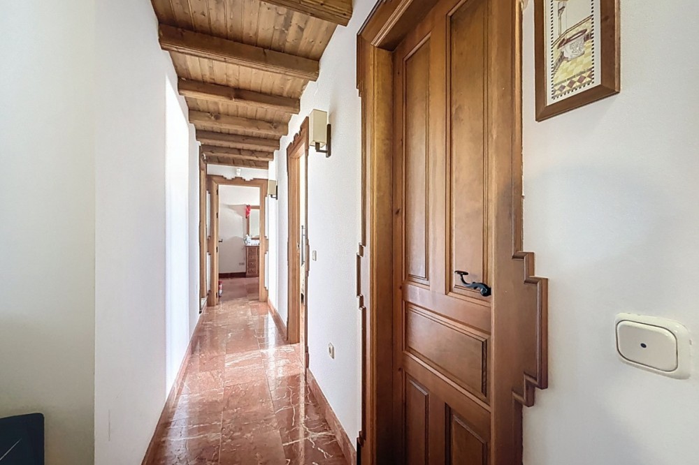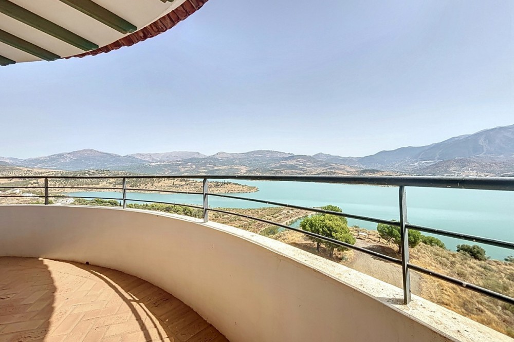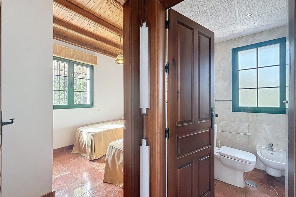 - This charming villa in Los Romanes, Málaga, perfectly combines traditional Spanish architecture with modern comfort. The main house features 4 bedrooms, including a spacious master suite, 3 full bathrooms, a guest toilet, a laundry room, and a wine cellar in the basementideal for wine lovers. The living areas are characterized by wooden beam ceilings that add warmth and character. The main living room stands out with its striking sun-patterned wooden ceiling and a large wrought-iron chandelier. A fireplace and comfortable furnishings create a cozy atmosphere. Large windows and French doors flood the space with natural light and offer beautiful views of Lake Viñuela and the surrounding nature. The property also includes a separate guest apartment with 2 bedrooms, a bathroom, and a cozy open-plan living-dining area with a kitchenideal for visitors or additional accommodation. Outside, the villa boasts a large plot with a private pool, an outdoor kitchen with barbecue, a covered terrace, a pavilion, two garages, and two storage rooms with the potential to be converted into another apartment. Additionally, the property has its own well and a water cistern in one of the garages, ensuring a reliable water supply year-round. We are pleased to be able to present this dream property to you soon, either personally or via virtual viewing. Because this world is unique - just like our Axarquía. In Andalusia. On the Costa del Sol. Here, on the sunny side of life...